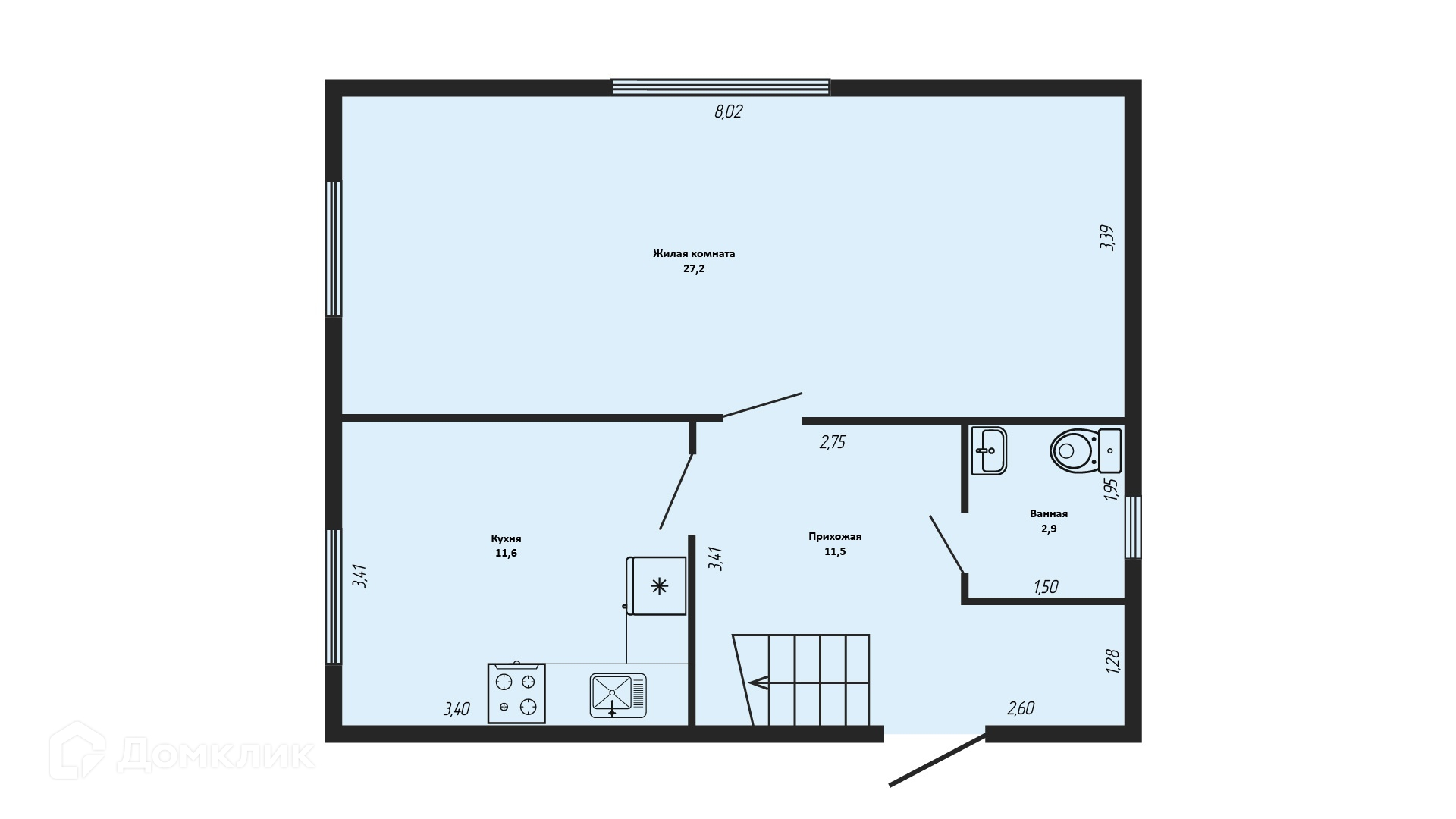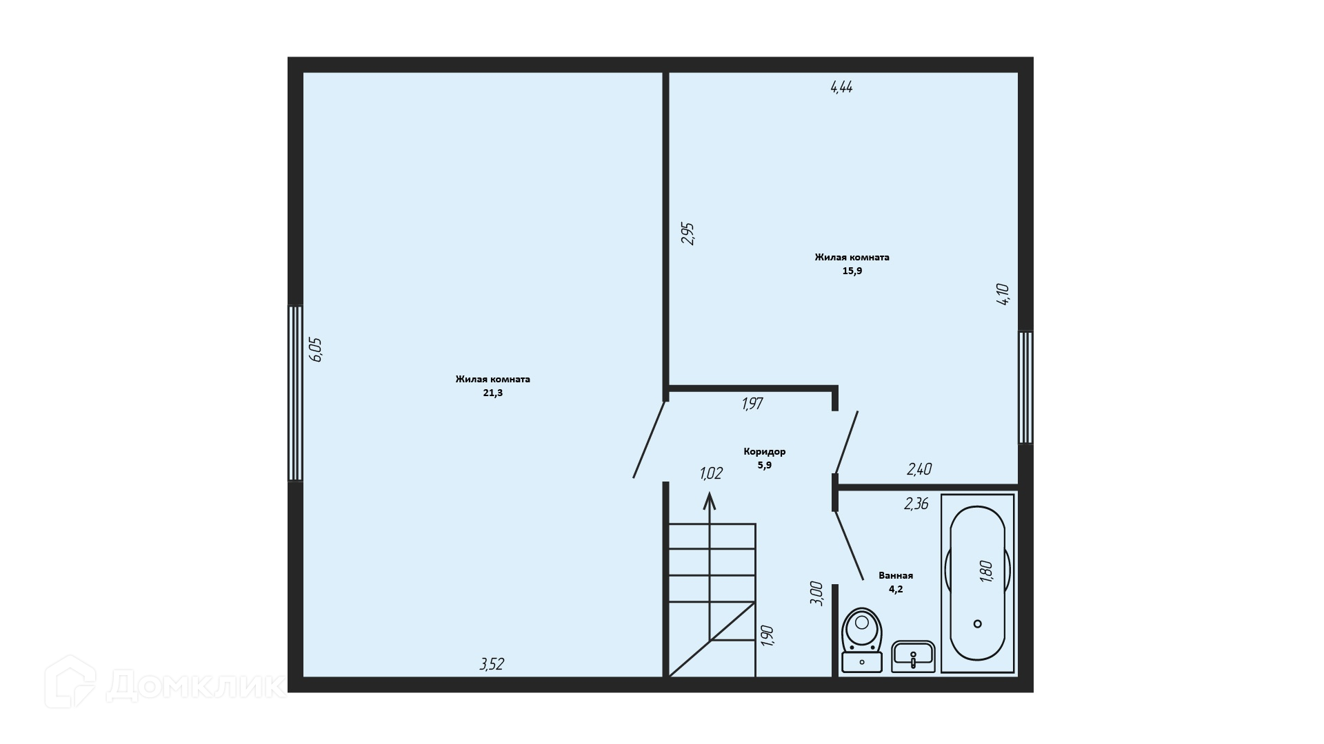 На 1 этаже просторная кухня-гостиная (27,2 м2) , комната и с/у. На 2 этаже 2 комнаты 21,3 и 15,9 м2 и с/у.