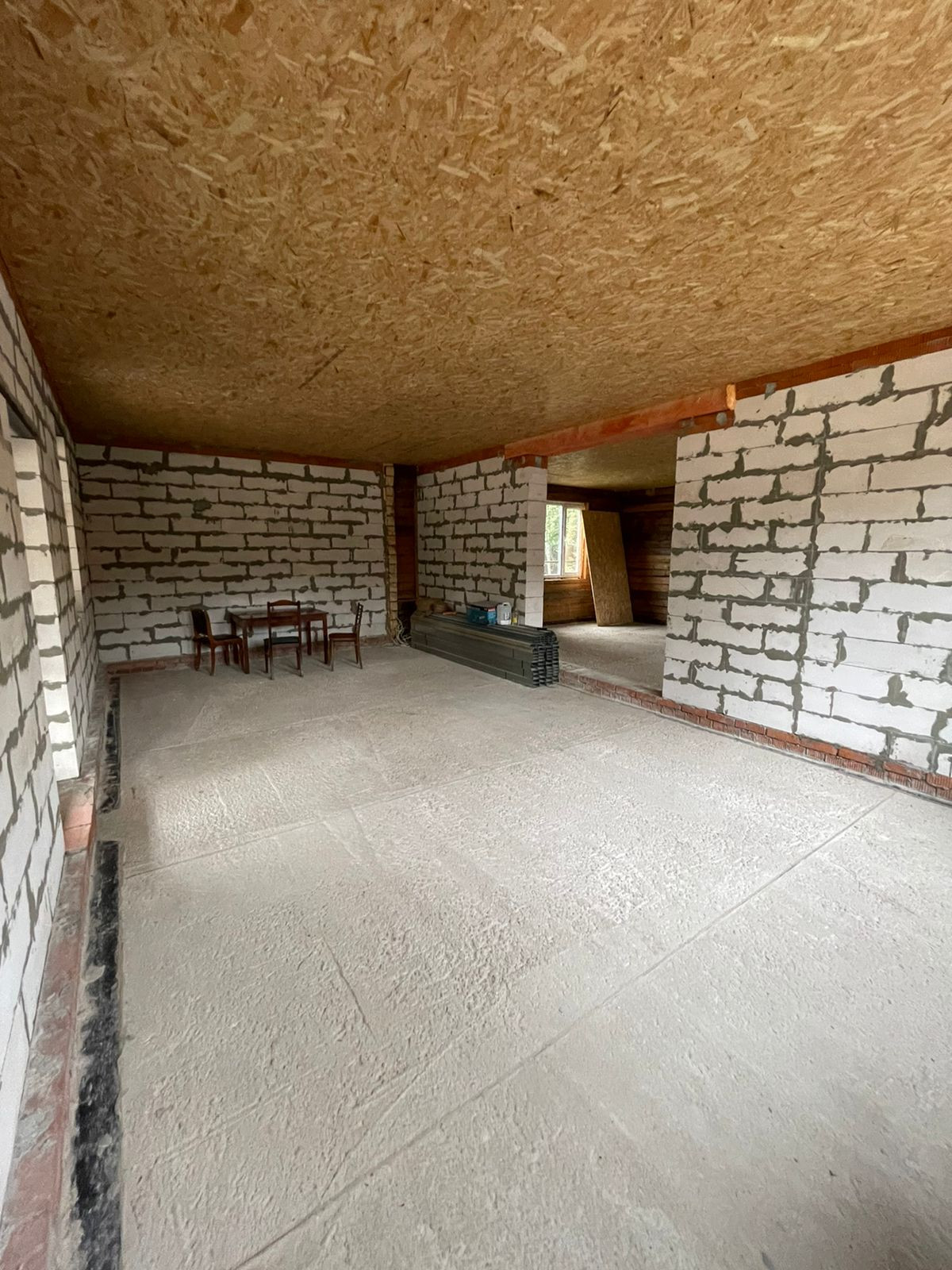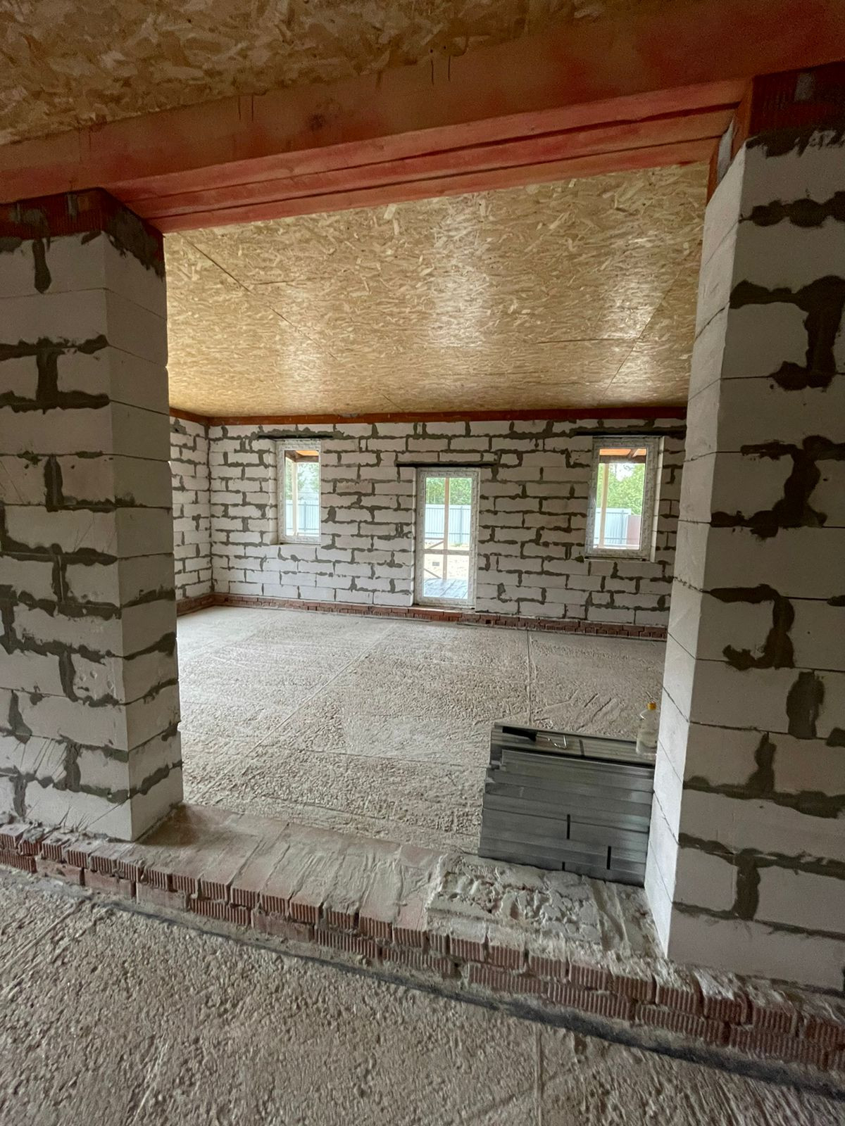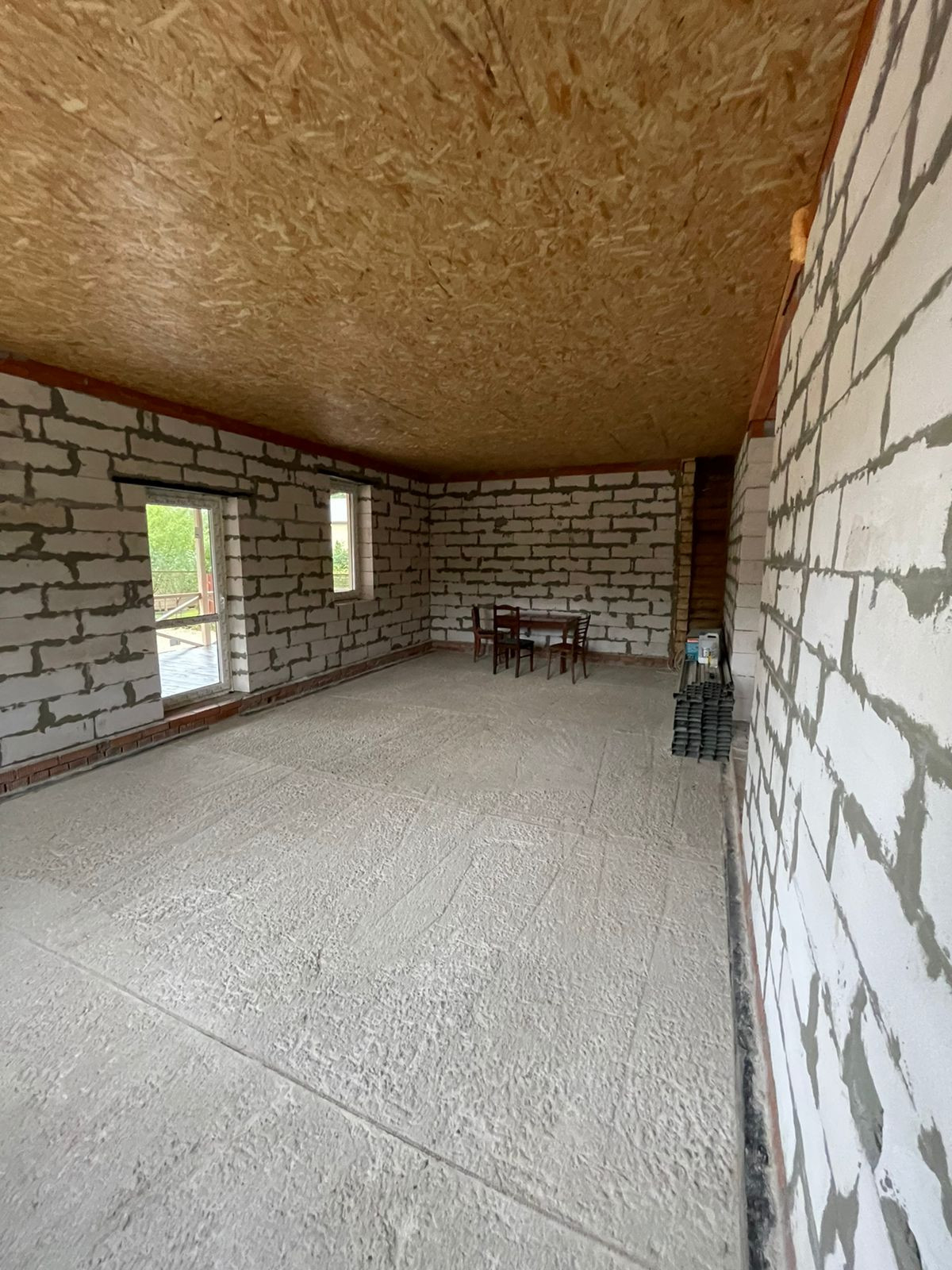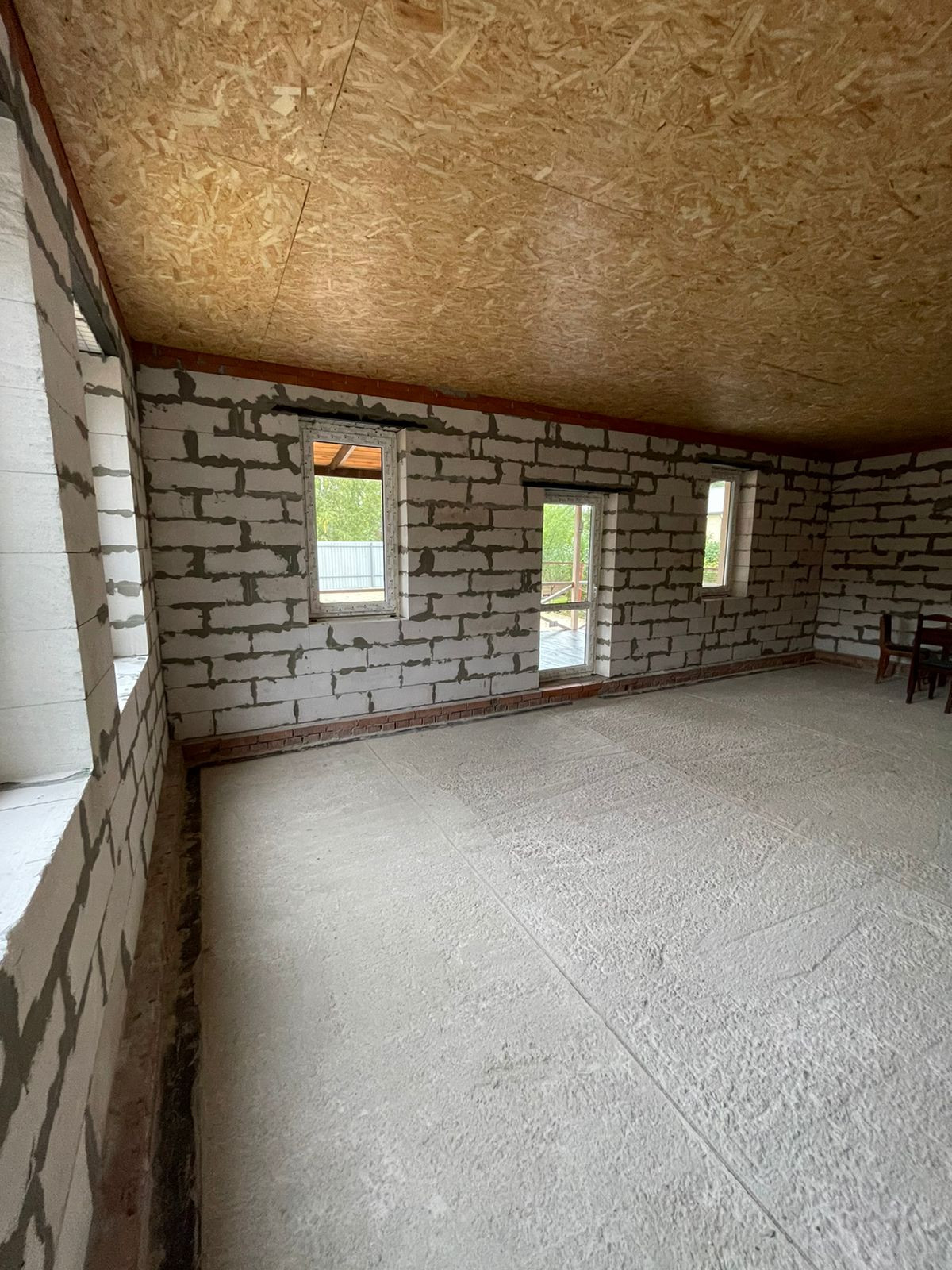 Установлен забор по периметру, скважина 35 метров( труба заведена в дом), канализационная труба выведена из дома,предчистовые потолки и полы сделаны и утеплены.