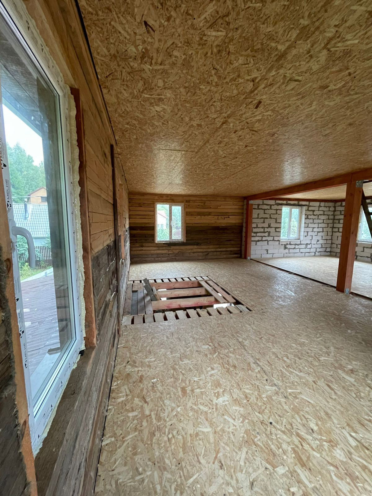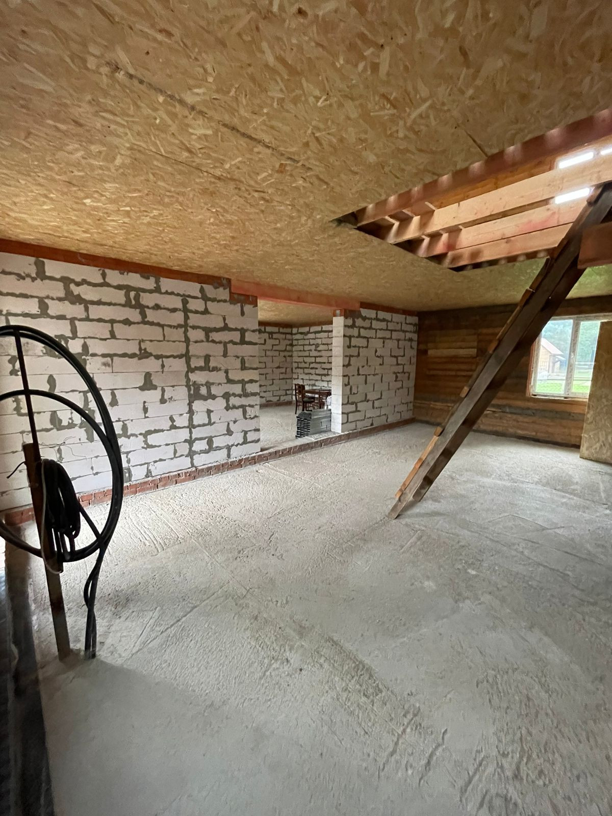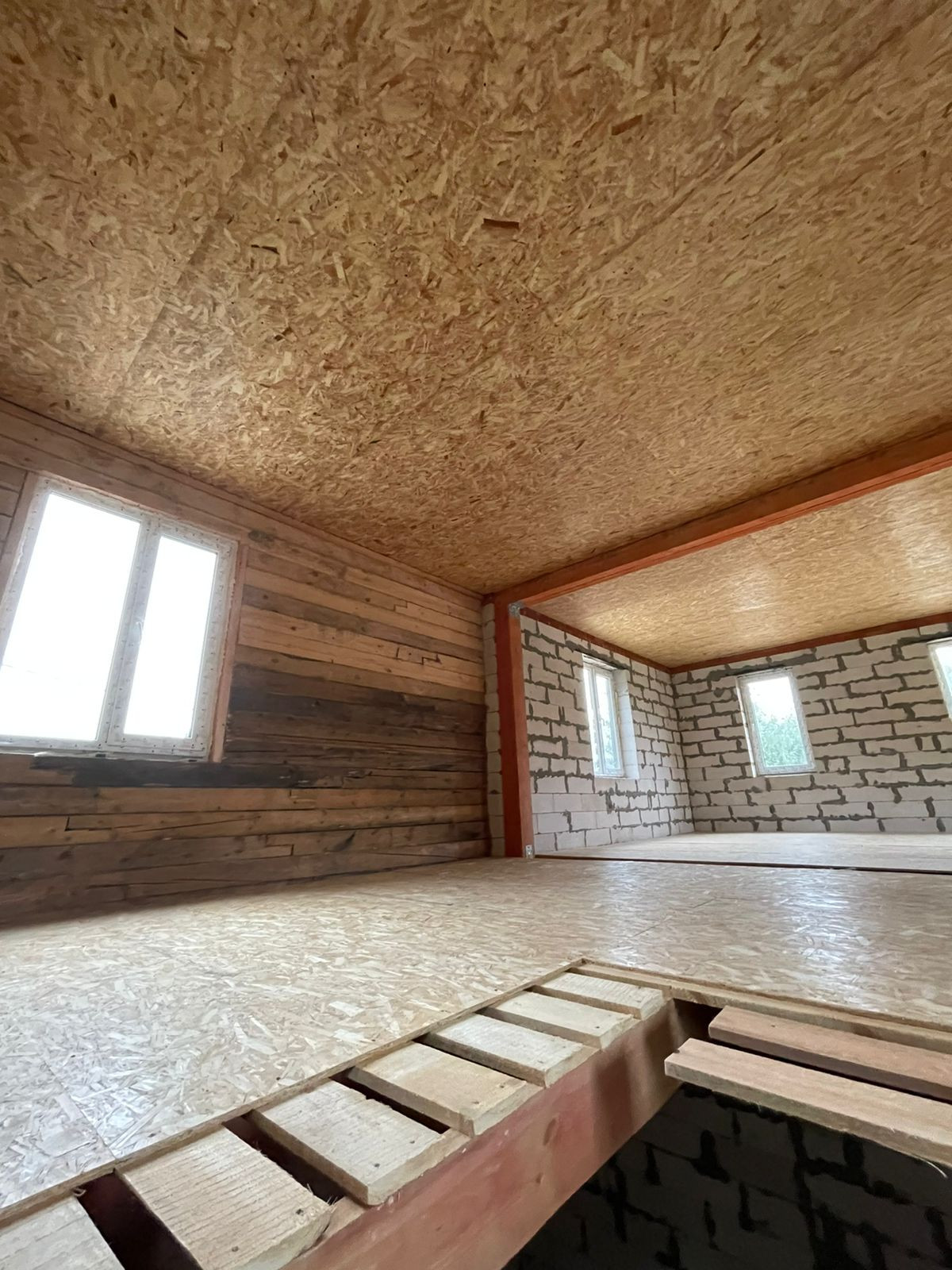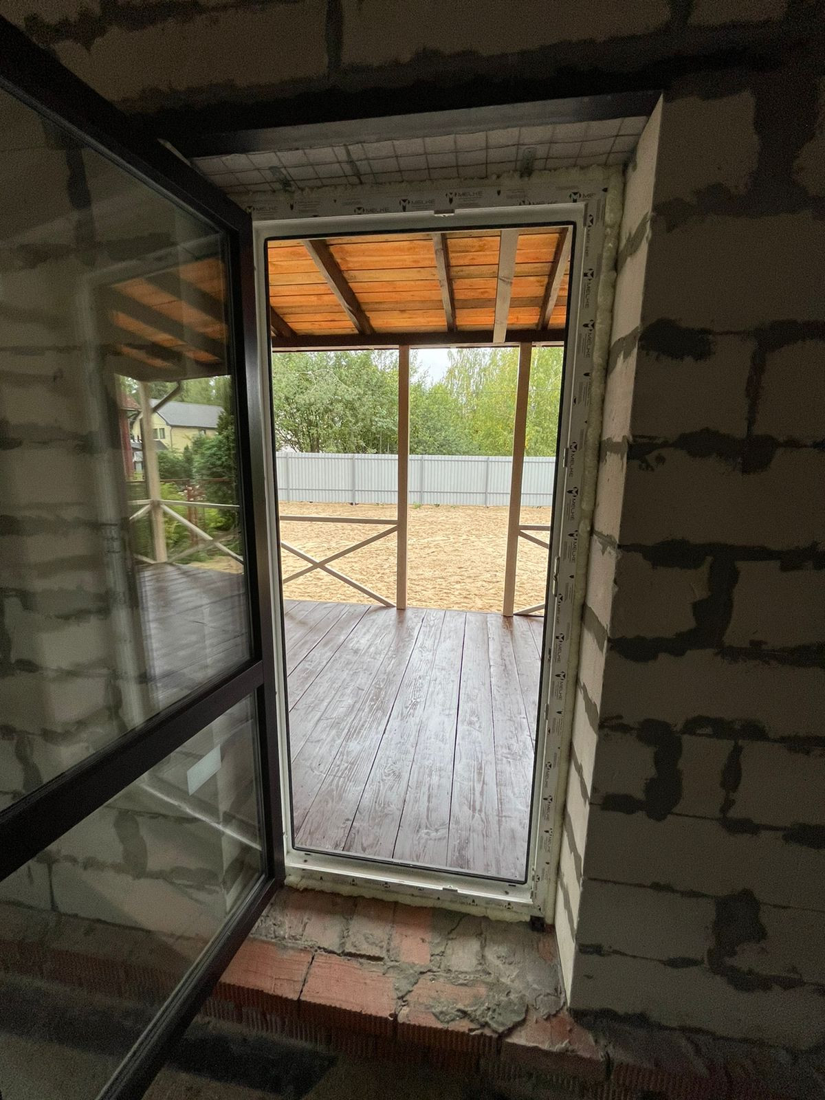 Установлен забор по периметру, скважина 35 метров( труба заведена в дом), канализационная труба выведена из дома,предчистовые потолки и полы сделаны и утеплены.