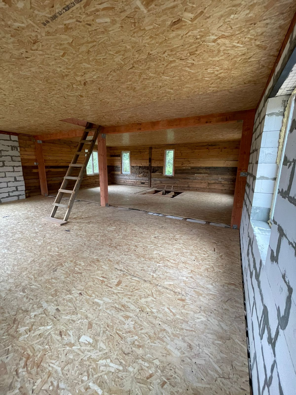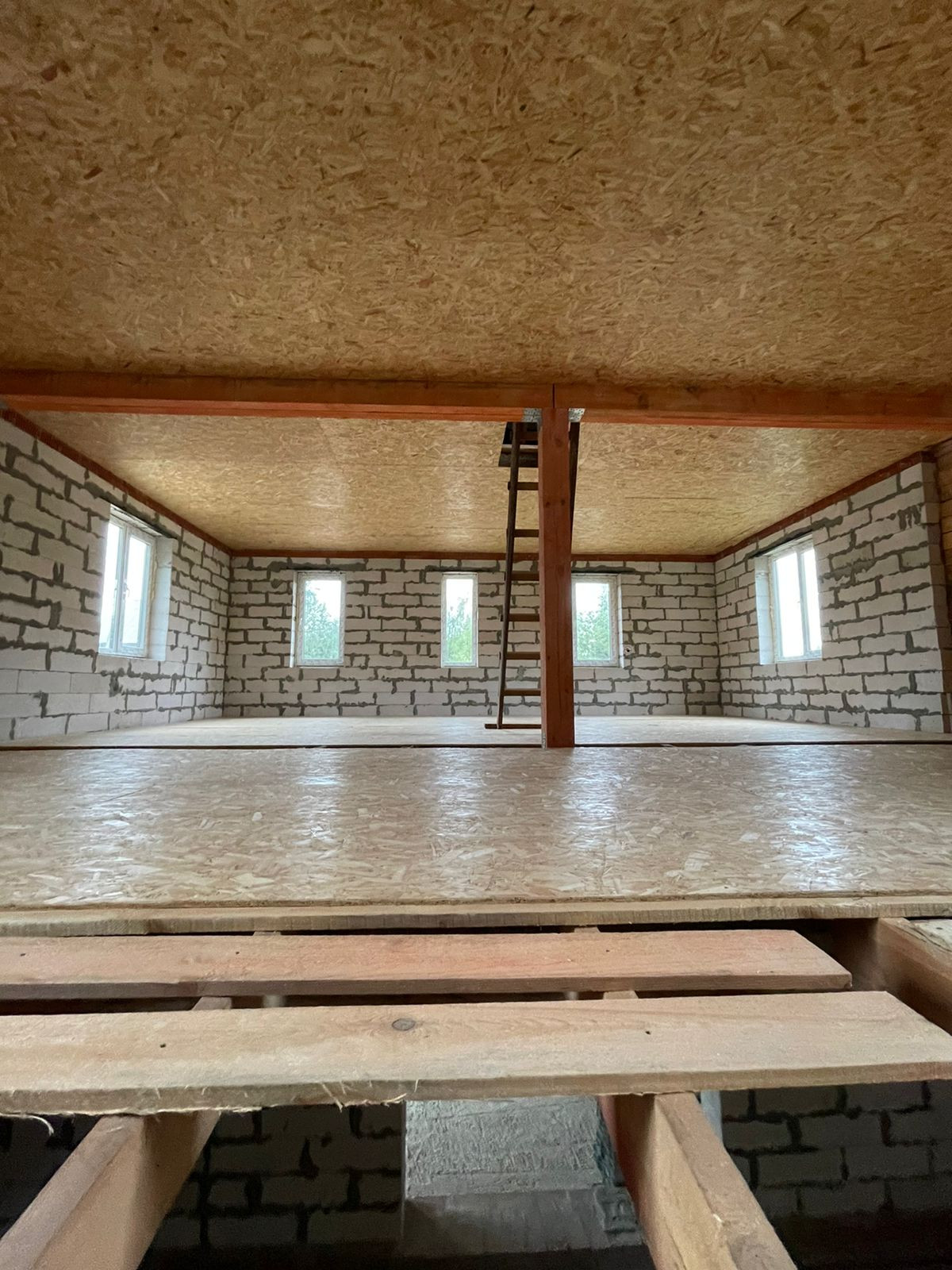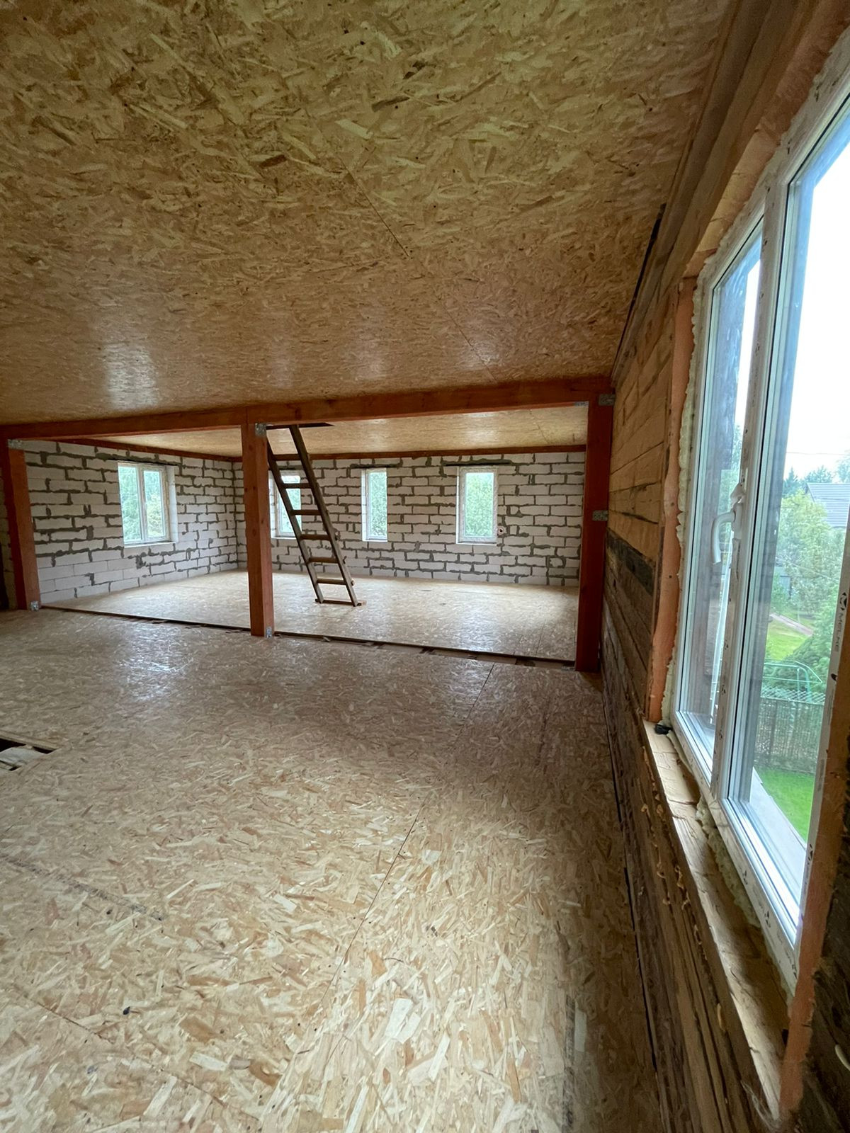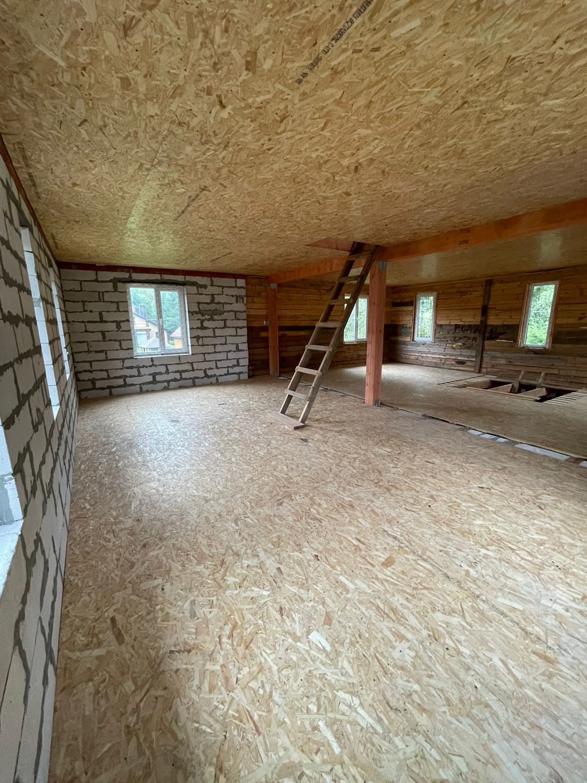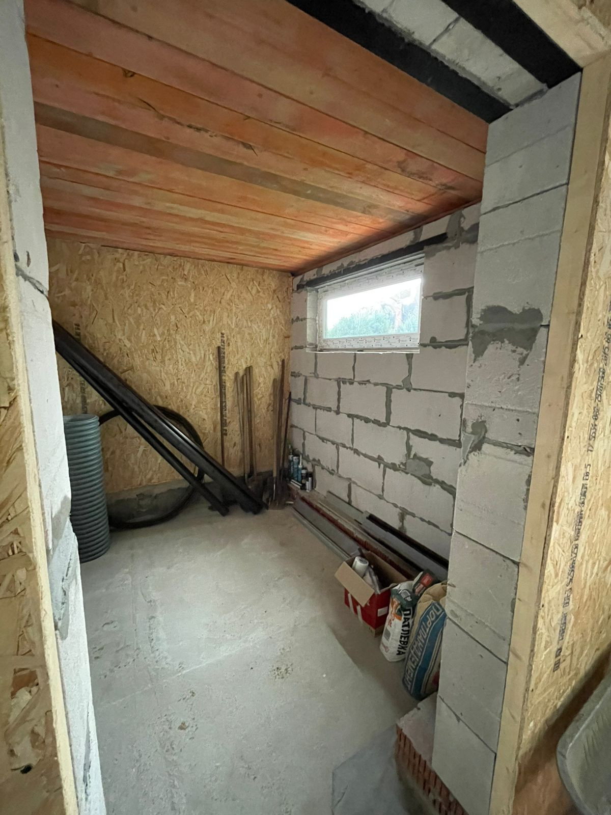 Установлен забор по периметру, скважина 35 метров( труба заведена в дом), канализационная труба выведена из дома,предчистовые потолки и полы сделаны и утеплены.
