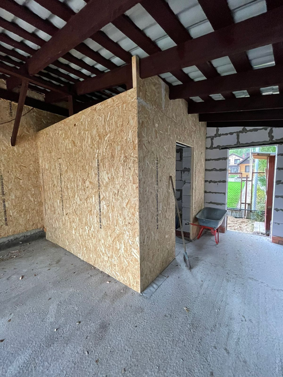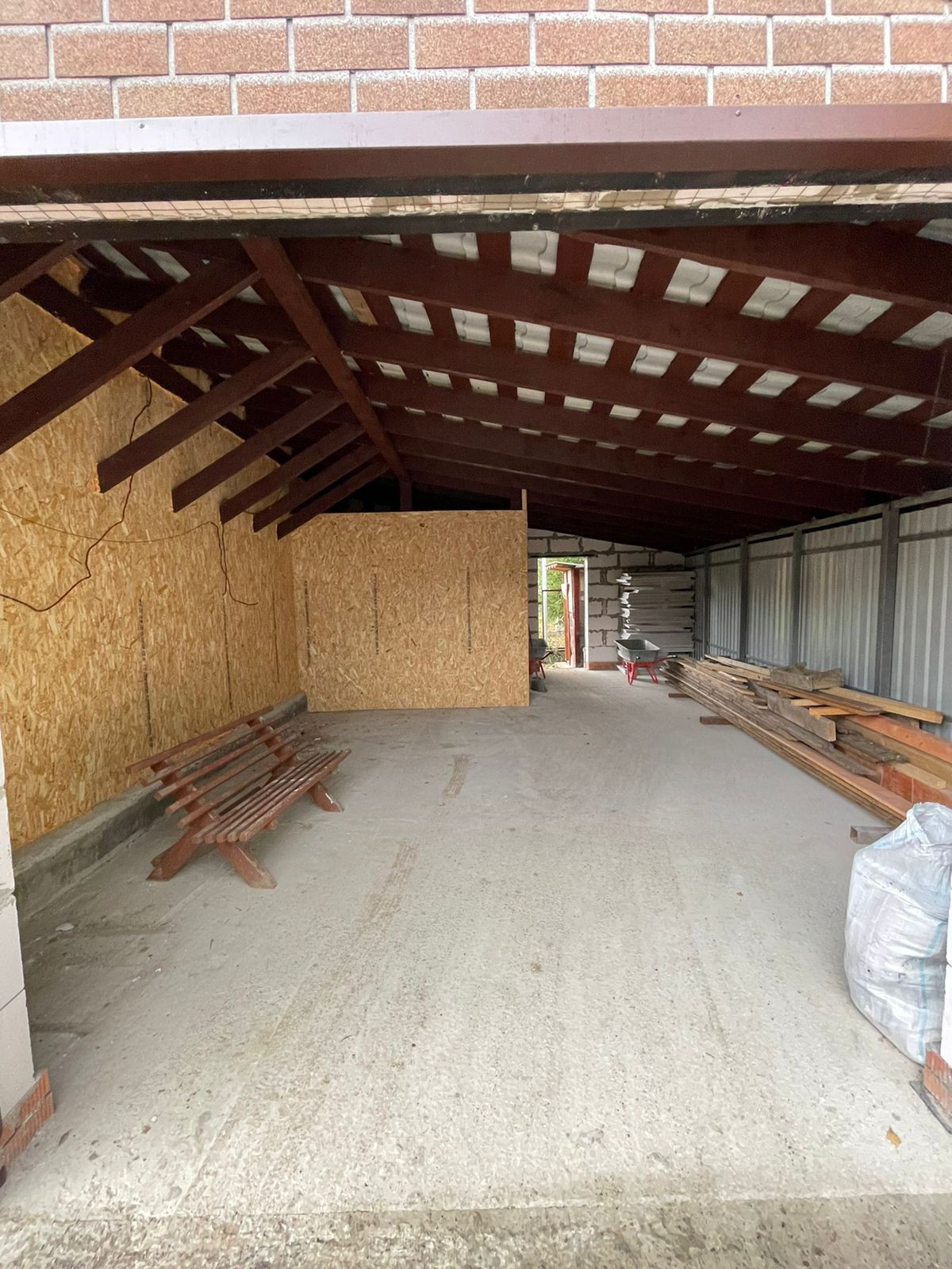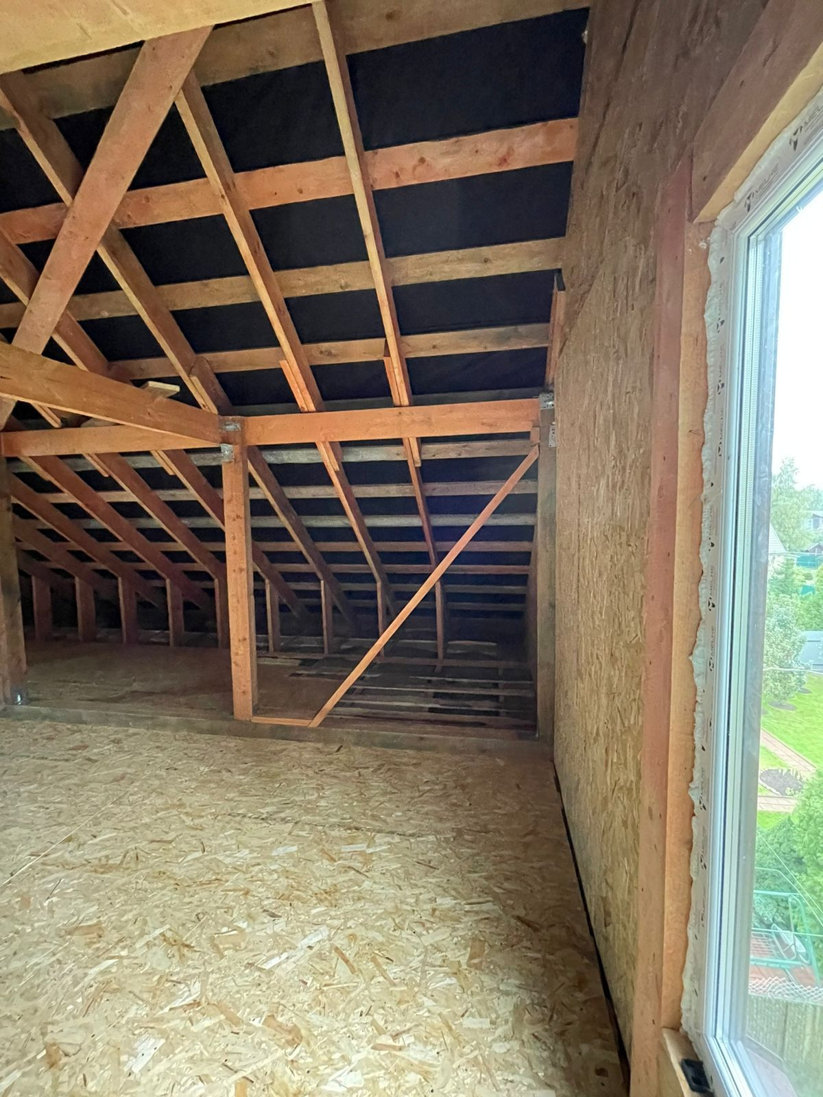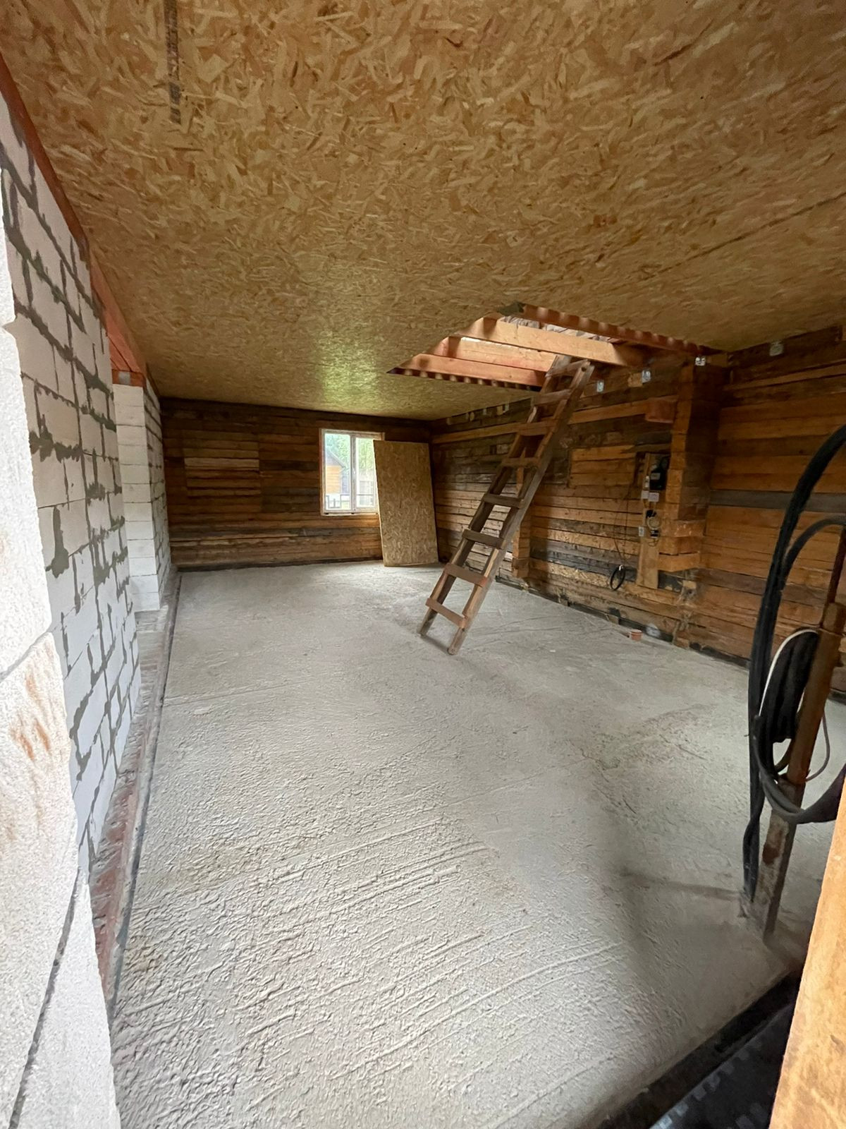 Установлен забор по периметру, скважина 35 метров( труба заведена в дом), канализационная труба выведена из дома,предчистовые потолки и полы сделаны и утеплены.
