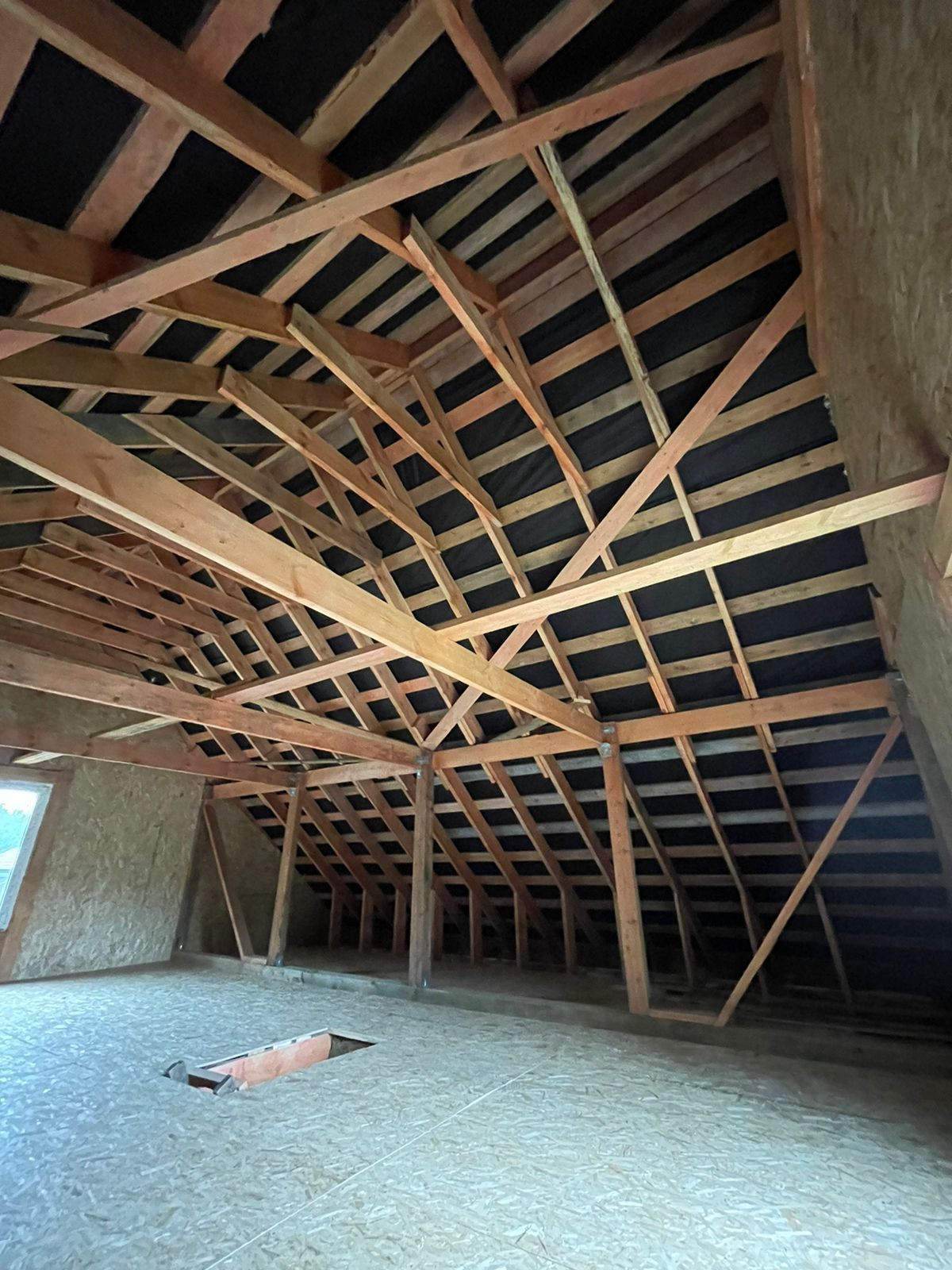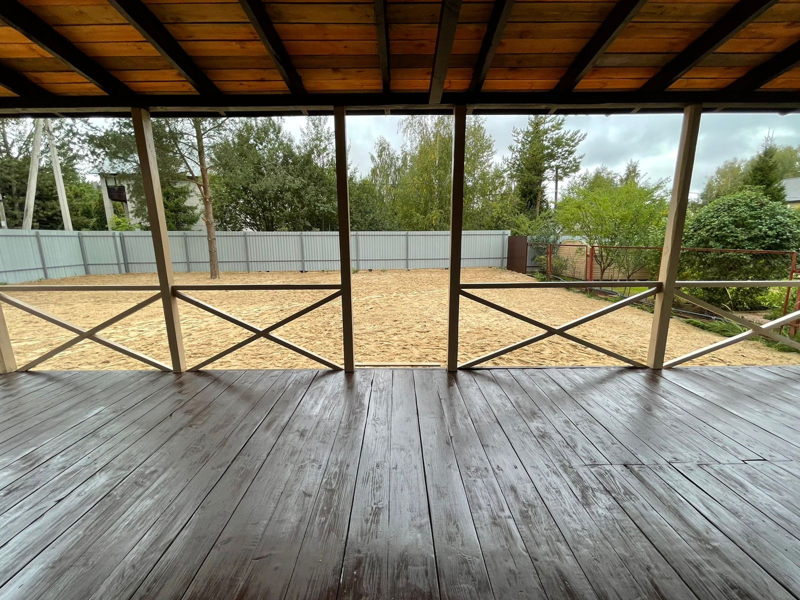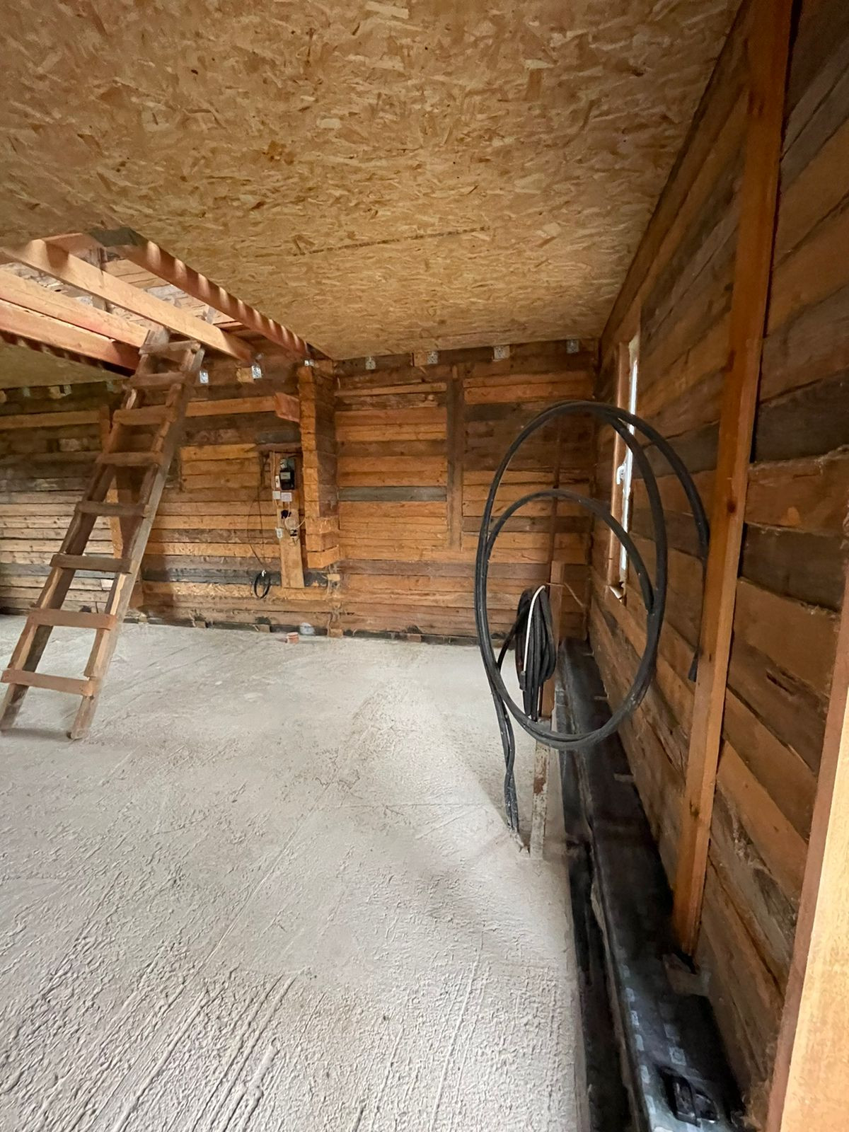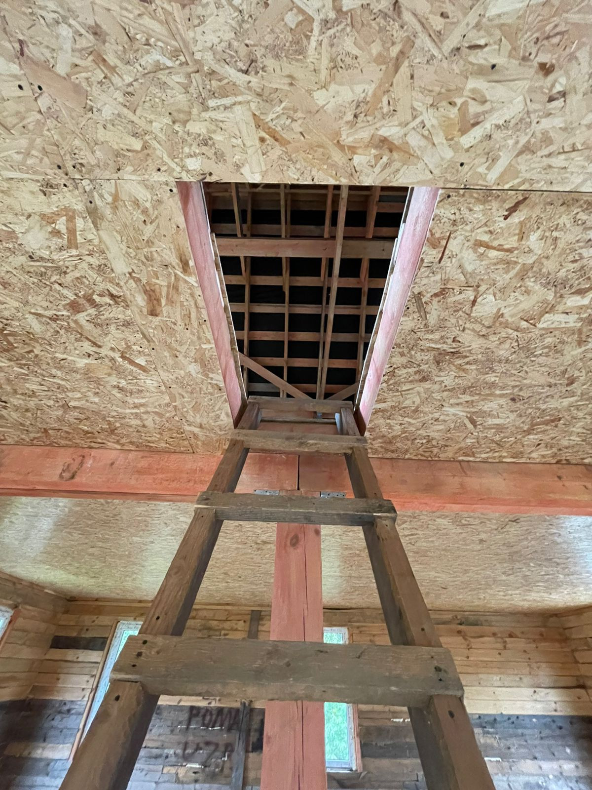 Установлен забор по периметру, скважина 35 метров( труба заведена в дом), канализационная труба выведена из дома,предчистовые потолки и полы сделаны и утеплены.