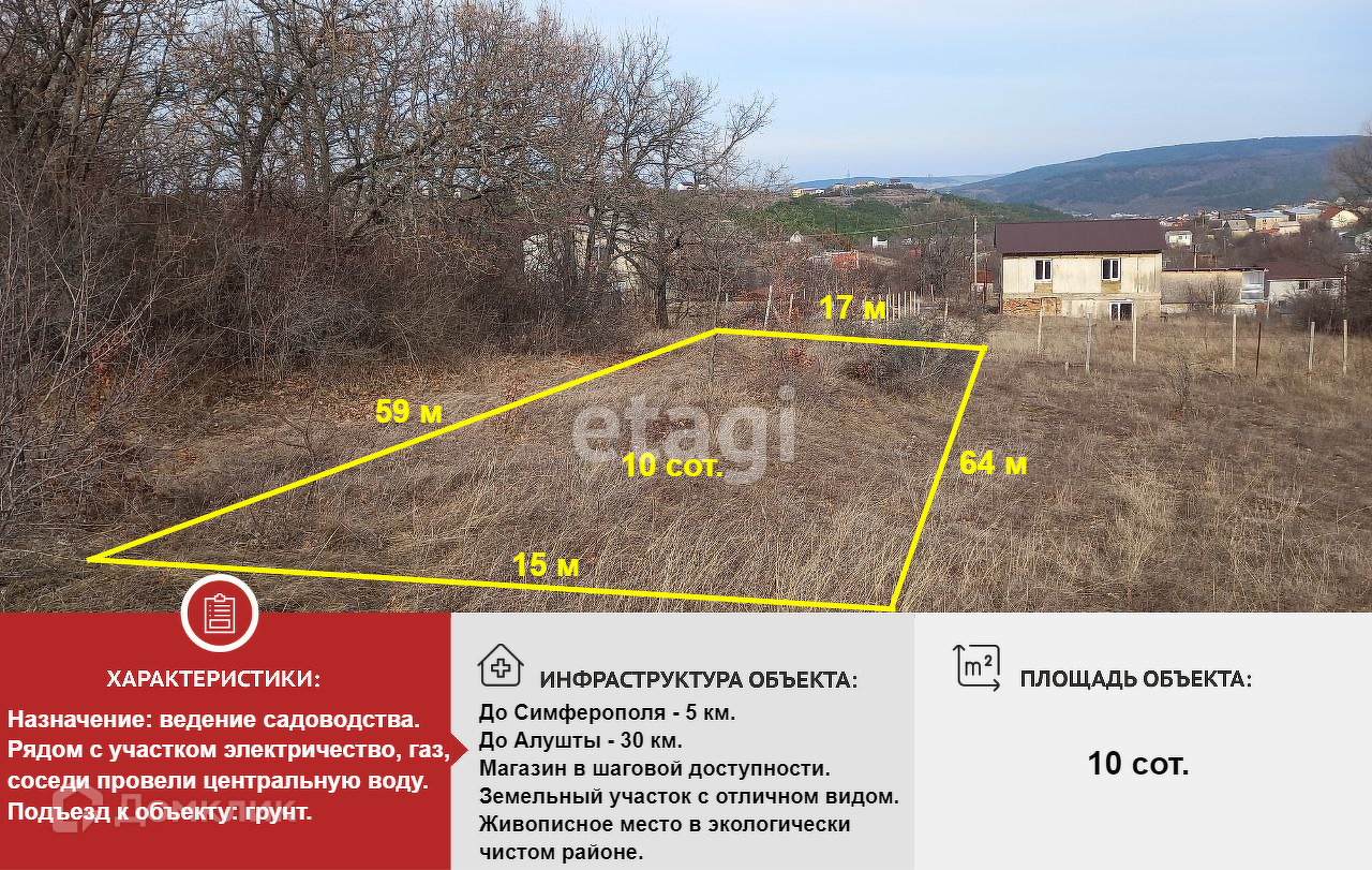 Хотите купить участок рядом с Симферополем и любоваться пейзажами гор и леса??!!! Тогда заходите к нам гости! Продается участок с. Лозовое, СПК "Дружба" 10 соток, расположенный всего 5 км от Симферополя. Рядом с участком электричество, газ, соседи провели центральную воду. Земельный участок с отличном видом, что вас будет радовать каждый день. Живописное место в экологически чистом районе. Здесь можно отдохнуть телом и душой! Звоните в любое время, с удовольствием отвечу на ваши вопросы. Устроим показ в удобное для Вас время. Номер данного объекта: 10599233.