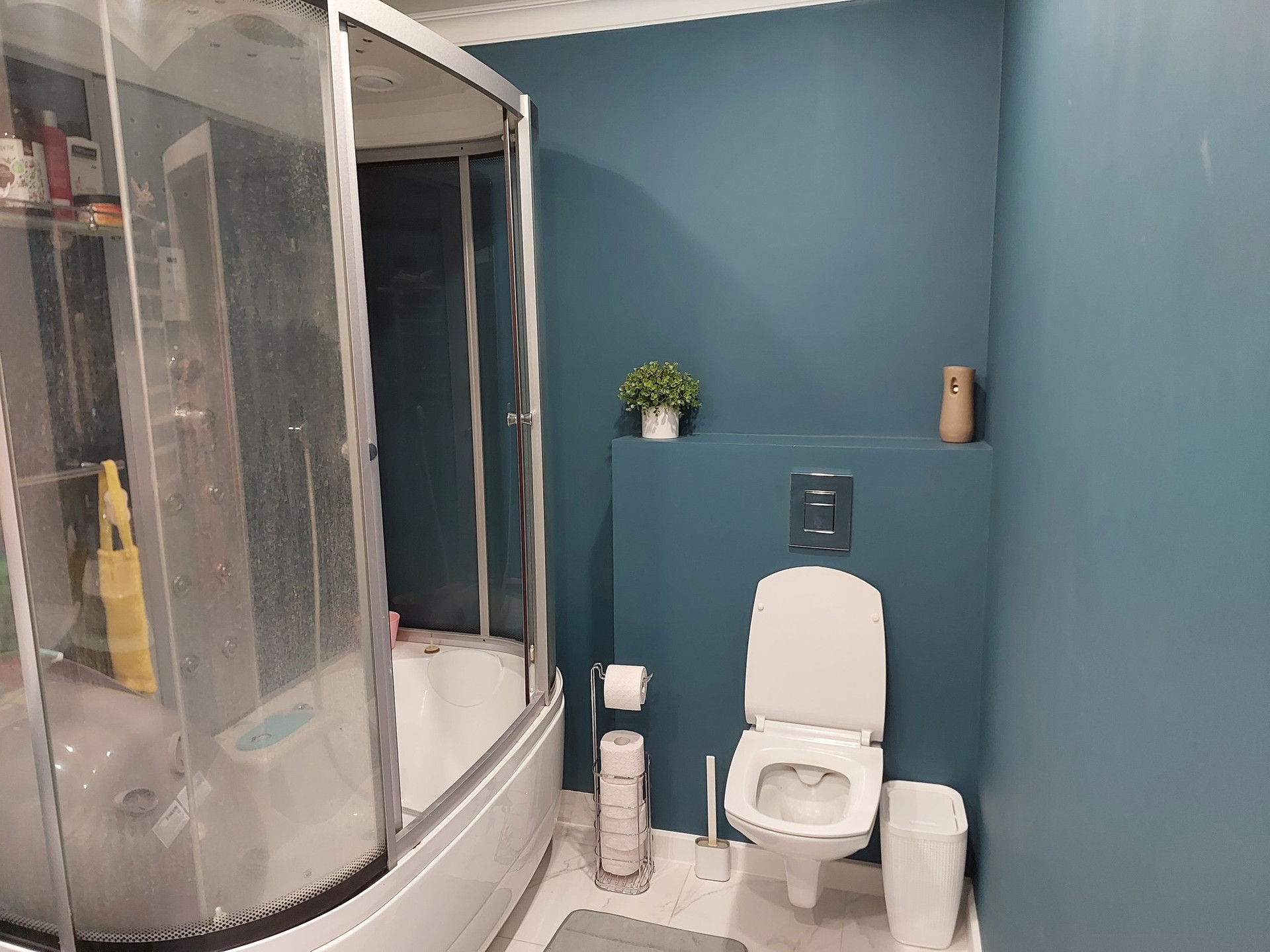 1й этаж- прихожая, гостиная, кухня, котельная, санузел(душевая кабина с полноразмерной ванной).