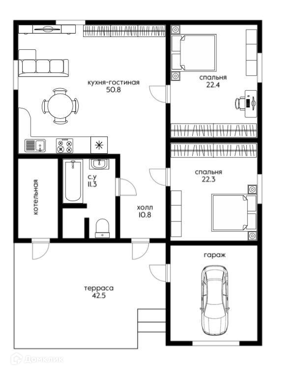 Дом одноэтажный, с большой кухней-гостинной и камином.