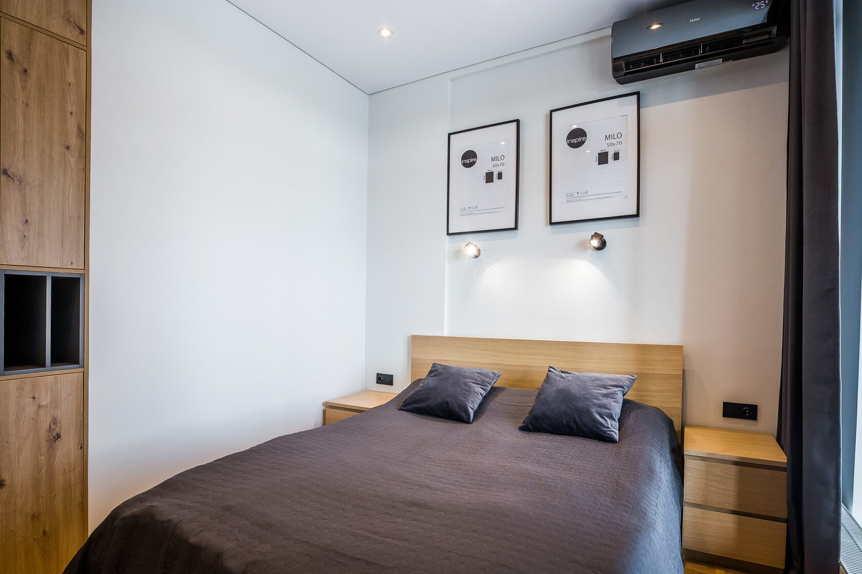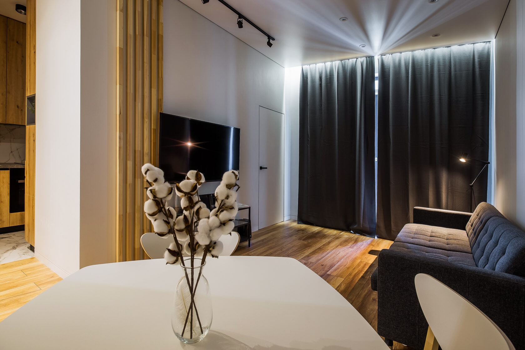 Три спальни: одна из них – мастер-спальня со своим санузлом, гардеробной и портальной дверью, детская и рабочий кабинет
