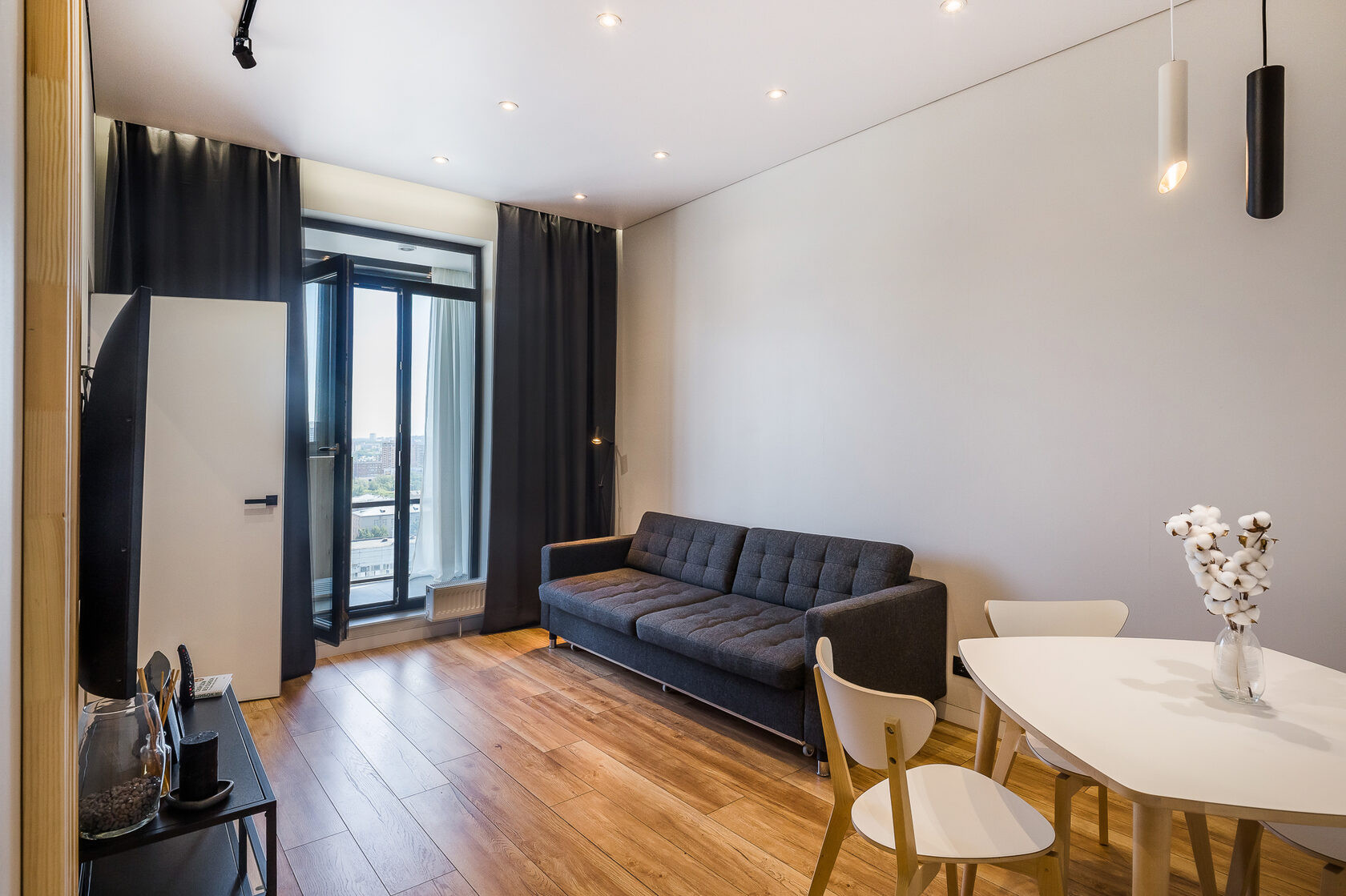 Одна кухня-гостиная с панорамными окнами и выходом на террасу