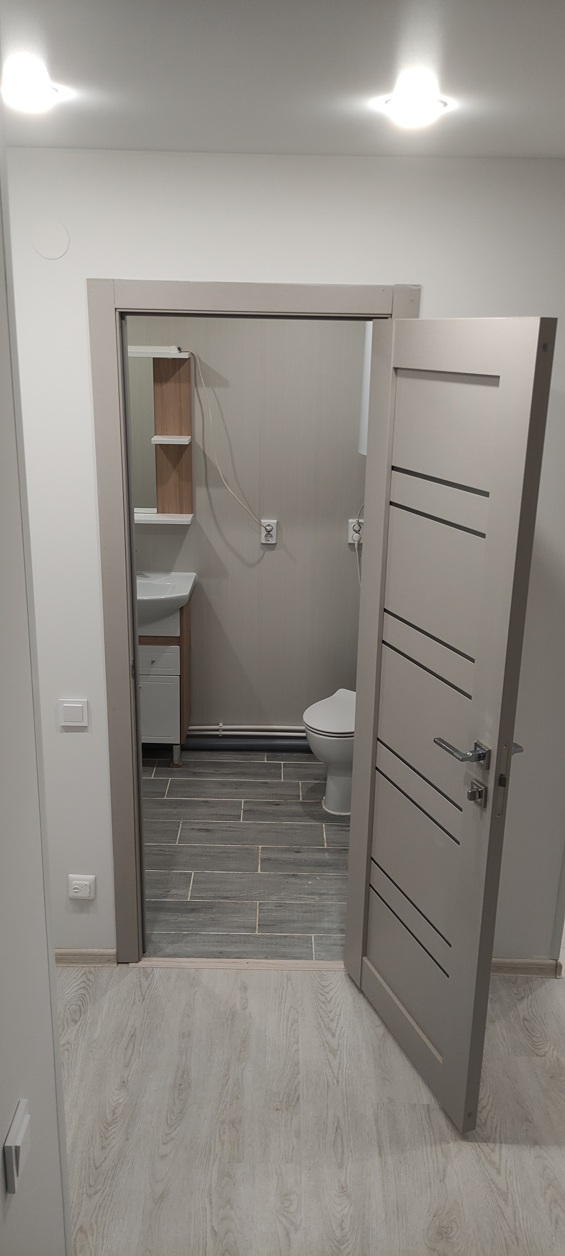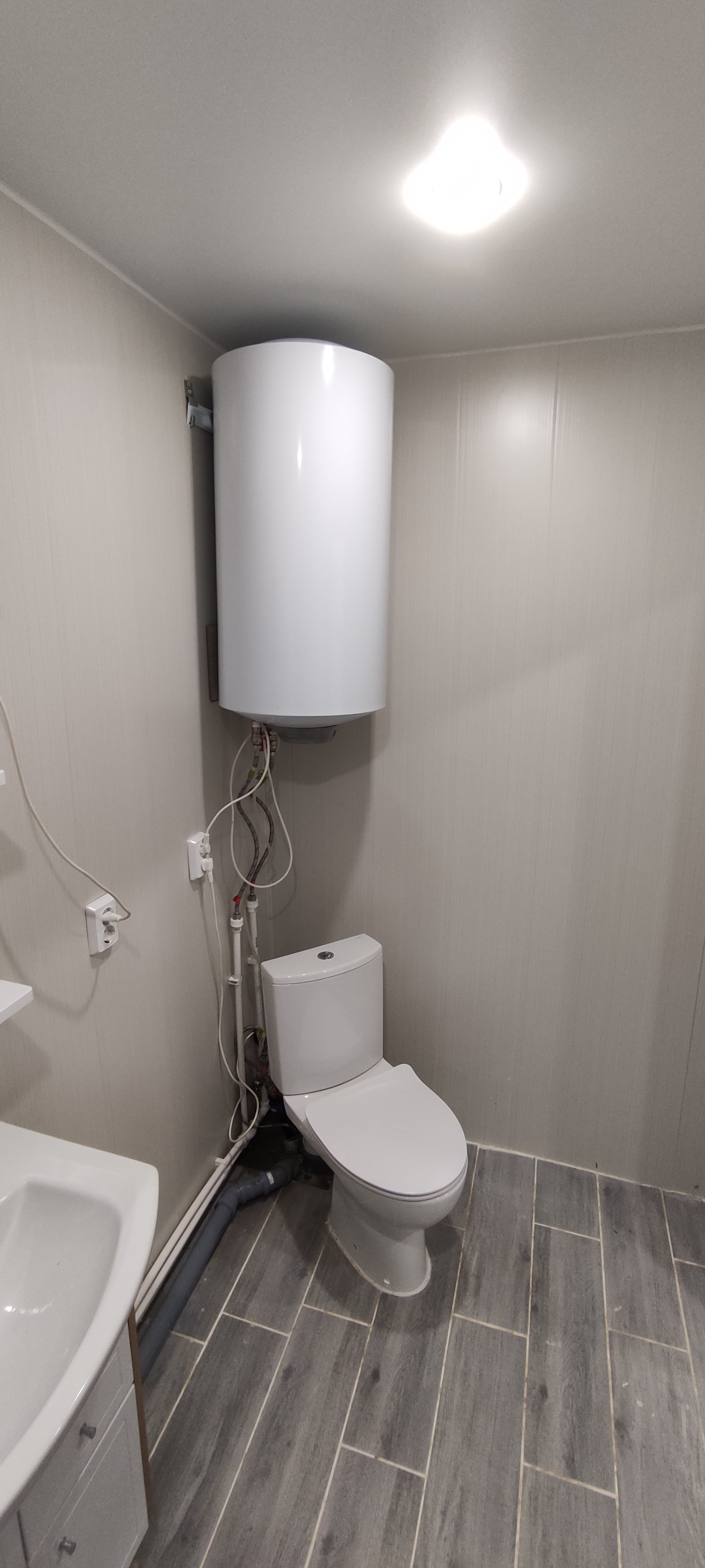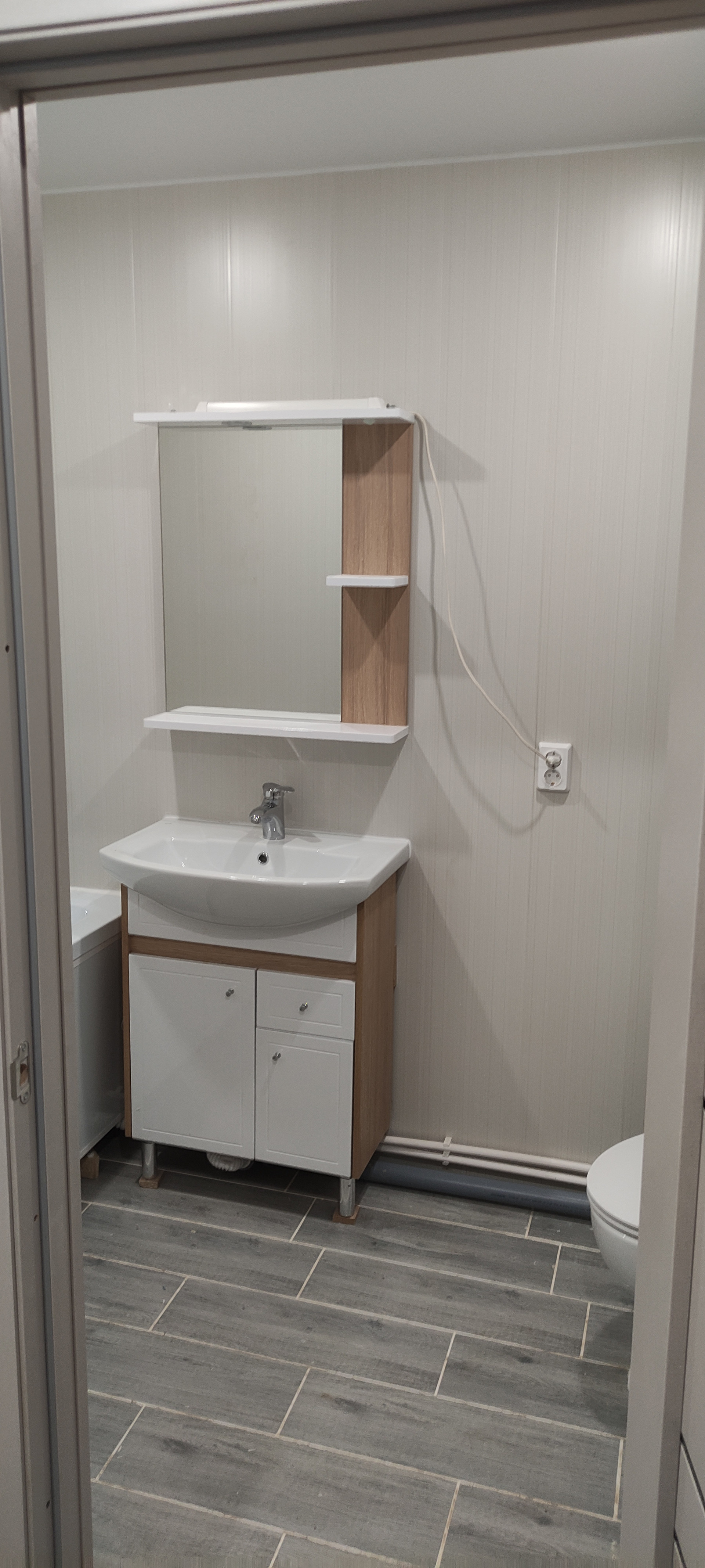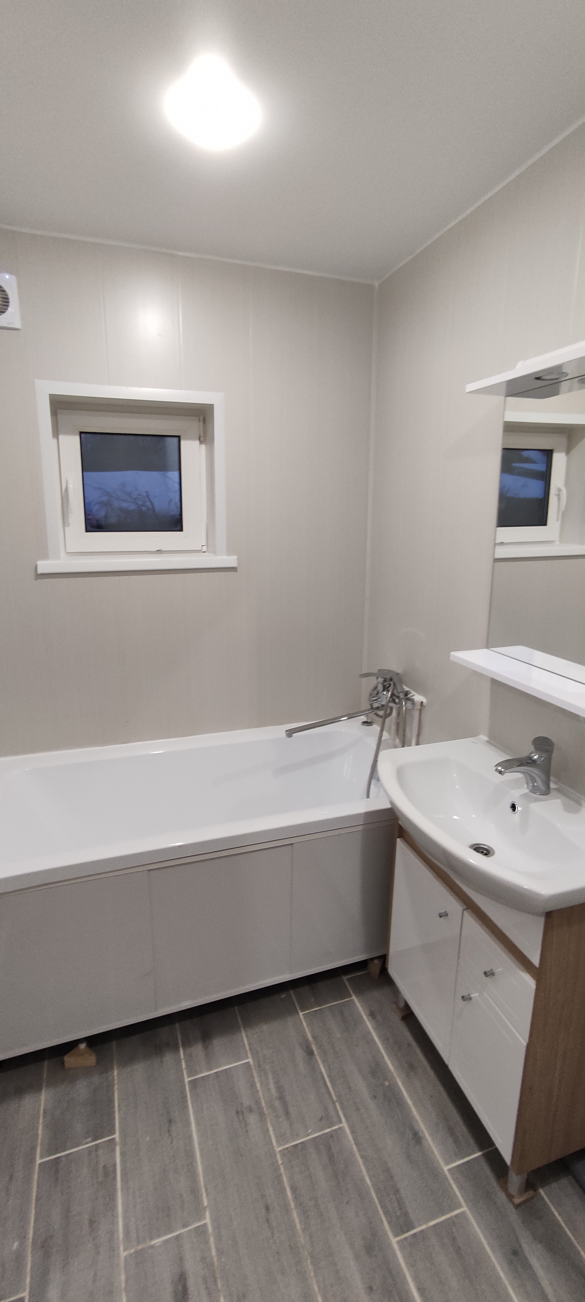 - В санузле разведена сантехника «под ключ» (ванна, унитаз, тумба с раковиной, зеркало, водонагреватель), сварены полипропиленовые трубы, установлен теплый пол;