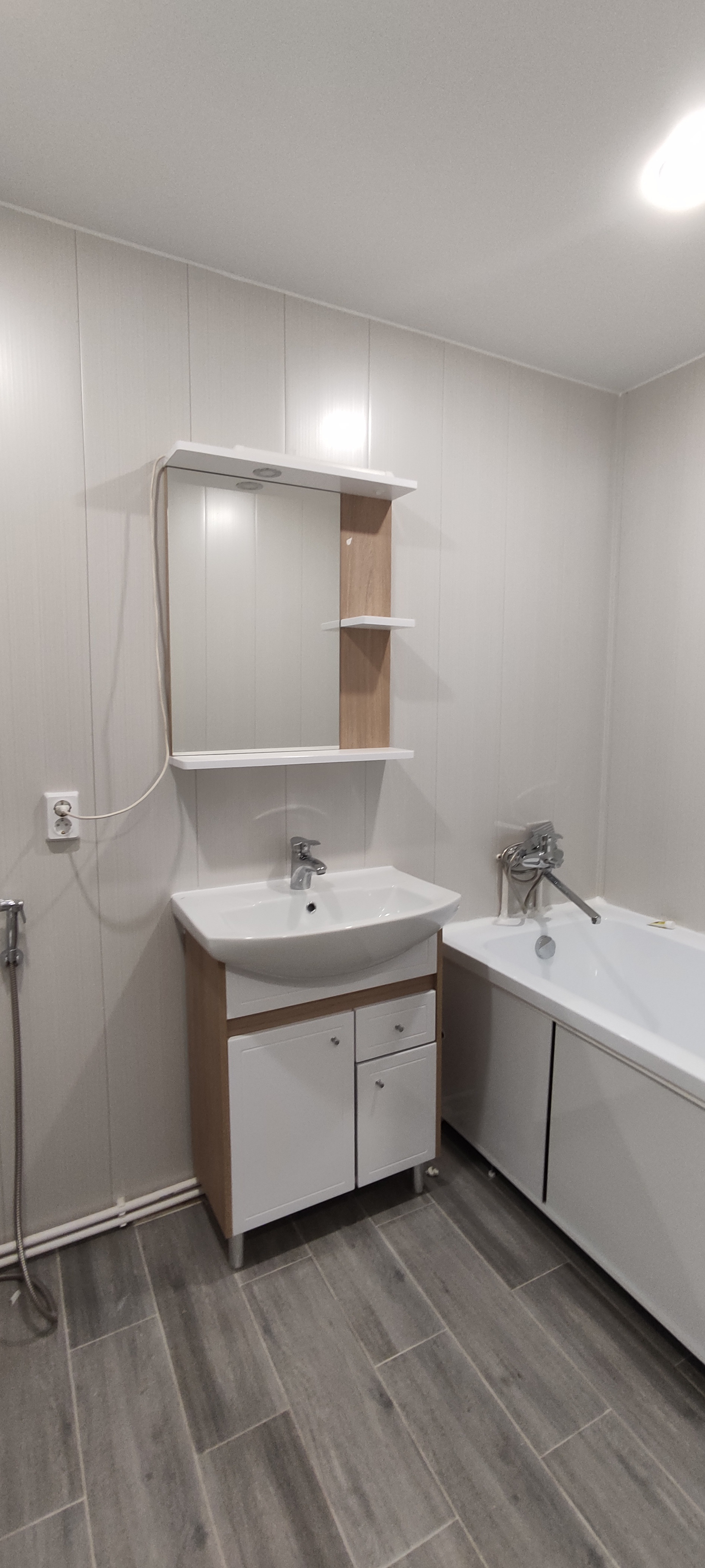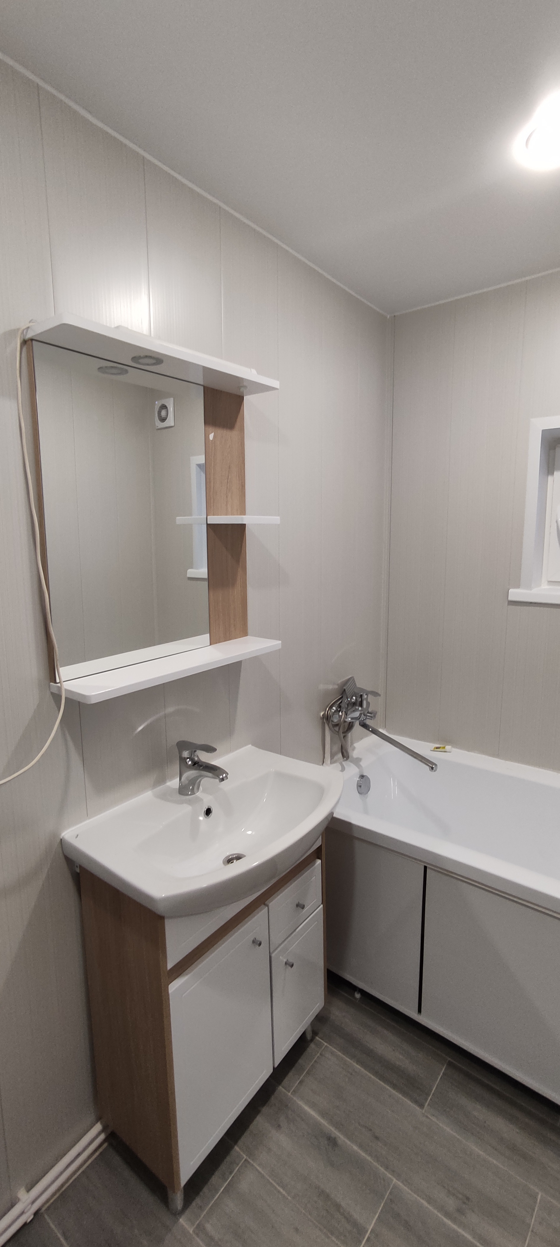 - В санузле разведена сантехника «под ключ» (ванна, унитаз, тумба с раковиной, зеркало, водонагреватель), сварены полипропиленовые трубы, установлен теплый пол;
