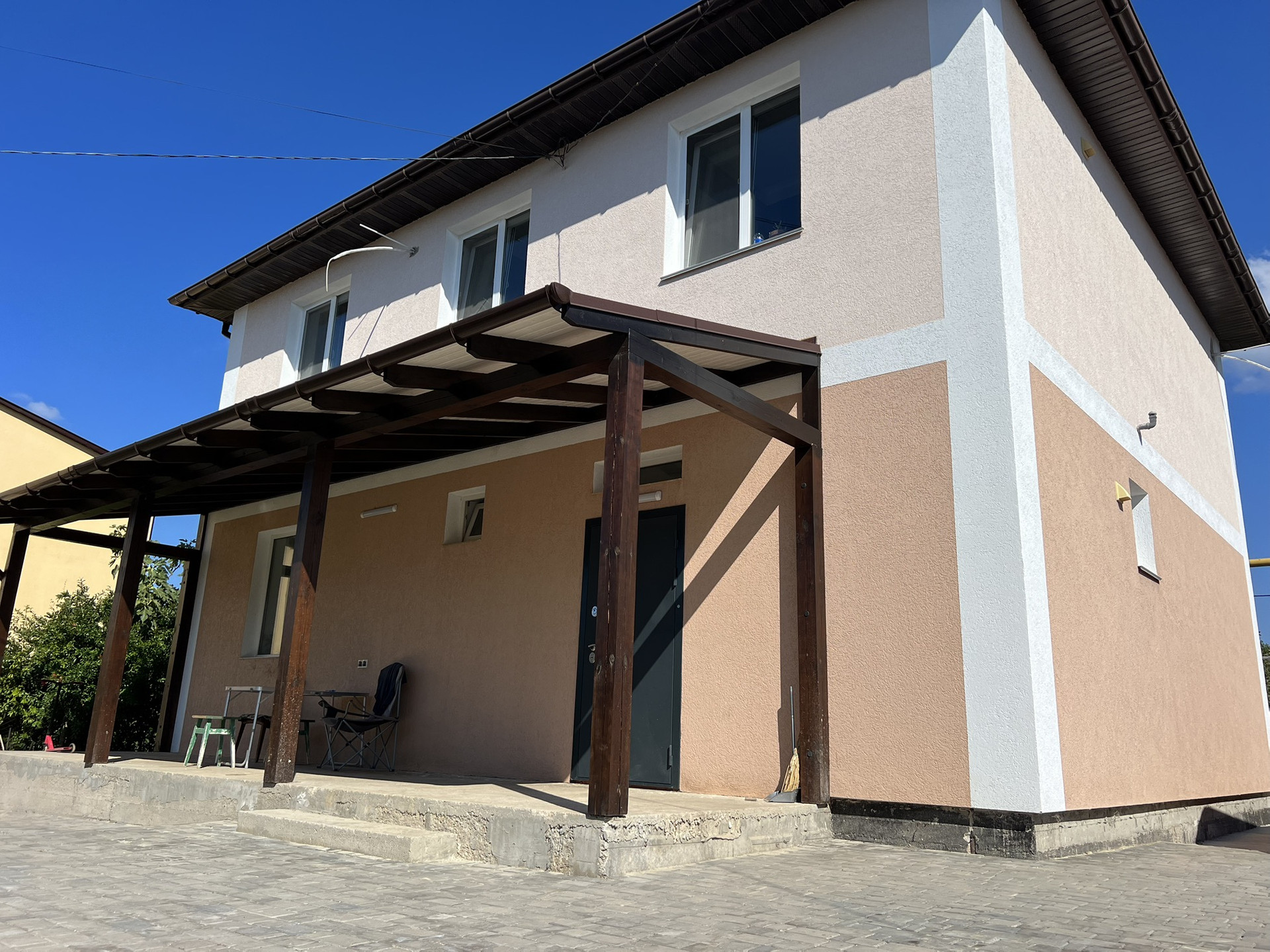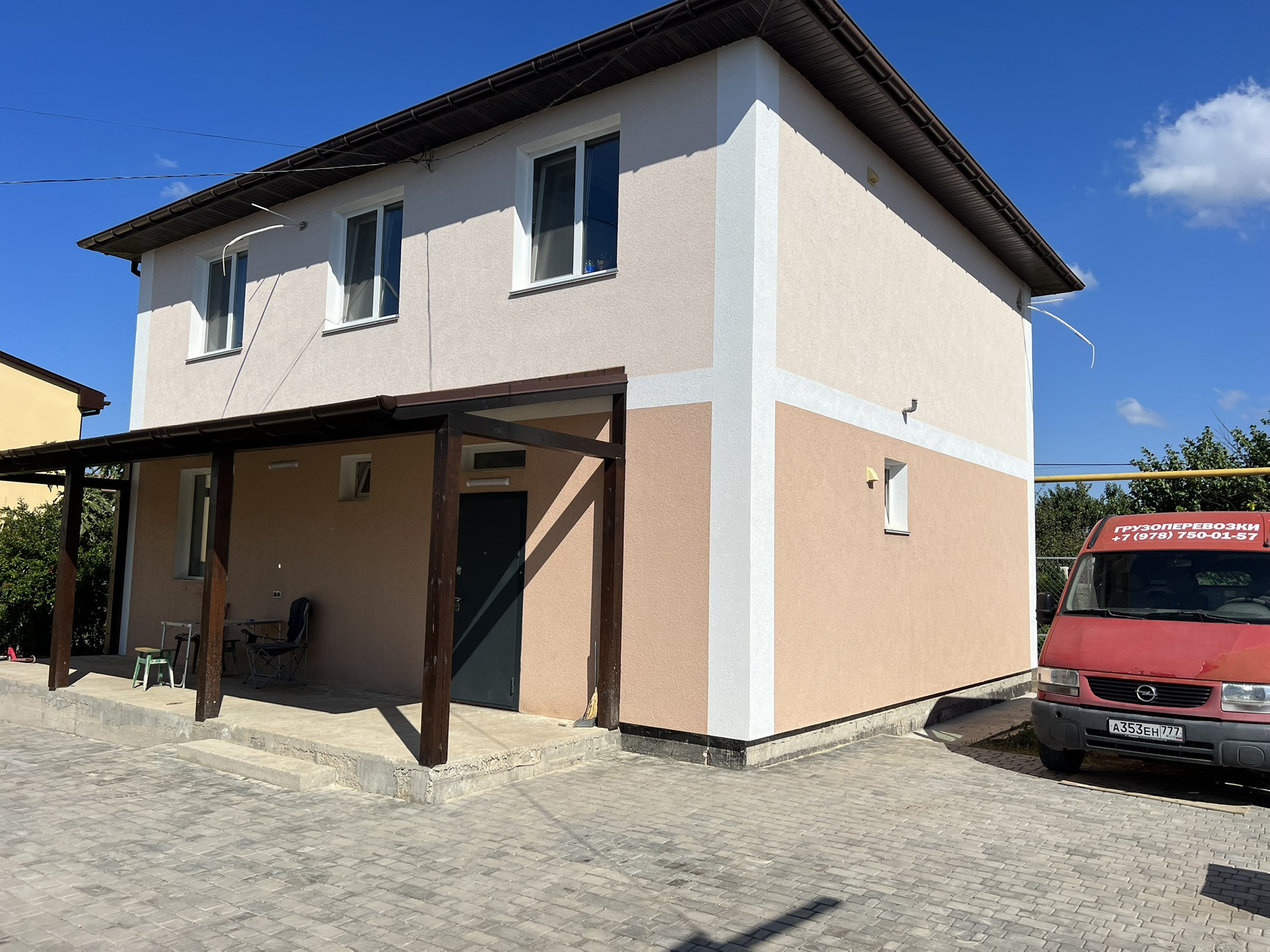 Дом построен из ракушечника , в два полноценных этажа без мансарды, между первым ,и вторым этажами , лежат плиты перекрытия.