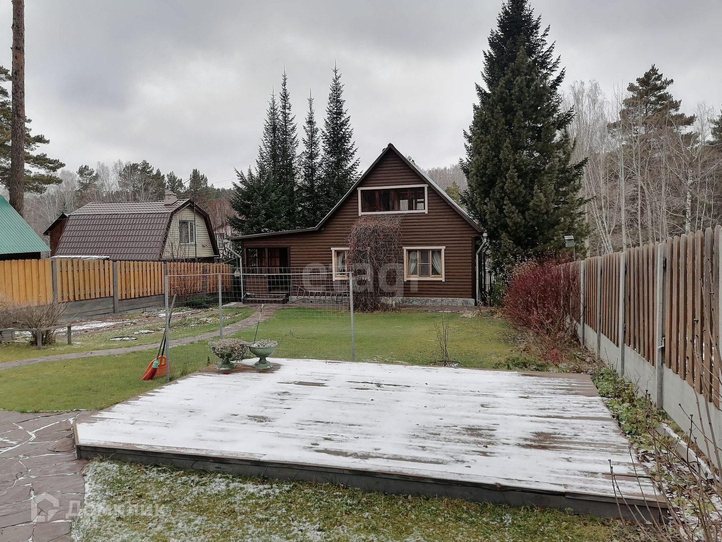 На территории участка ухоженный газон, оборудованная площадка для бассейна.