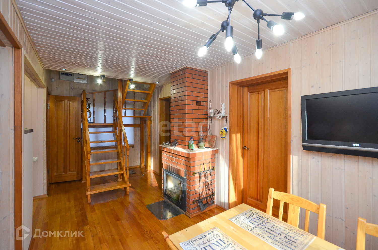 На первом этаже две спальни,кухня-гостиная с настоящим камином,санузел.