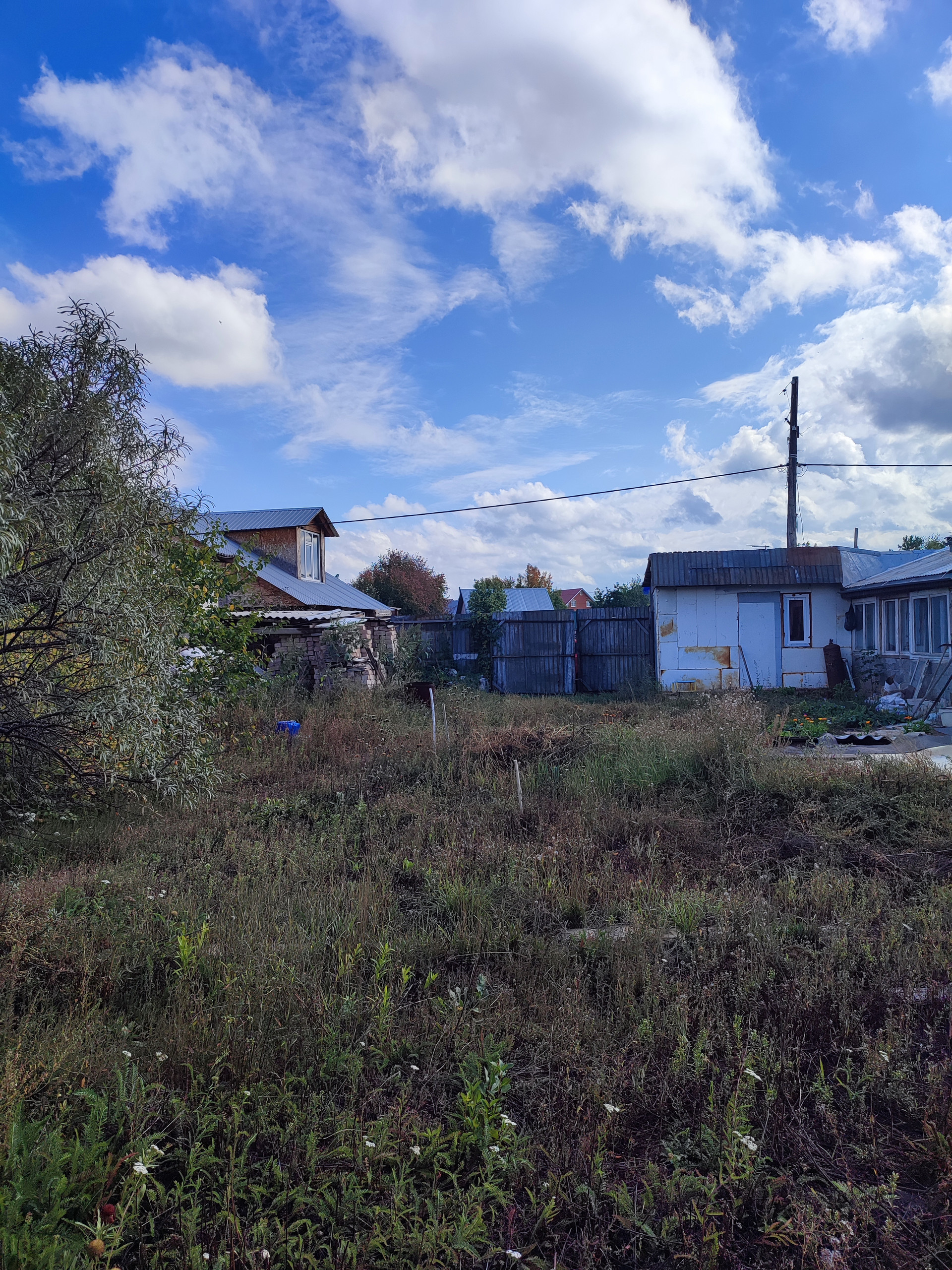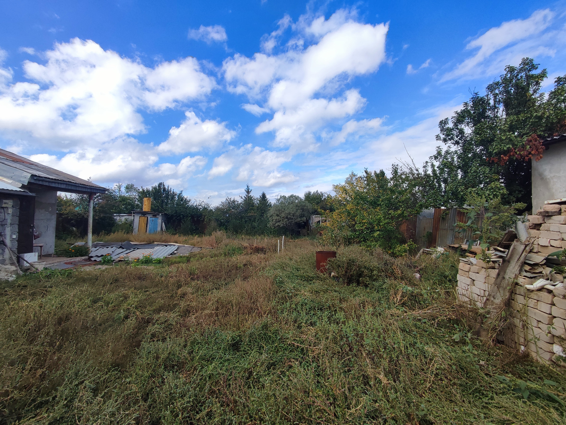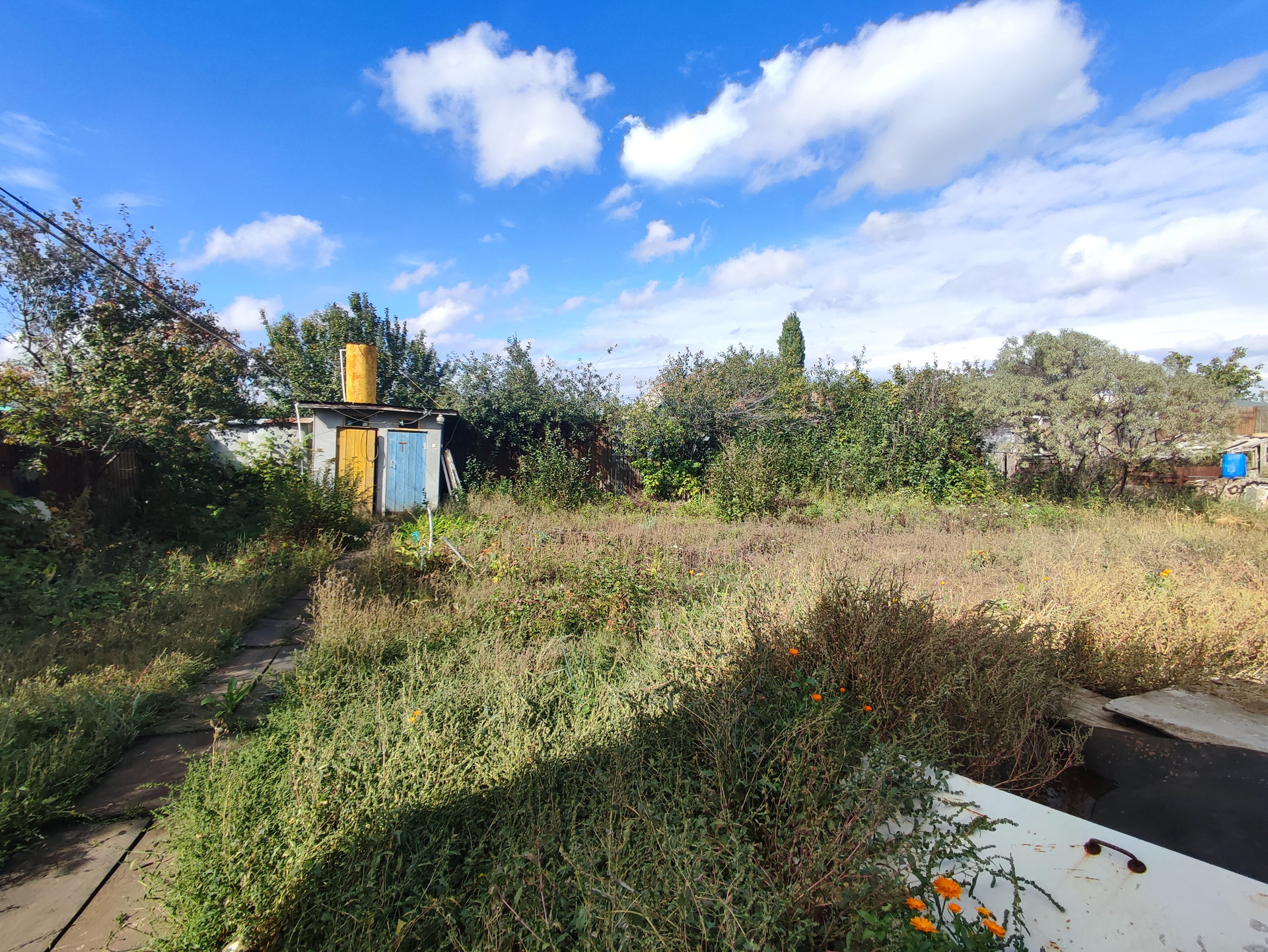 Участок засажен фруктовыми деревьями и плодово-ягодными кустарниками. Есть летний душ, туалет и курятник.