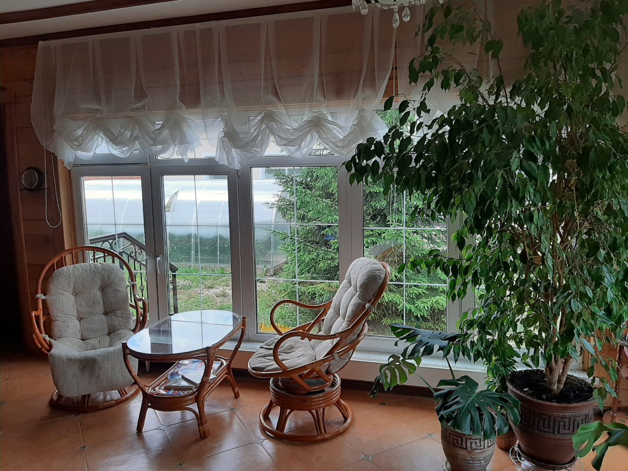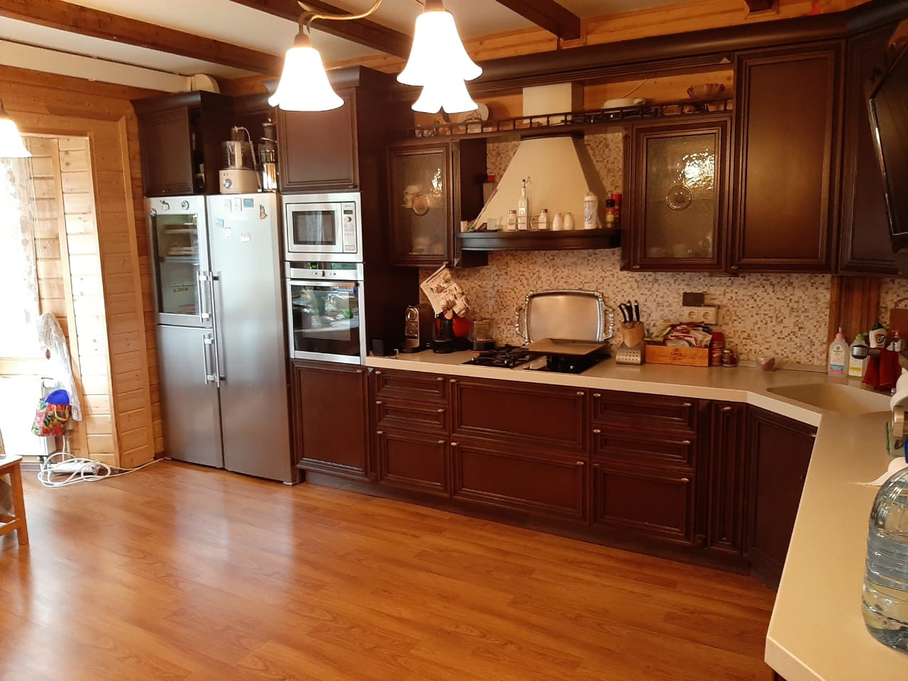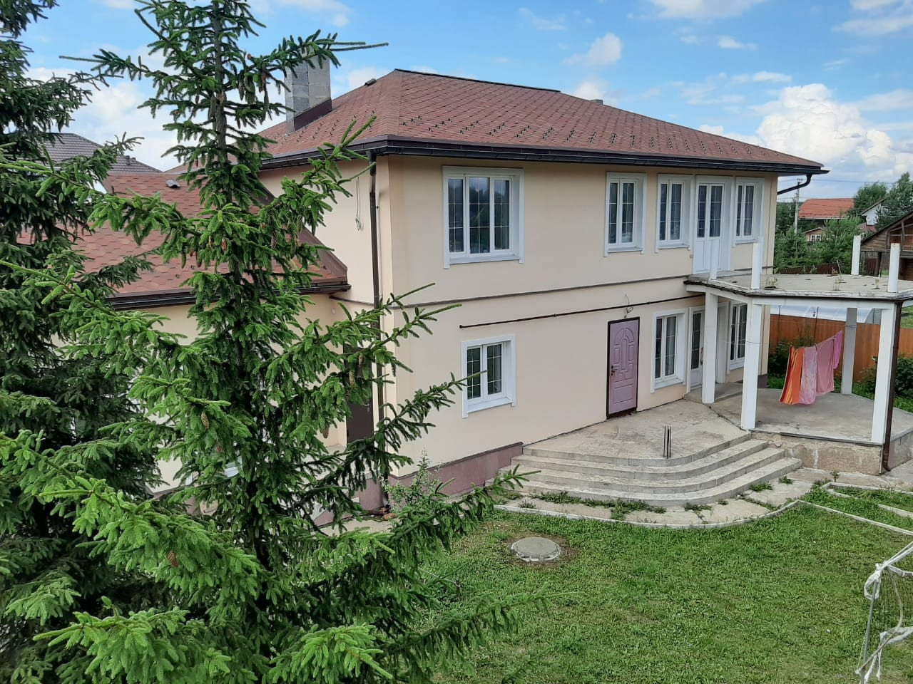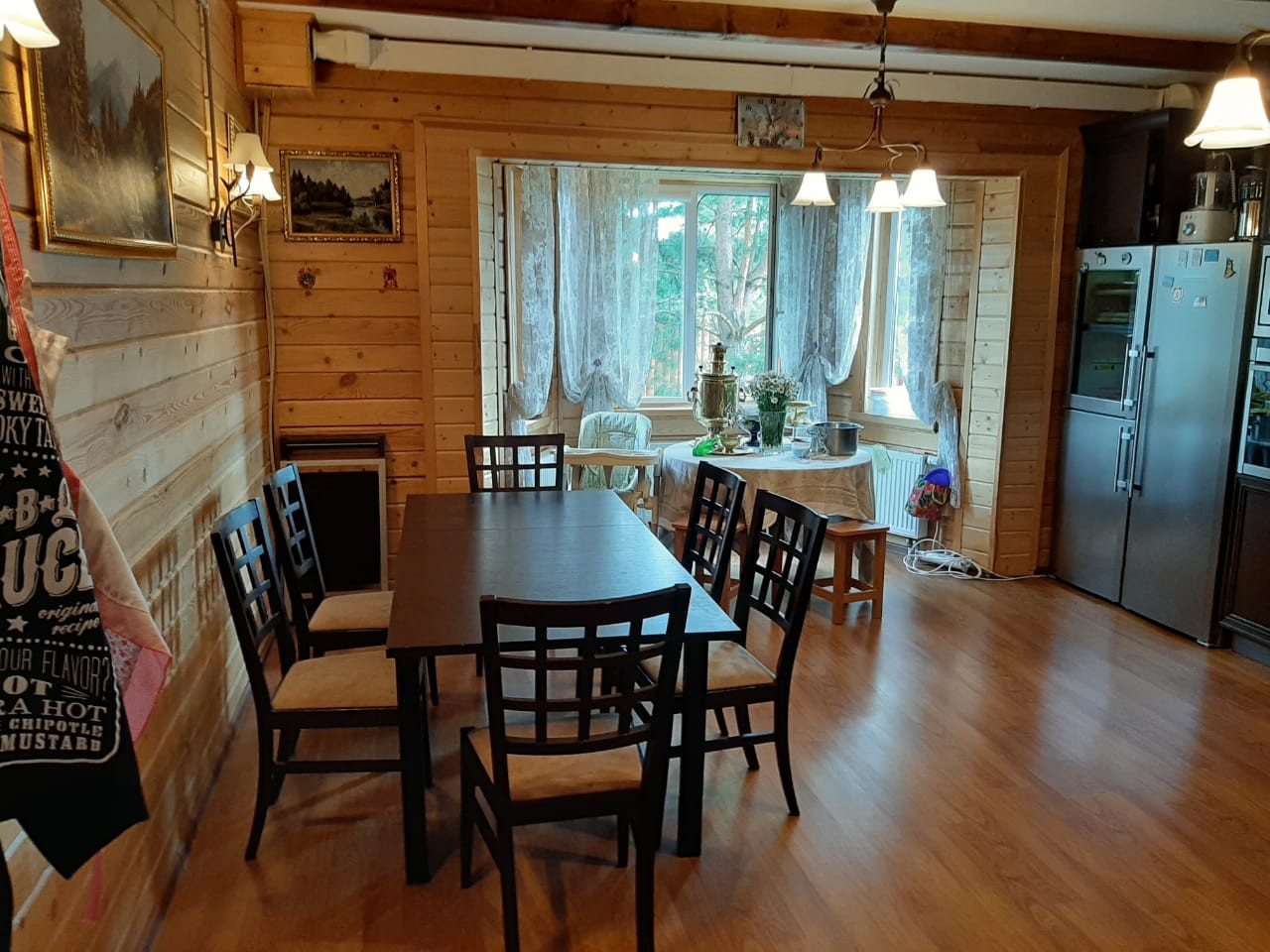 Дом 2 эт. Из бруса общей площадью 240 м2.1 Этаж- большая кухня-столовая, гостиная с камином, прихожая, гардеробная, зимний сад с теплым полом. 2 этаж-3 спальни и детская комната.