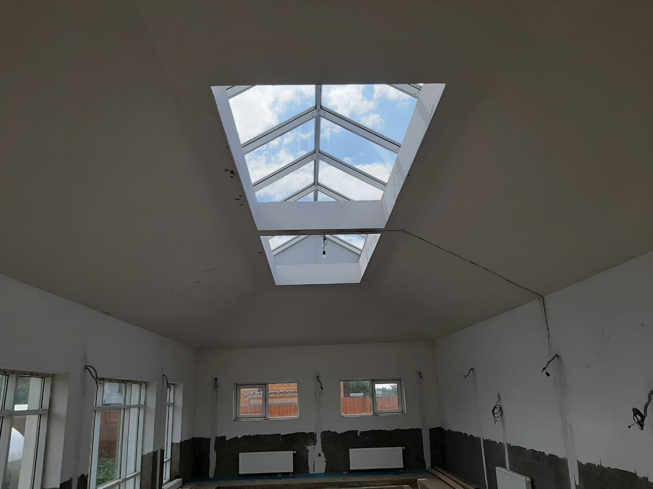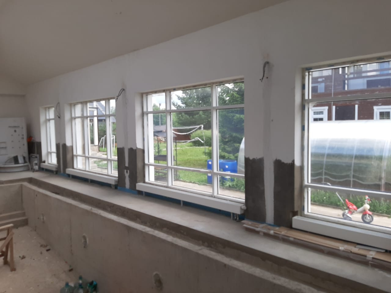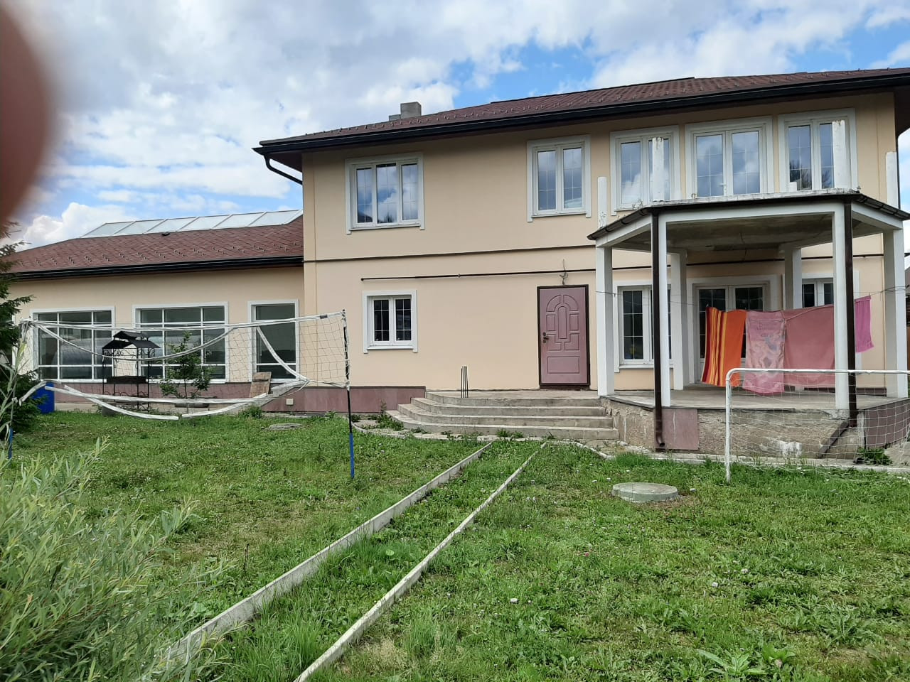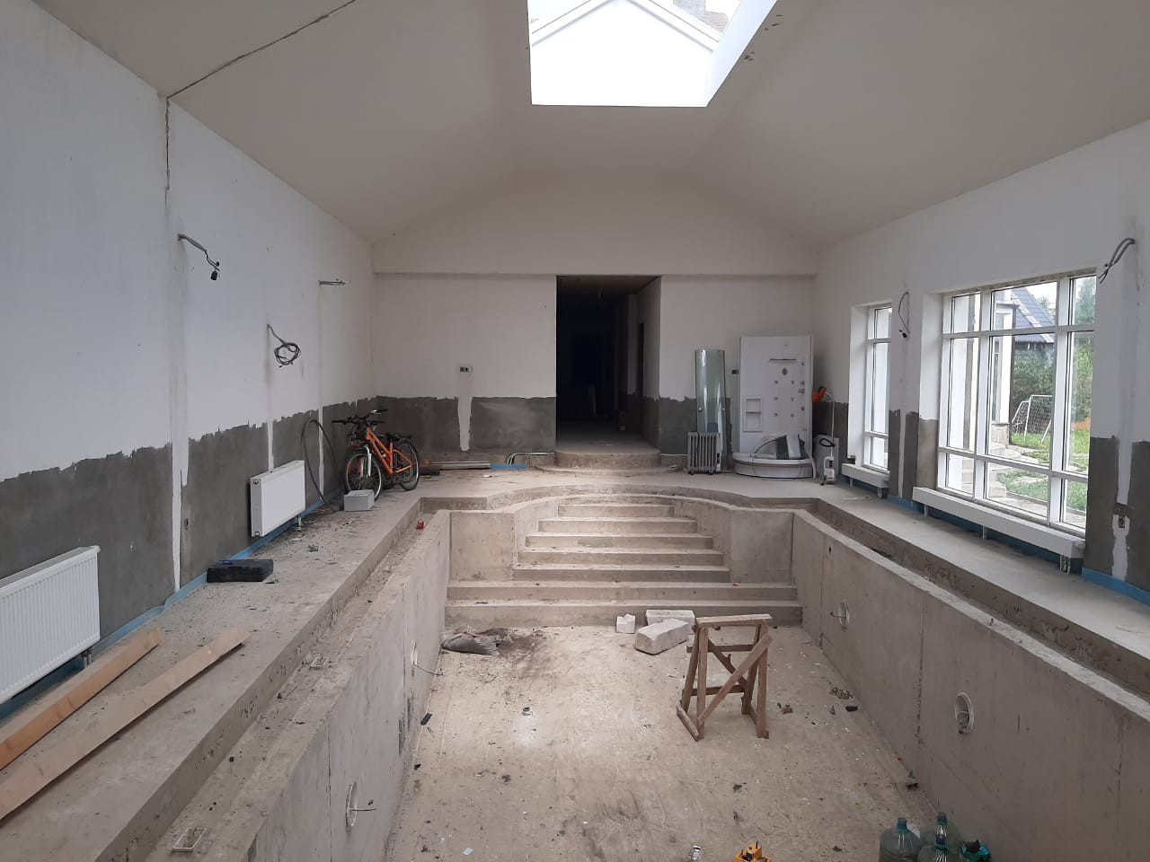 Дом 2эт.каменный. Каркас и перекрытия монолит, стены пеноблок.450 м2 под чистовую отделку. В доме бассейн с банным комплексом. Подвал –зона отдыха(бильярдная), тех. зона с коммуникациями для бассейна, подсобные помещения. 1 этаж- бассейн 99.5м2 чаша бассейна 12.5*4.5, сауна, баня, хамам, зона отдыха, кухня, 2 санузла и душевые комнаты. Витражные окна, энергосберегаемое остекление крыши. 2 этаж – гостиная, 3 спальни, гардеробная и 2 санузла.