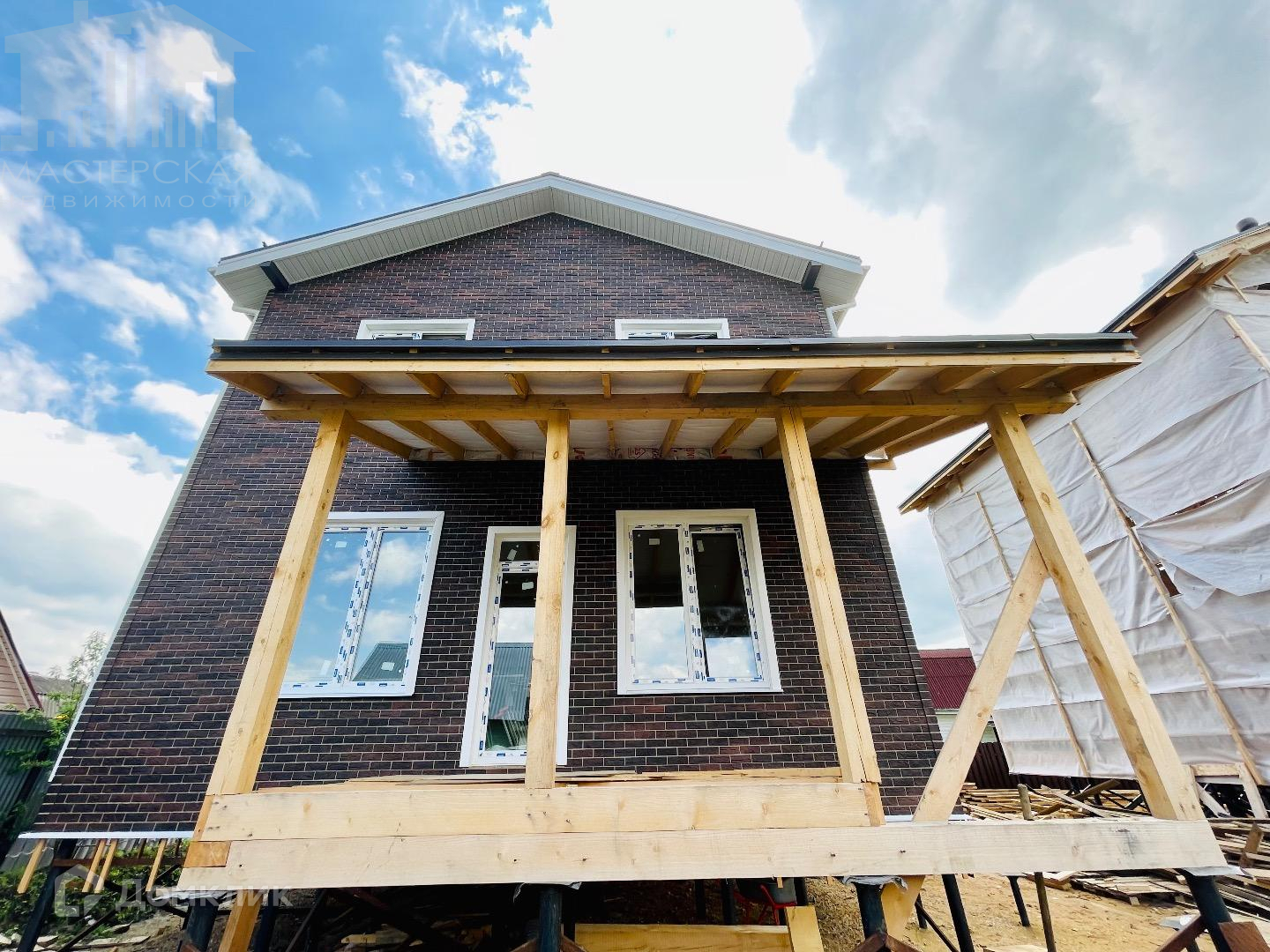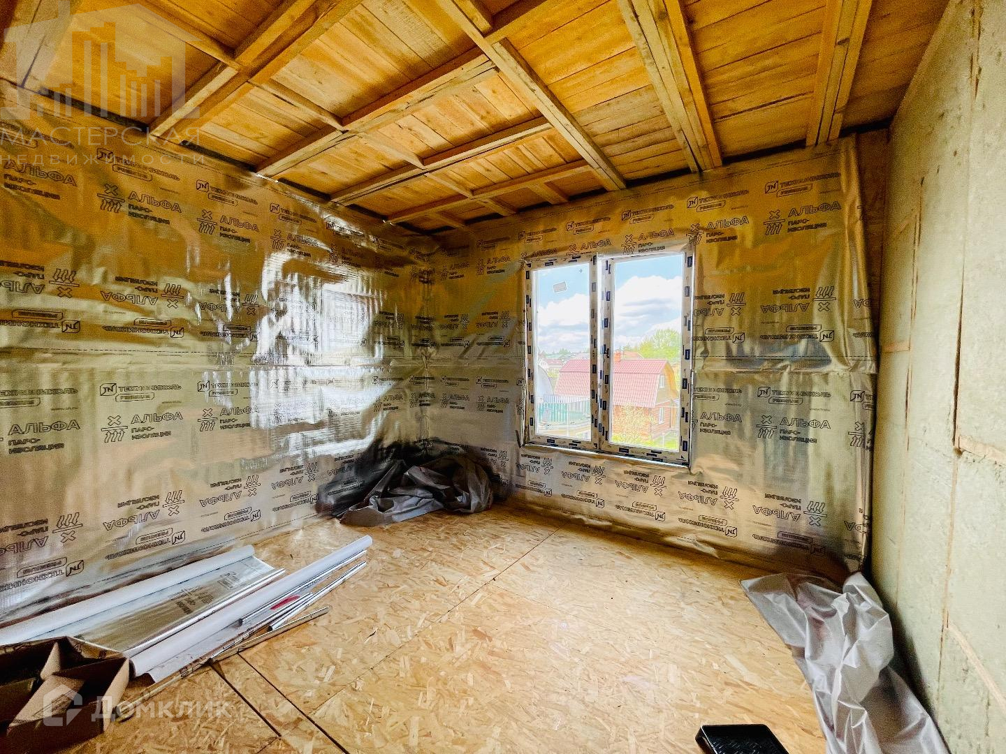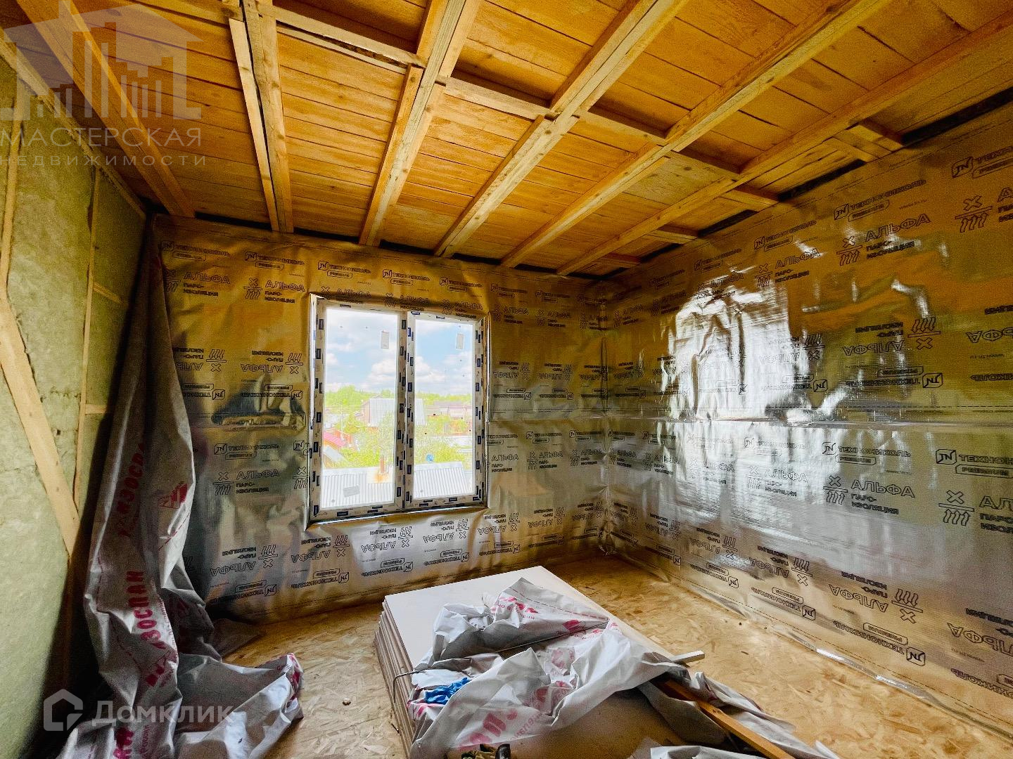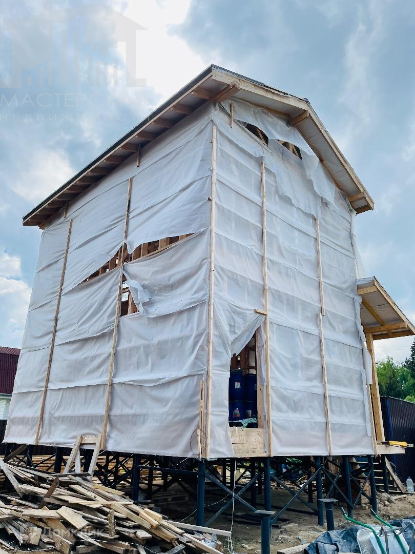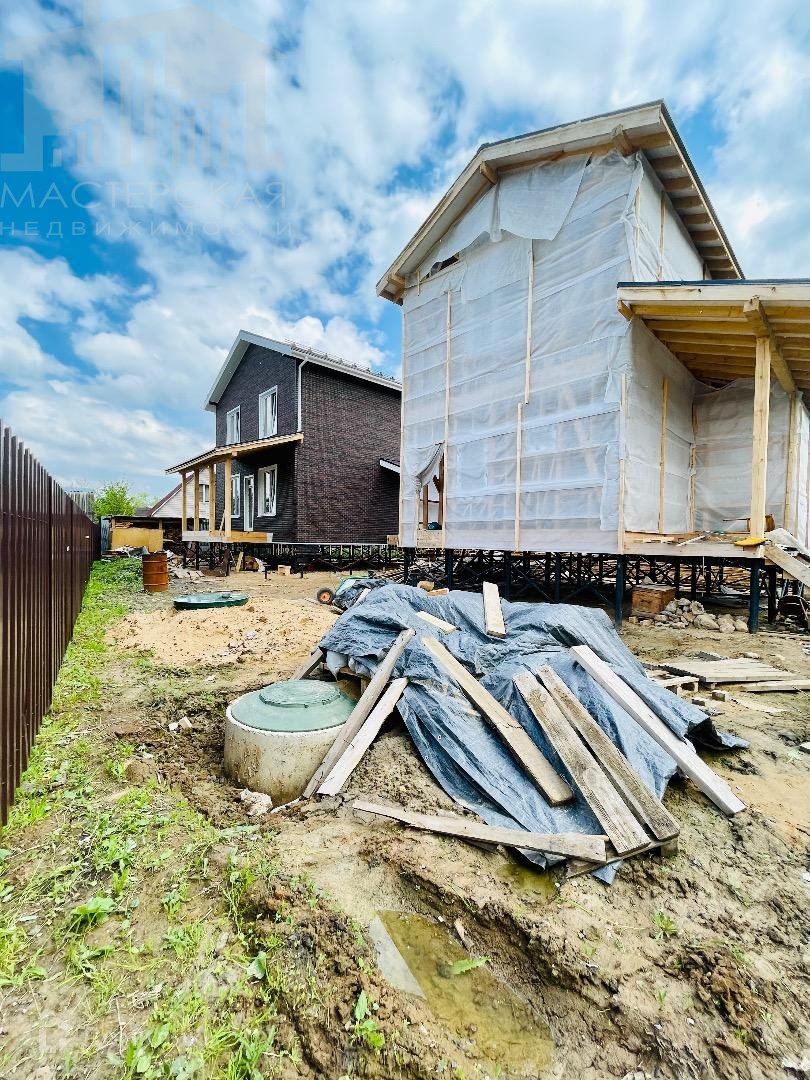 Второй дом-100кв.м., сделан каркас с крышей и установлены м/п окна. Дом обтянут временной пленкой для защиты от попадания осадков. Отделочные материалы частично закуплены.
