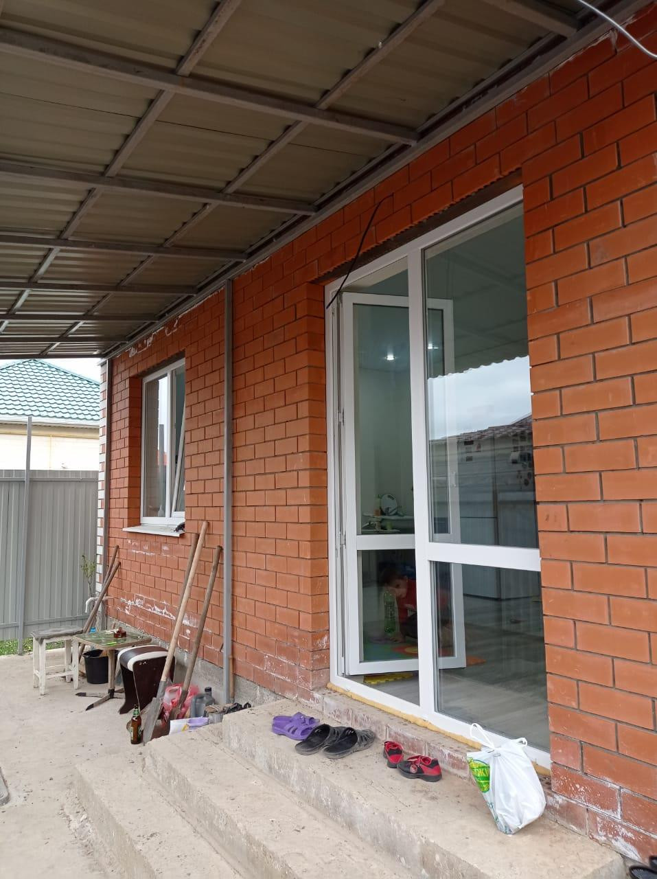 Над входом со стороны кухни оборудован навес на всю ширину дома, где расположилась зона барбекю. Во дворе отлита дорожка с парковочными местами под 2-3 машины. Ворота откатные.