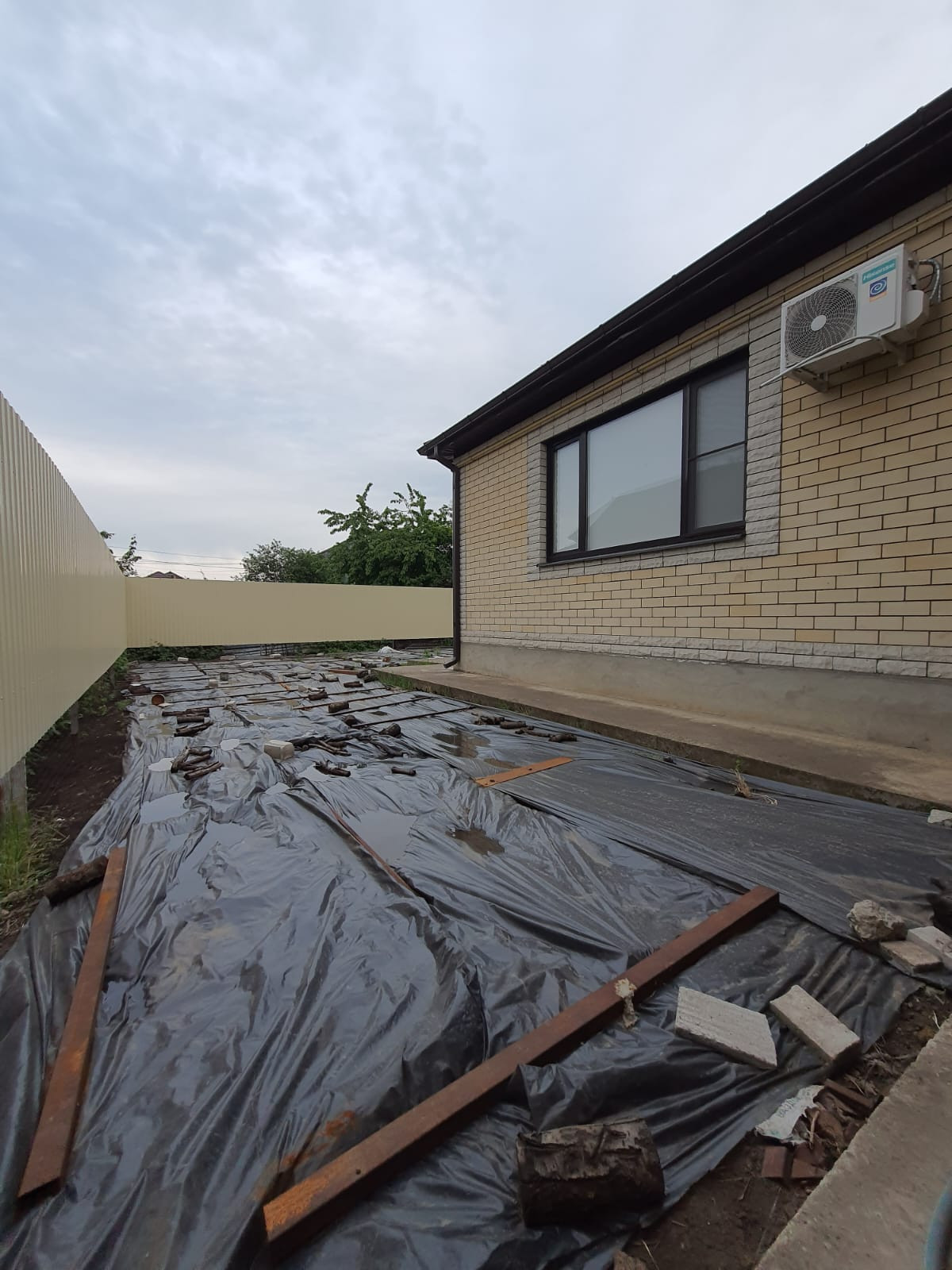 Кирпичный забор. Территория двора забетонирована (толщина бетона 30 см.), (с применением армирования). Засыпан чернозём: глубиной 0,6 метра (площадью более 180 м2).