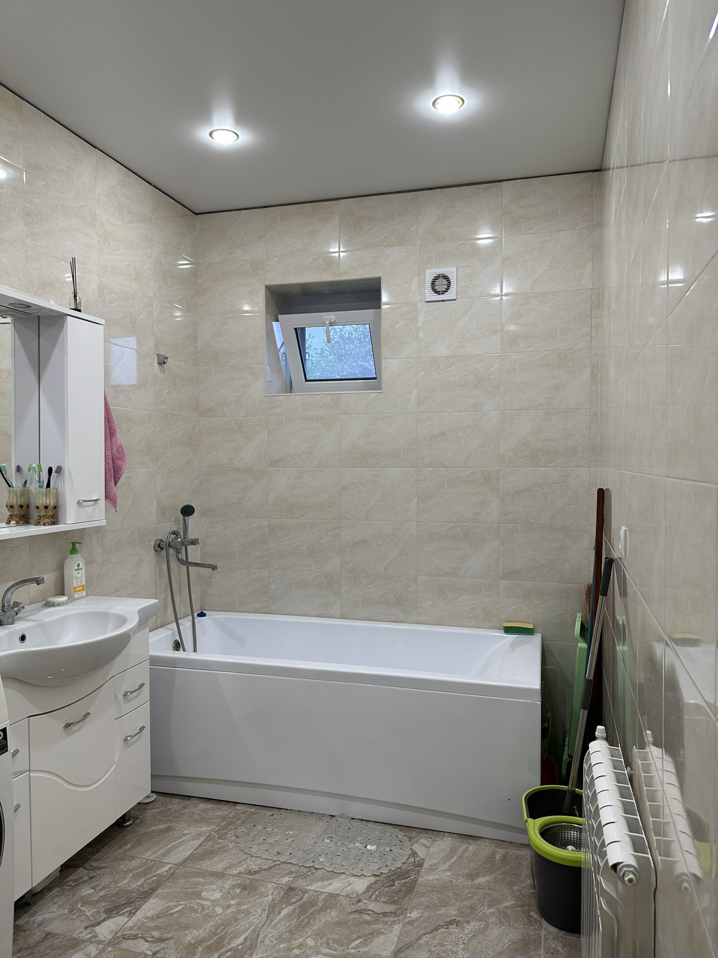 На первом этаже у нас кухня, гостиная,санузел, ванная комната