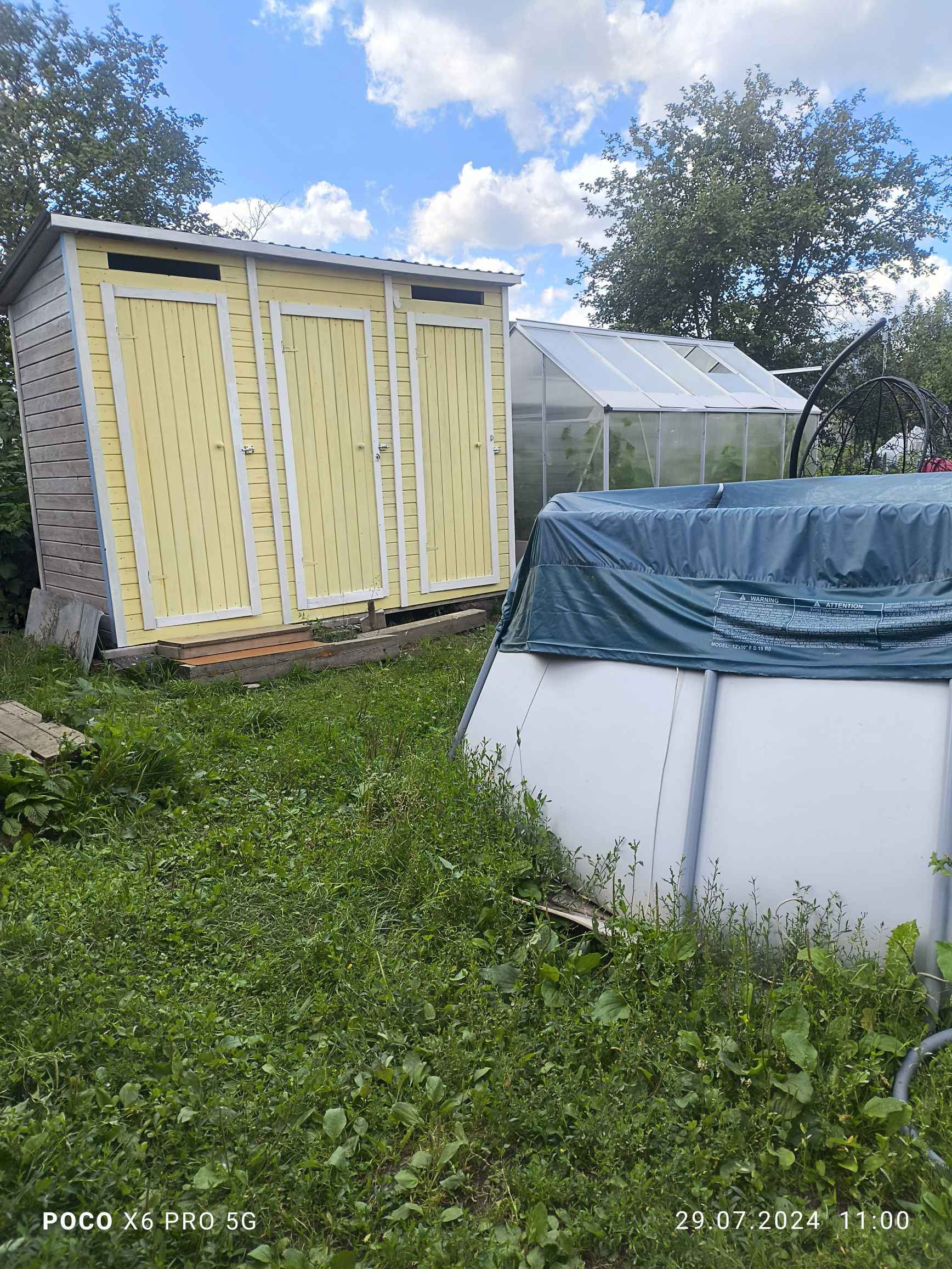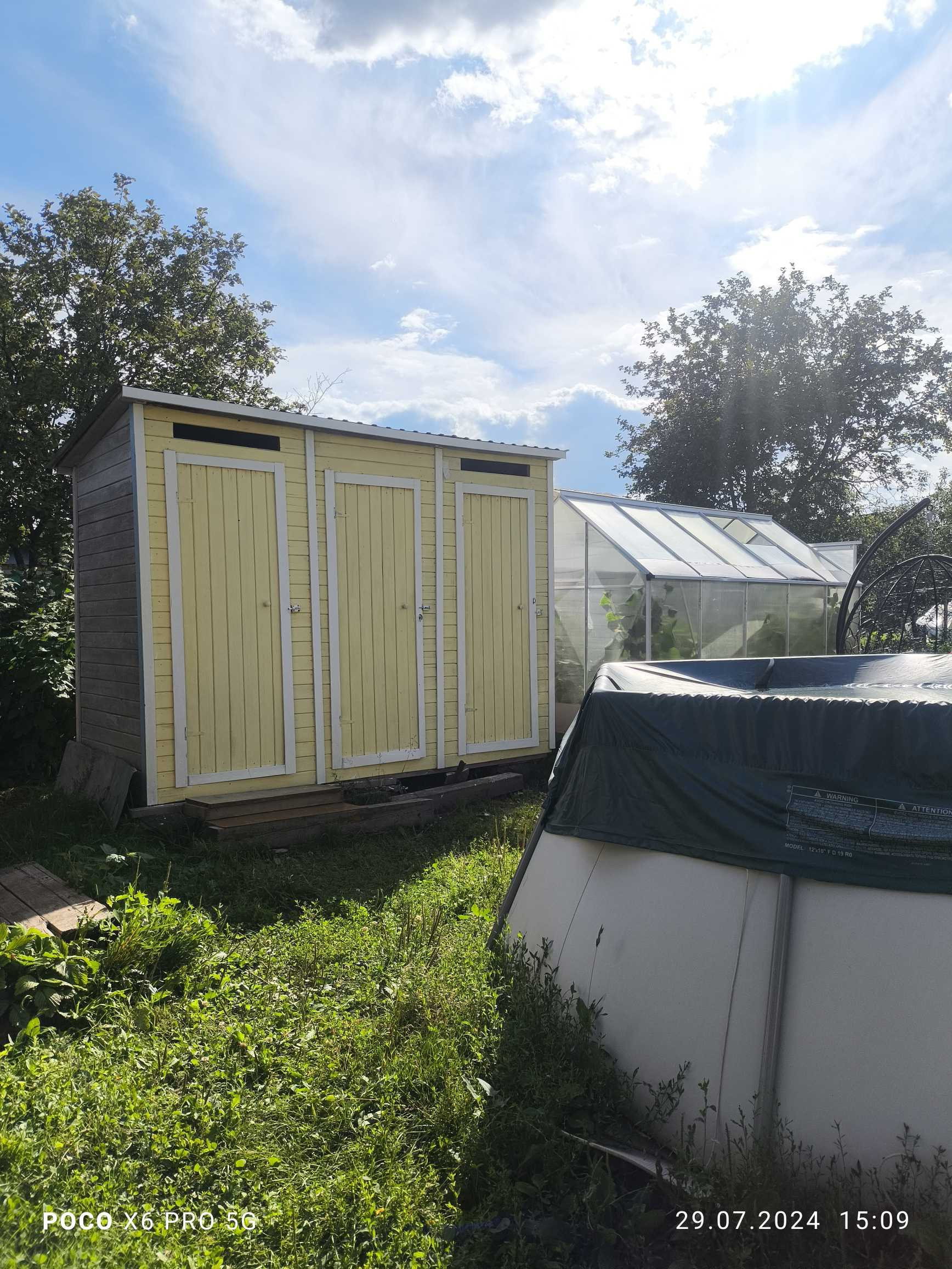 На участке хозблок: туалет( огромная яма на несколько лет), инструменты, инвентарь.