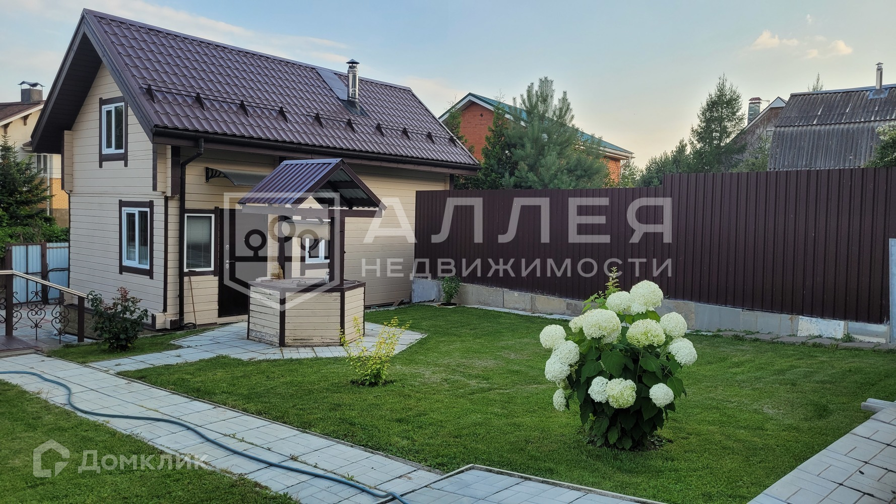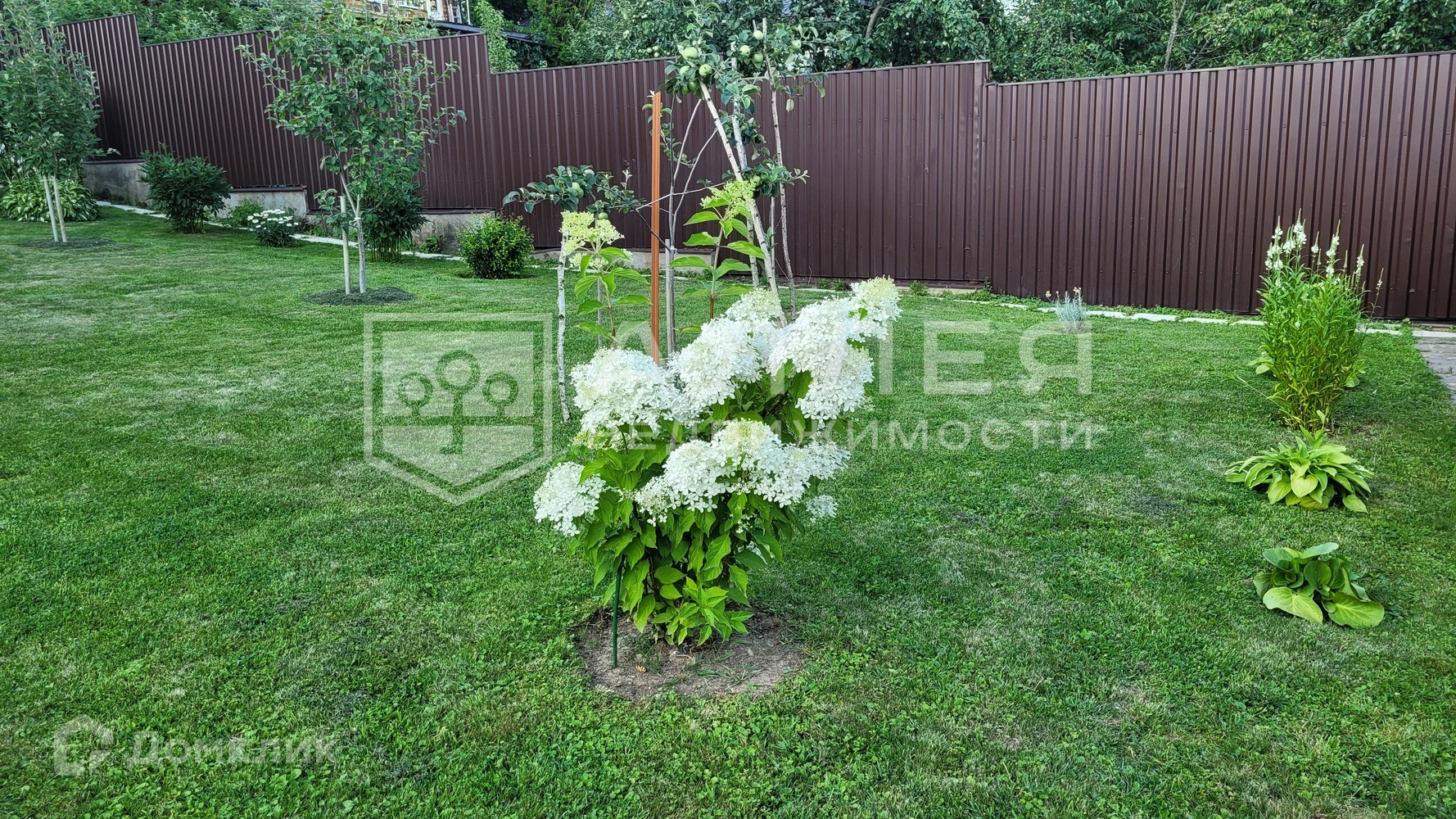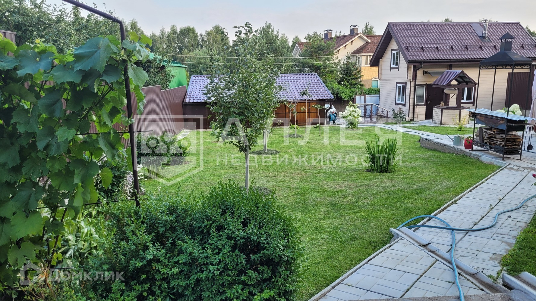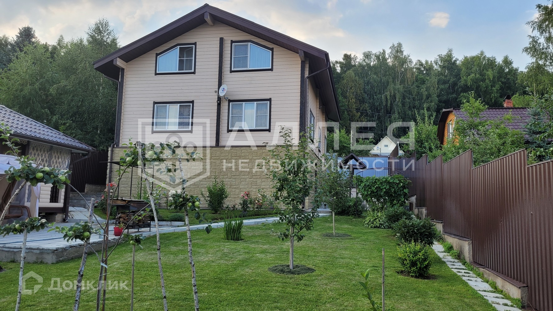 Участок: Разновысотный участок с уклоном в южную сторону, благоустроен, имеет несколько уровней-ступеней. На участке отдельно стоящая баня в два этажа (клеёный брус), беседка и большой автонавес для 3-х автомобилей и мототехники, паркинг, дорожки выложены камнем. Высажены плодовые деревья и цветники. Имеется два въезда с соседних улиц с откатными воротами.