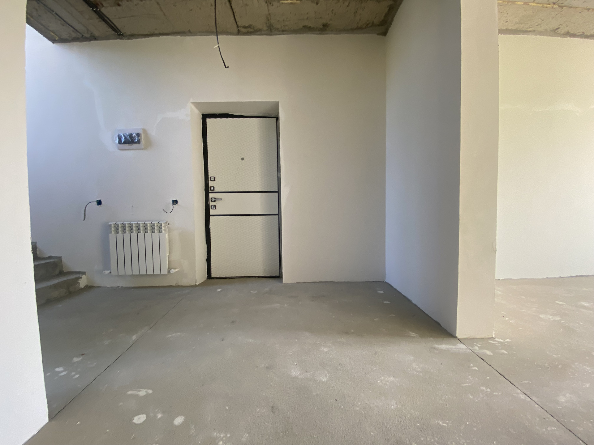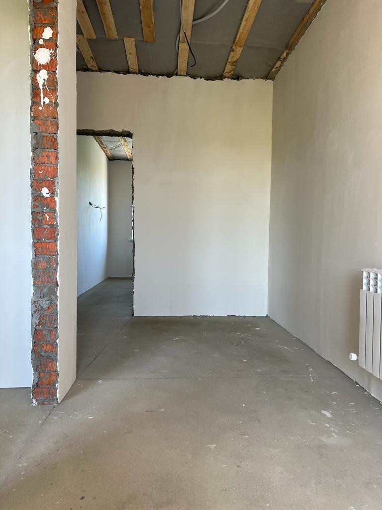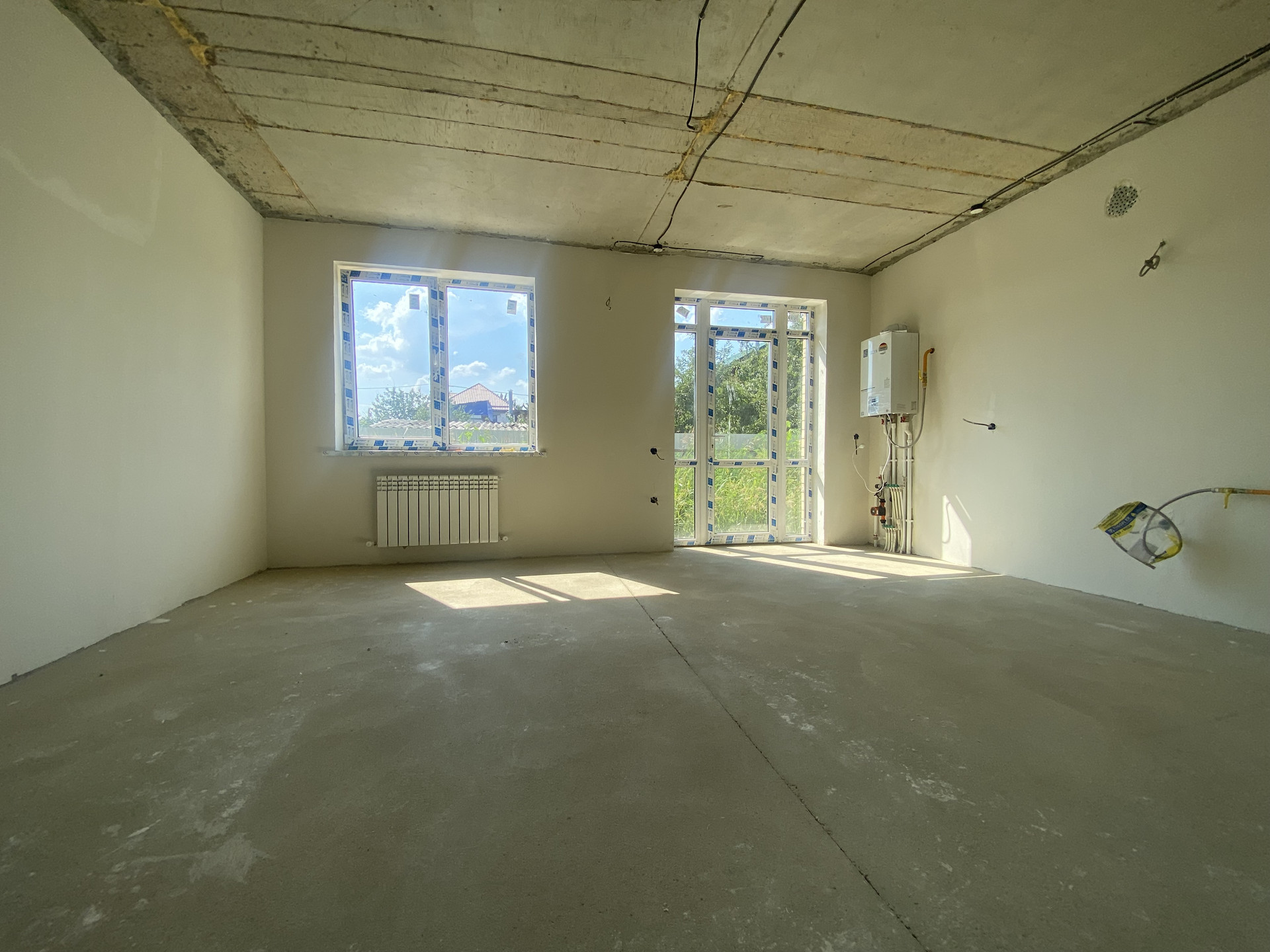 Дом — в предчистовой отделке: стяжка пола, штукатурка, разводка электрического, сантехнического, отопительного оборудования, радиаторы отопления, двухконтурный газовый котел.