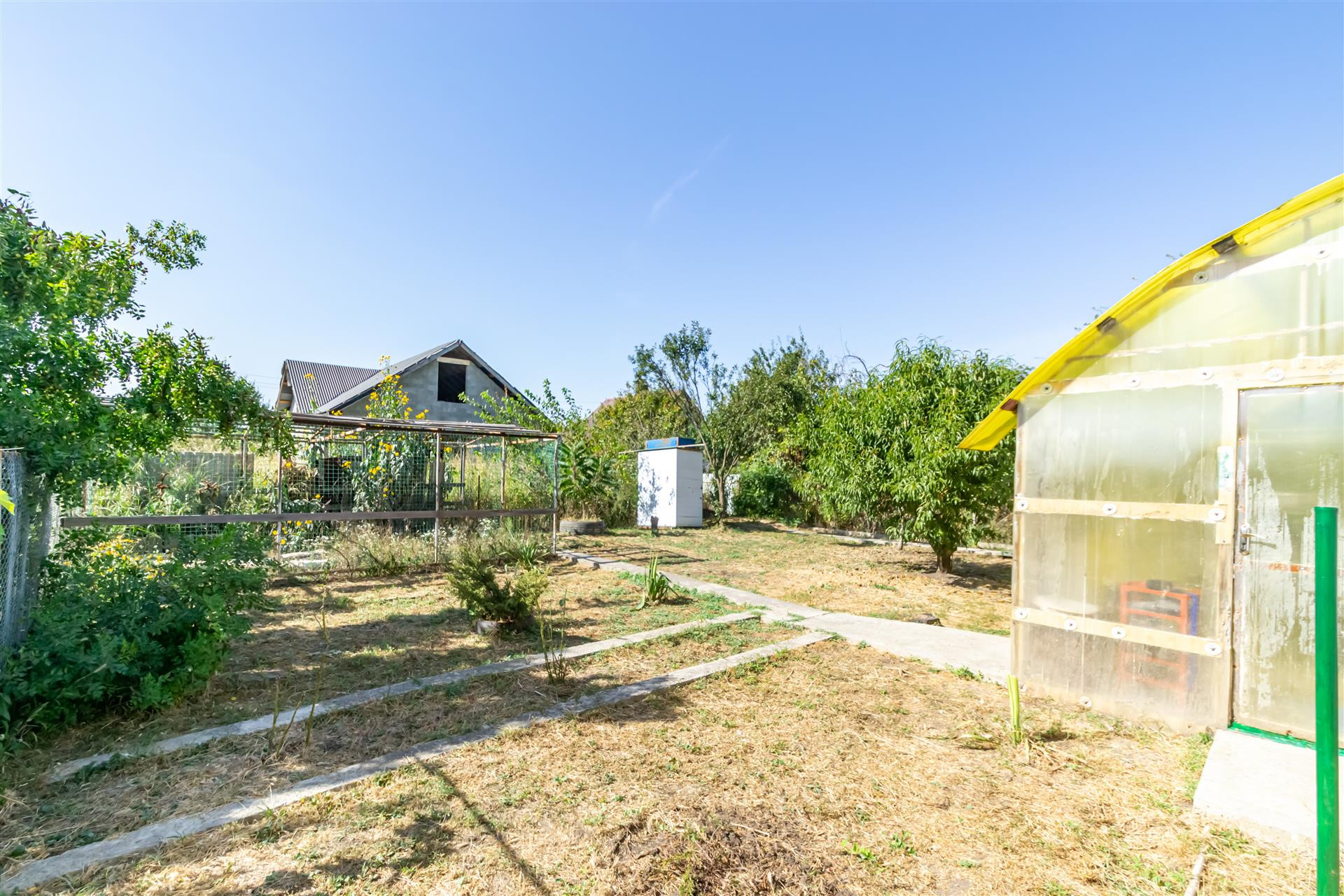 Во дворе растут молодые фруктовые деревья.