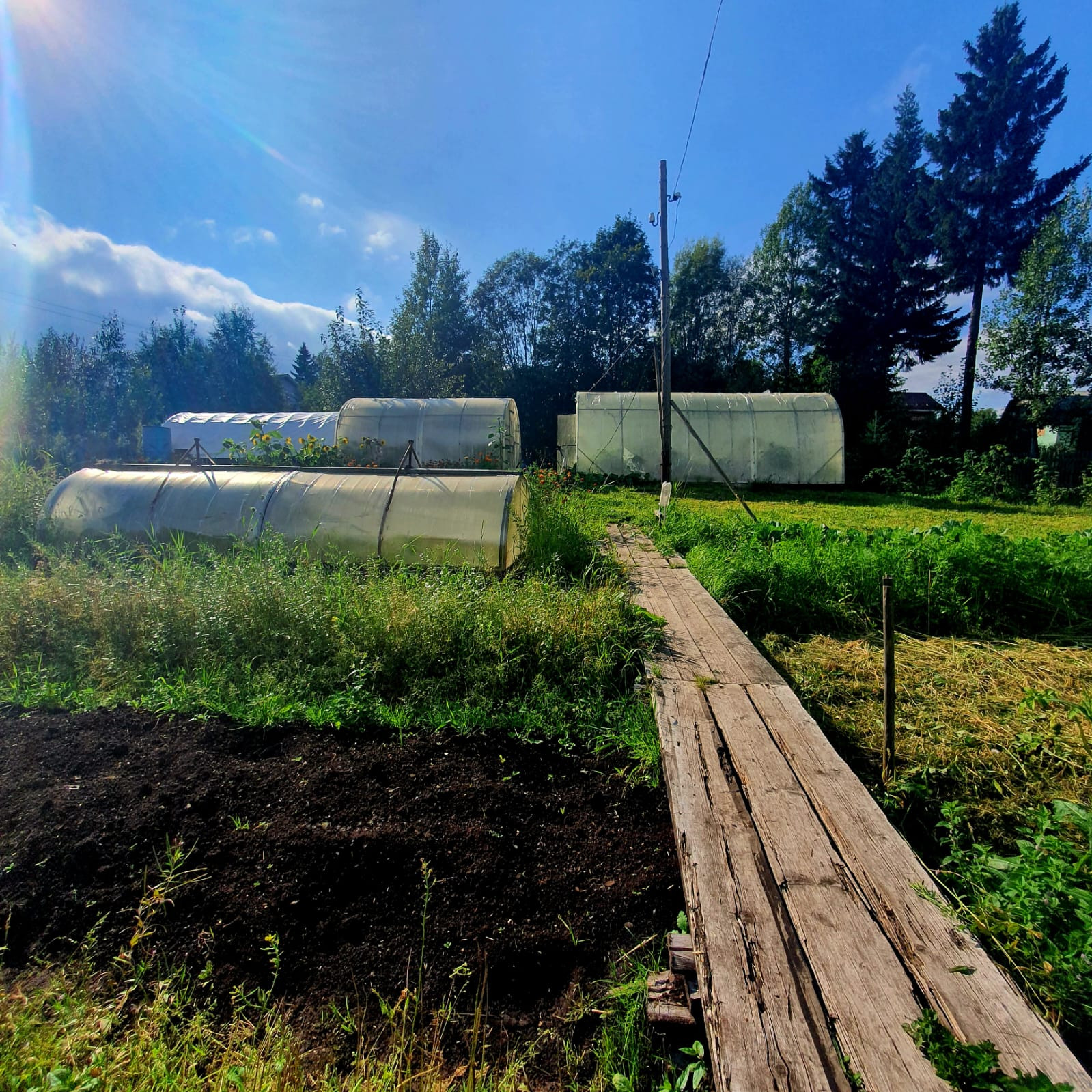 Участок разработан, сухой, земля очень плодородная, 3 теплицы с усиленным каркасом: