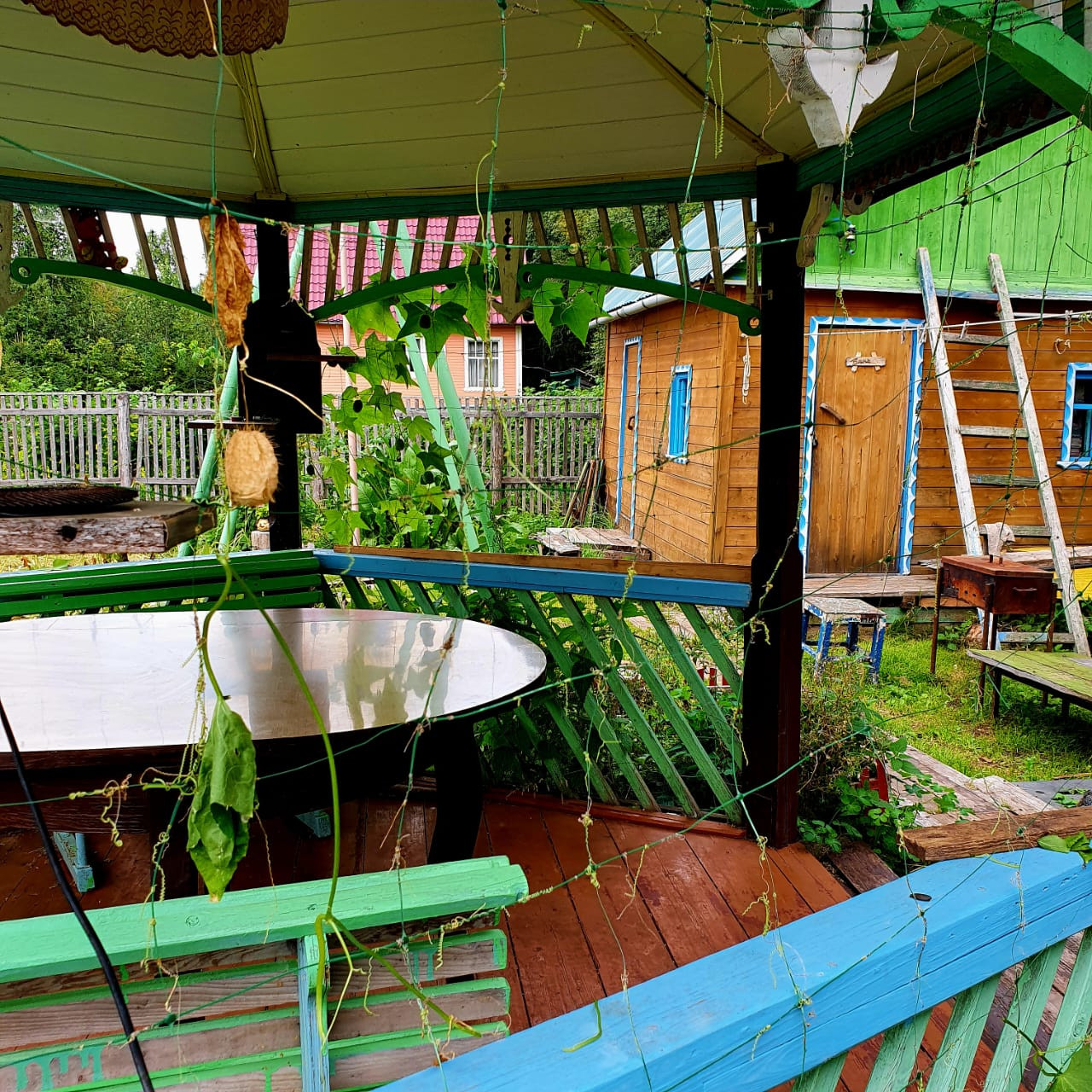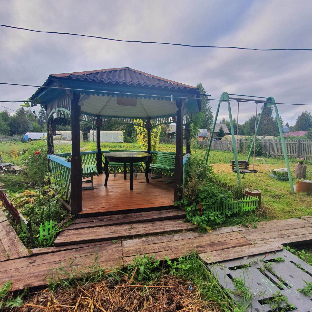 Уютная беседка с круглым столом и качелями для детей, сделают ваши посиделки уютными, а отдых незабываемым.