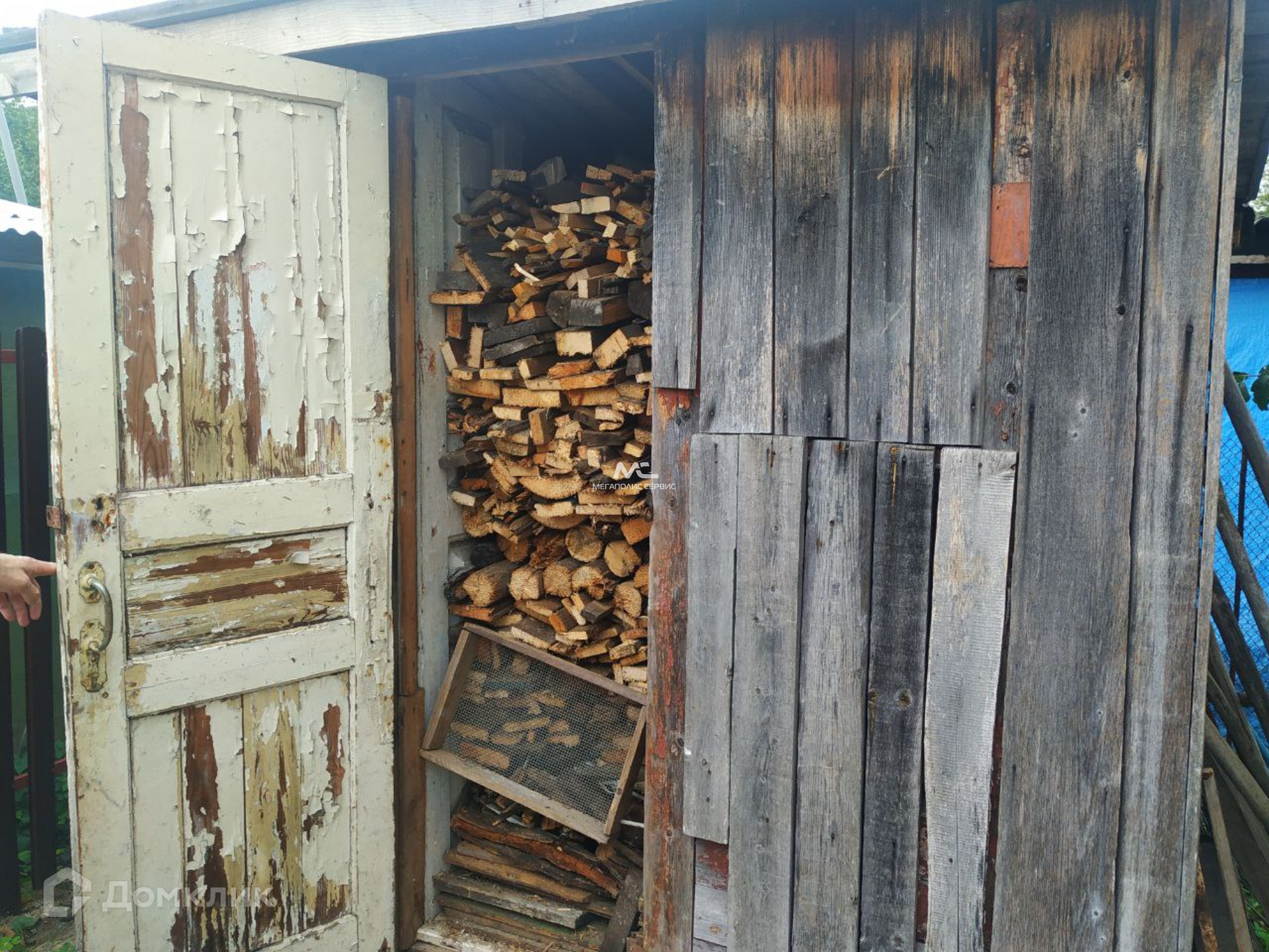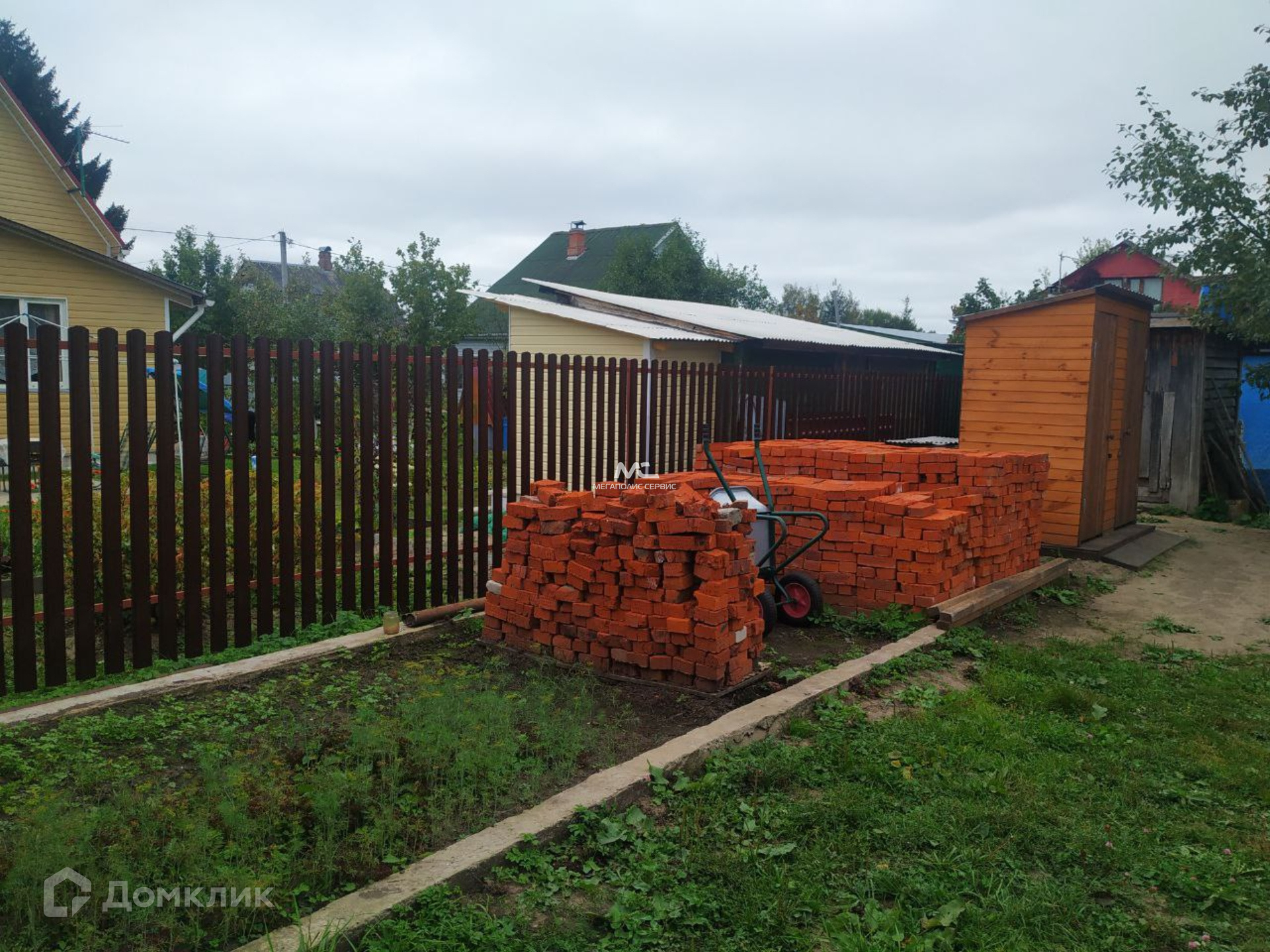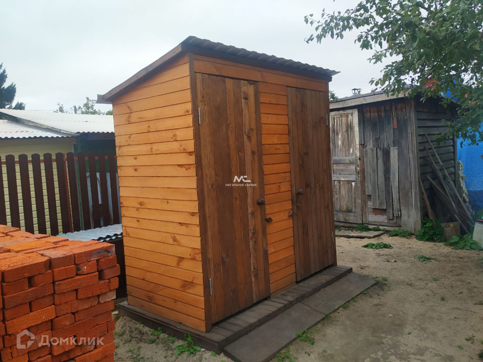 Будущим владельцам остаются строительные материалы. Также на участке расположен щитовой домик с печью и небольшой кухней, в котором можно жить круглый год.