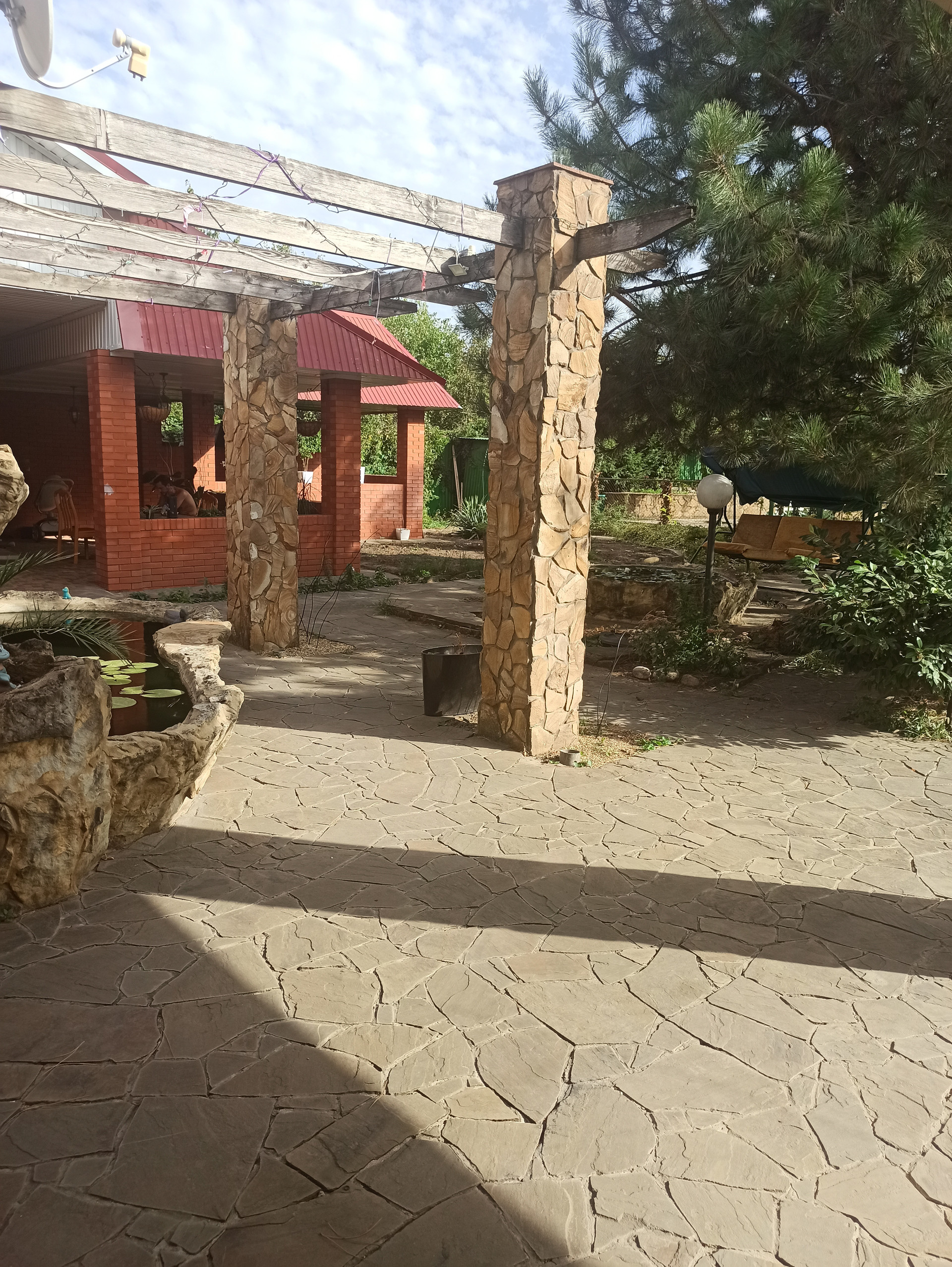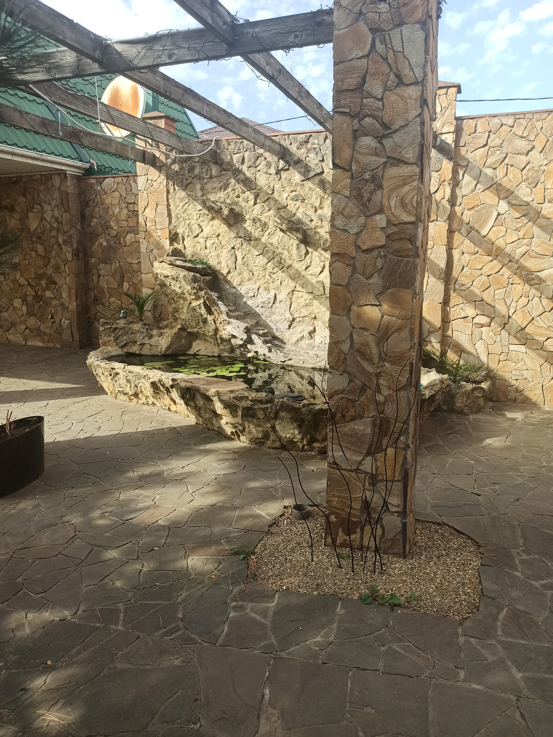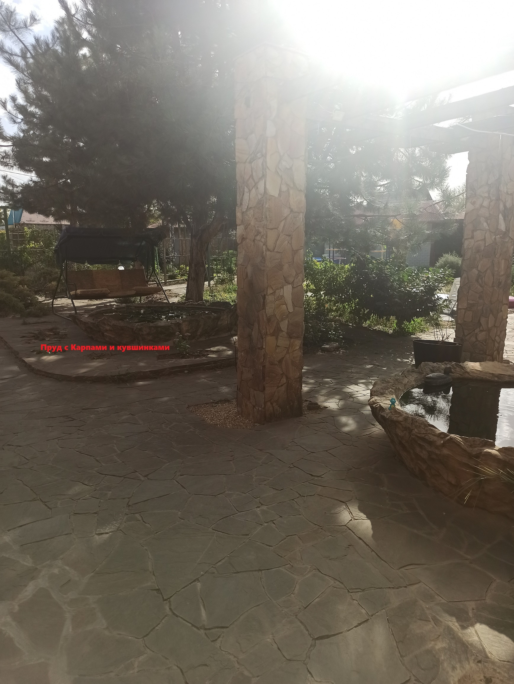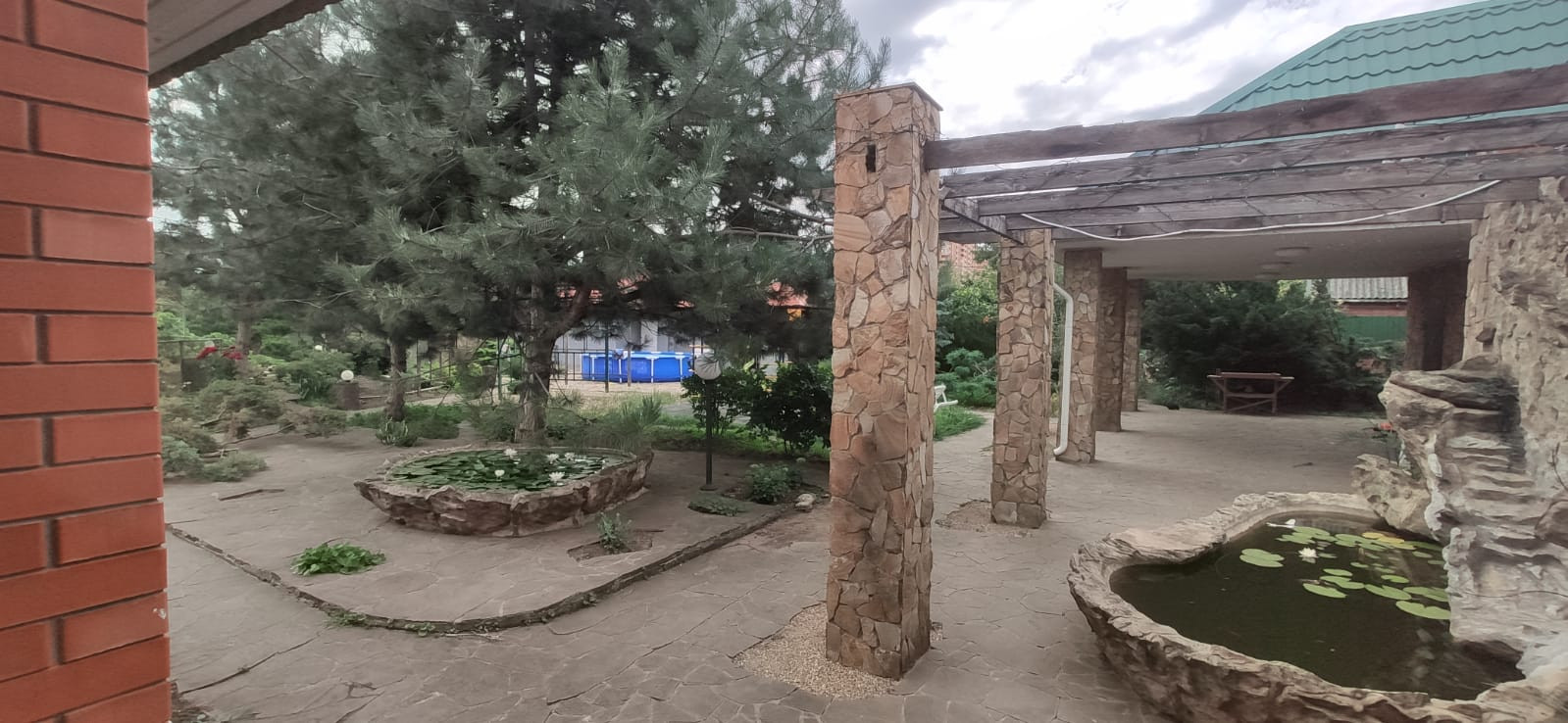 На участке много растений, бассейн, водопад с рыбками и пруд с рыбками.