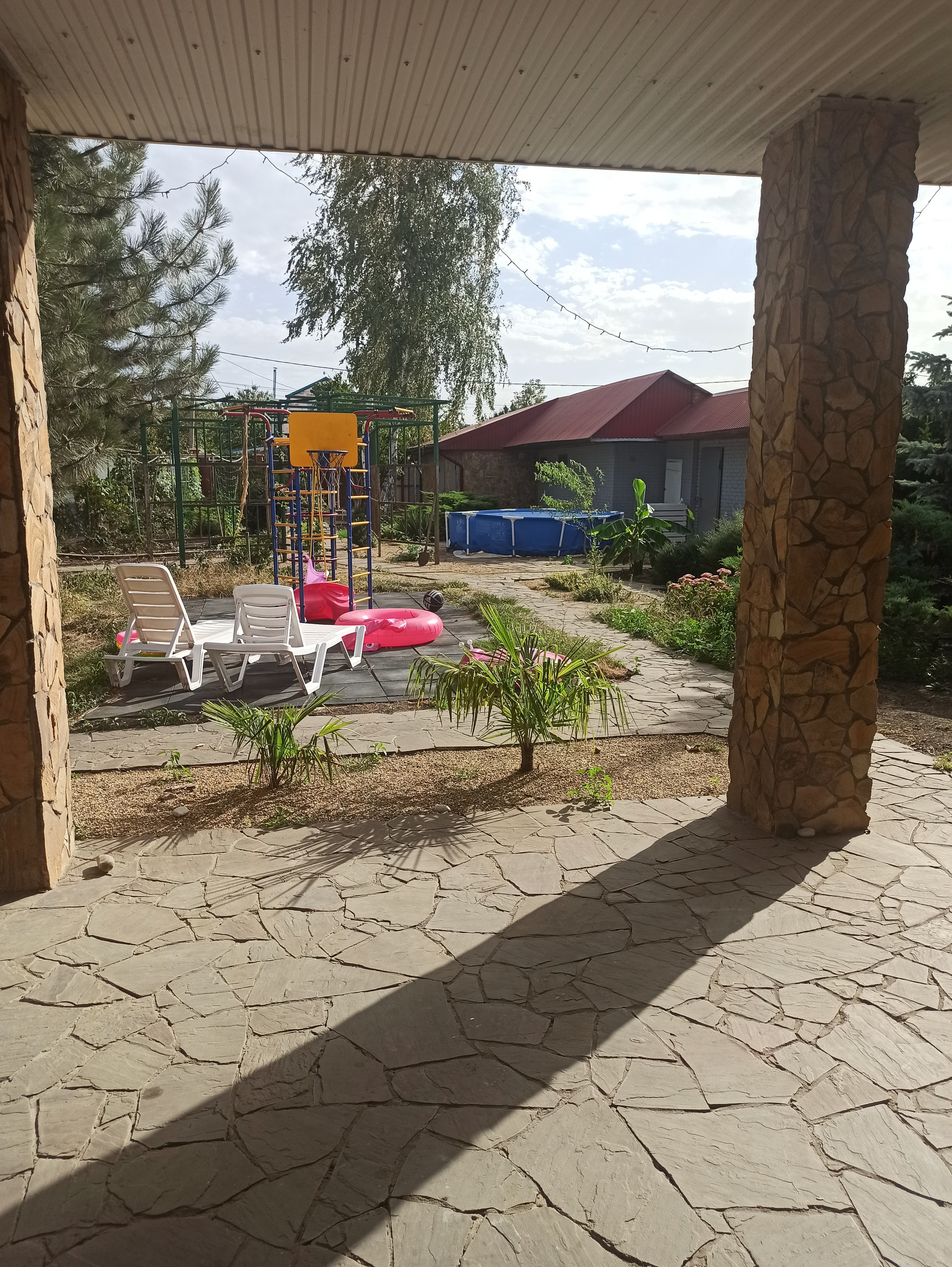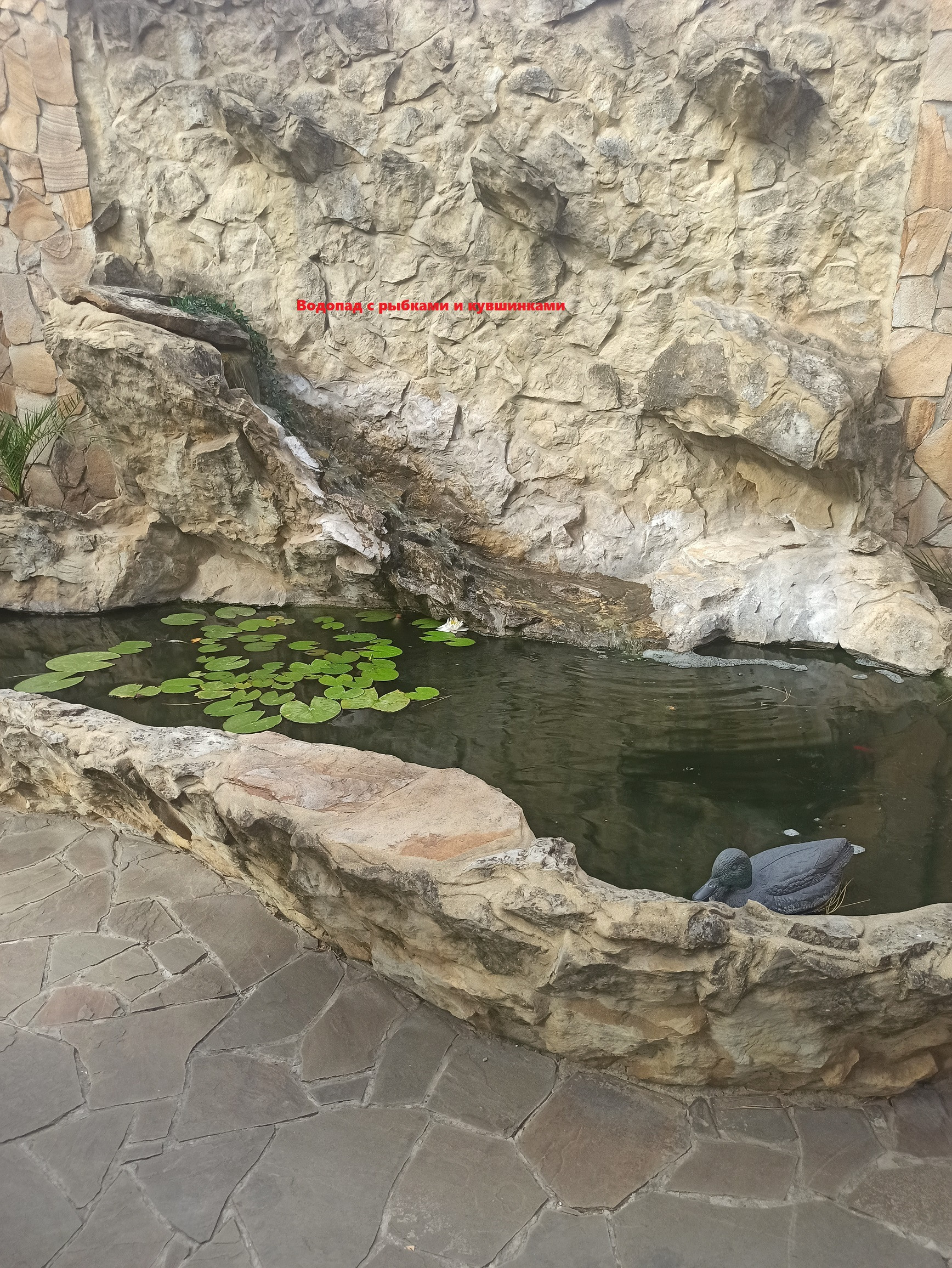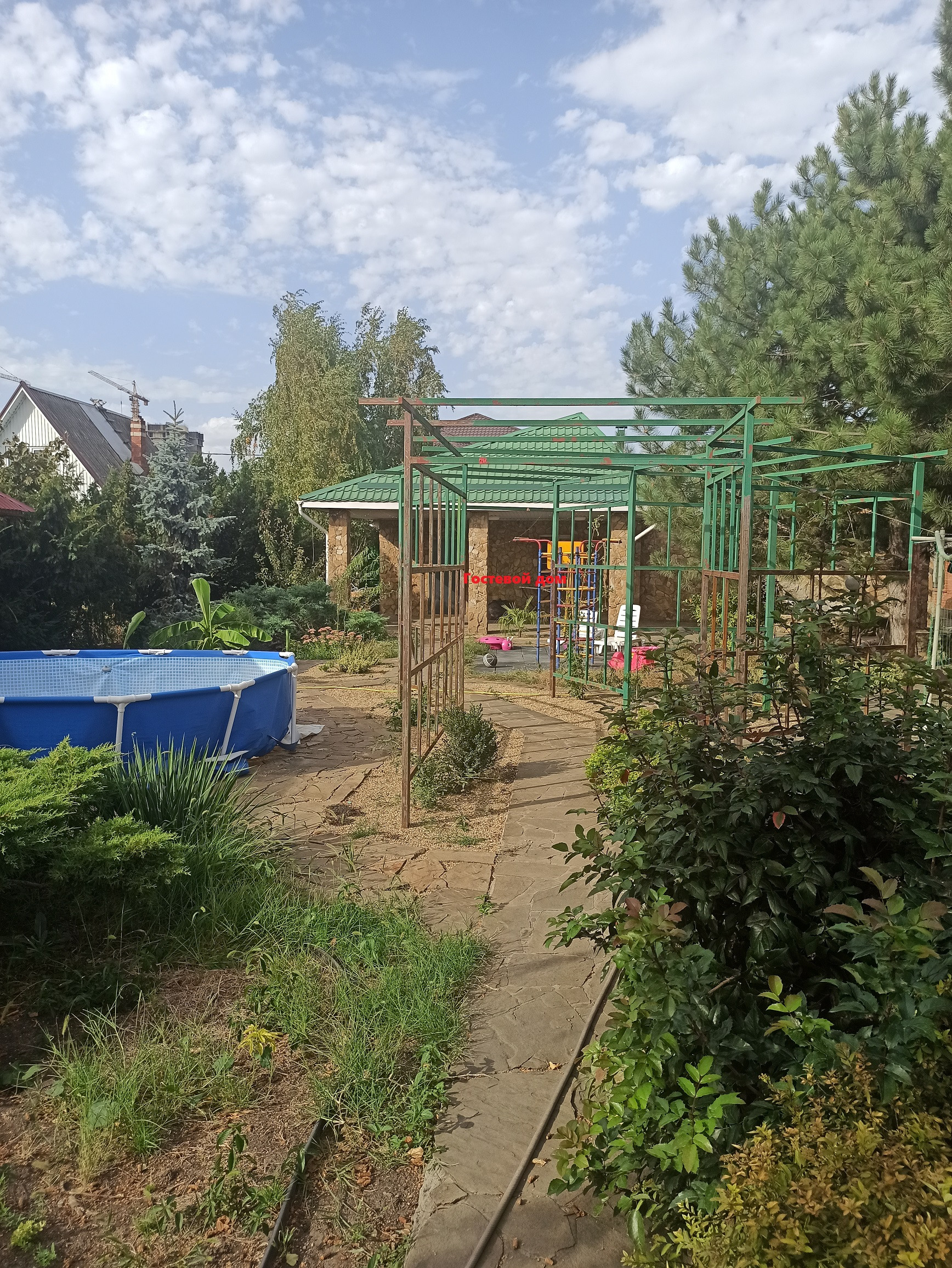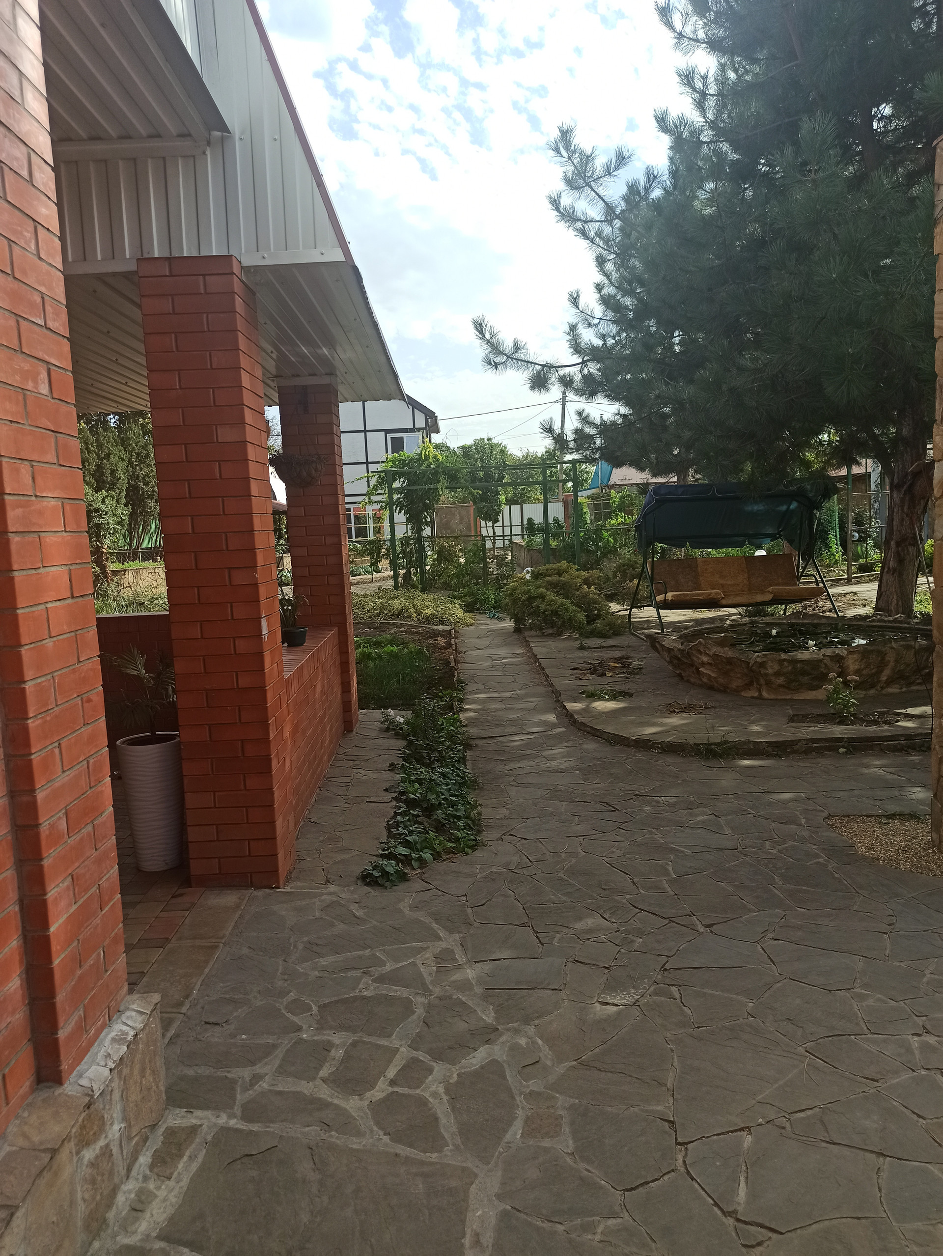 На участке много растений, бассейн, водопад с рыбками и пруд с рыбками.