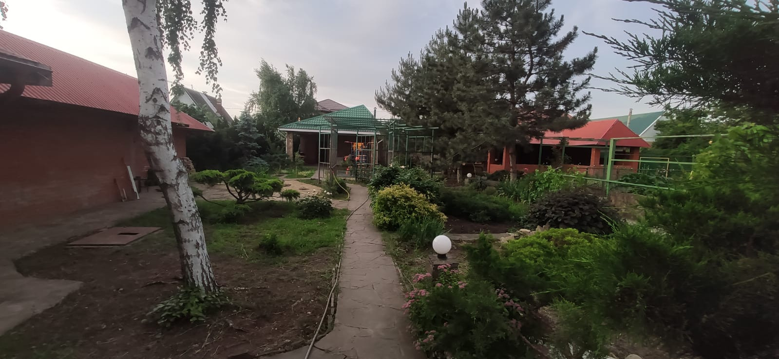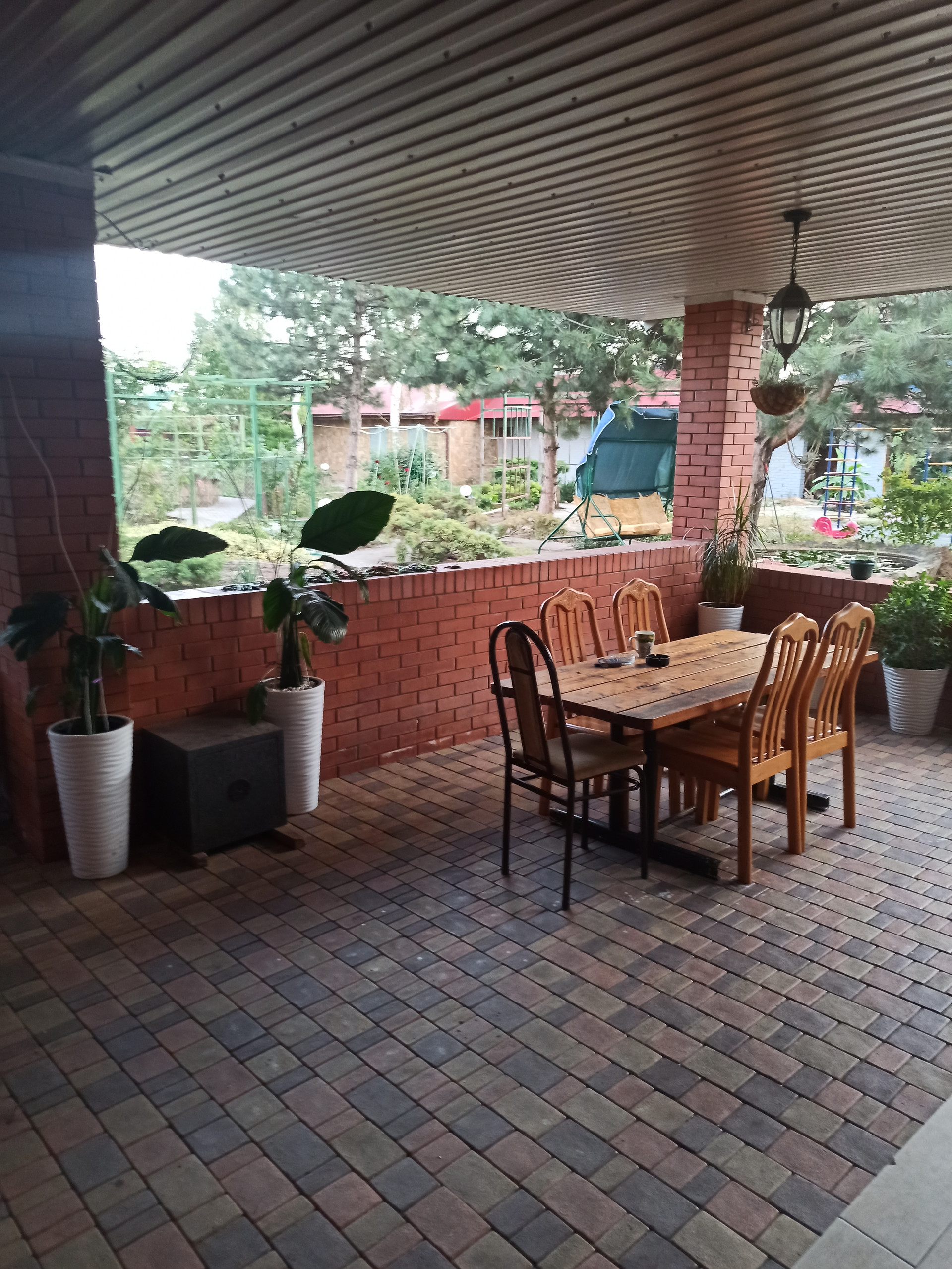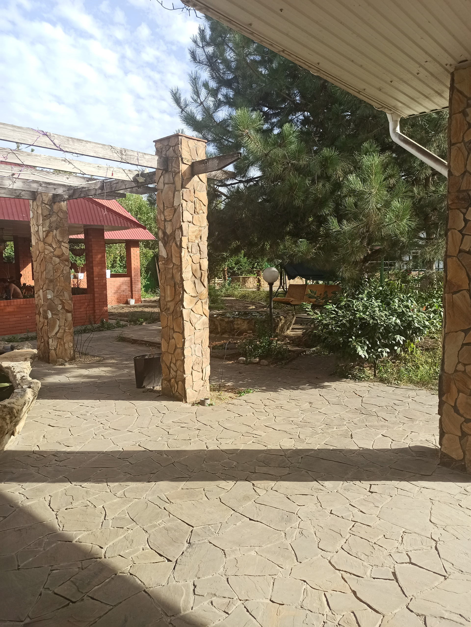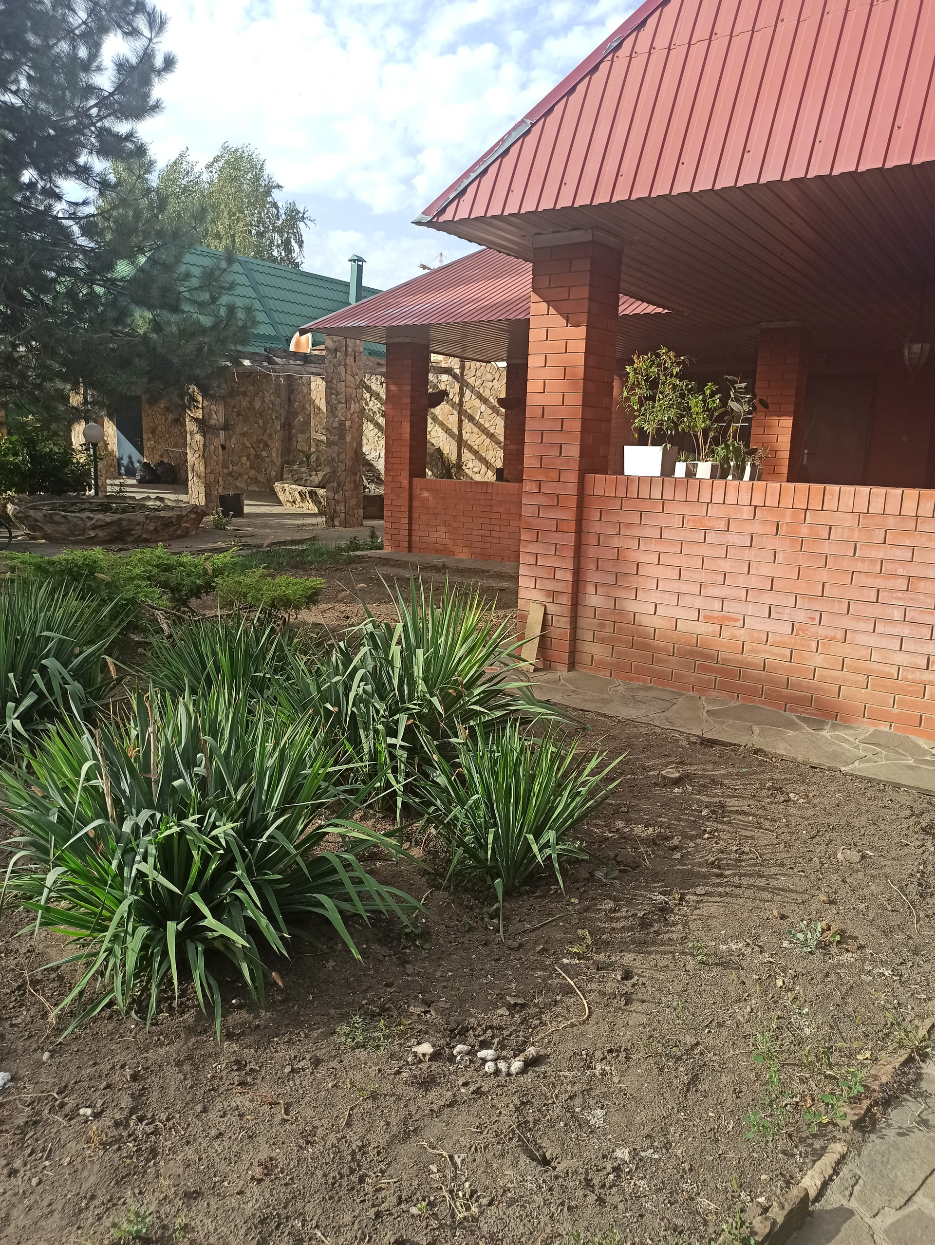 На участке много растений, бассейн, водопад с рыбками и пруд с рыбками.