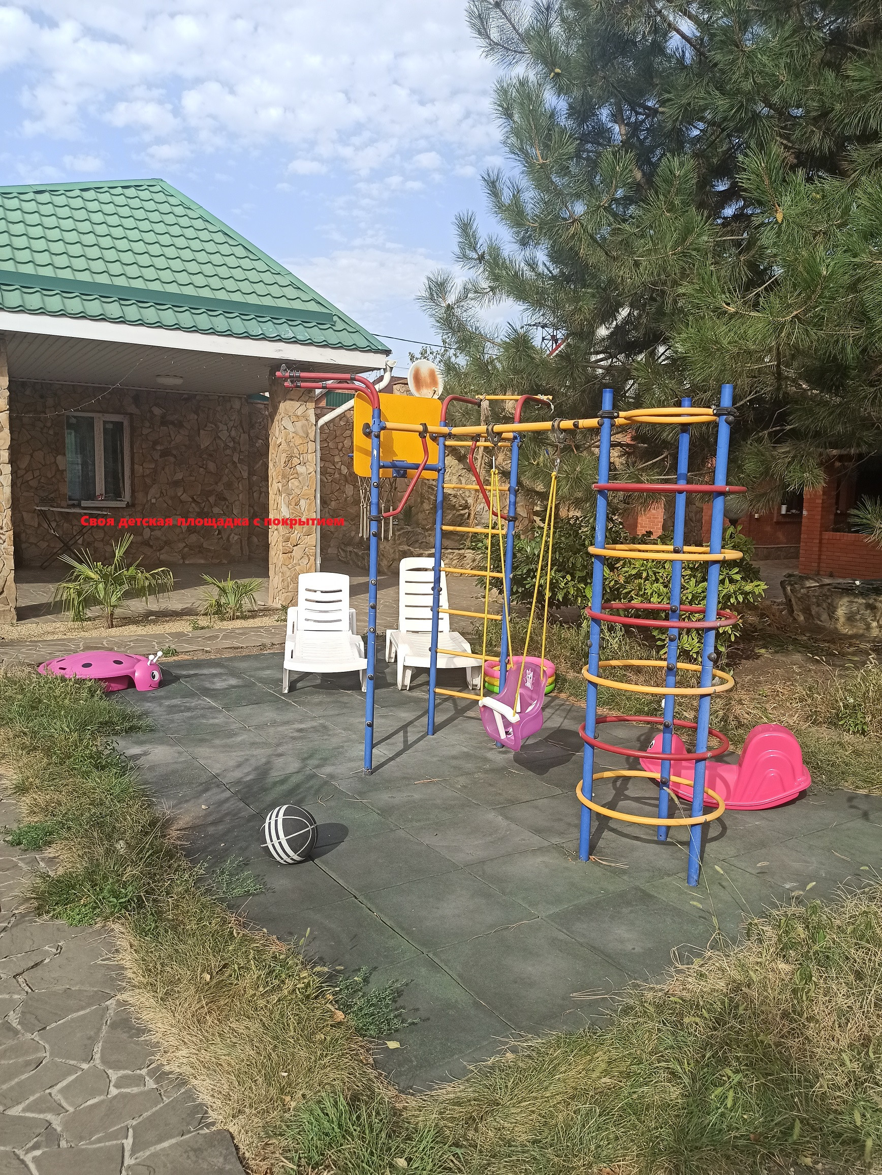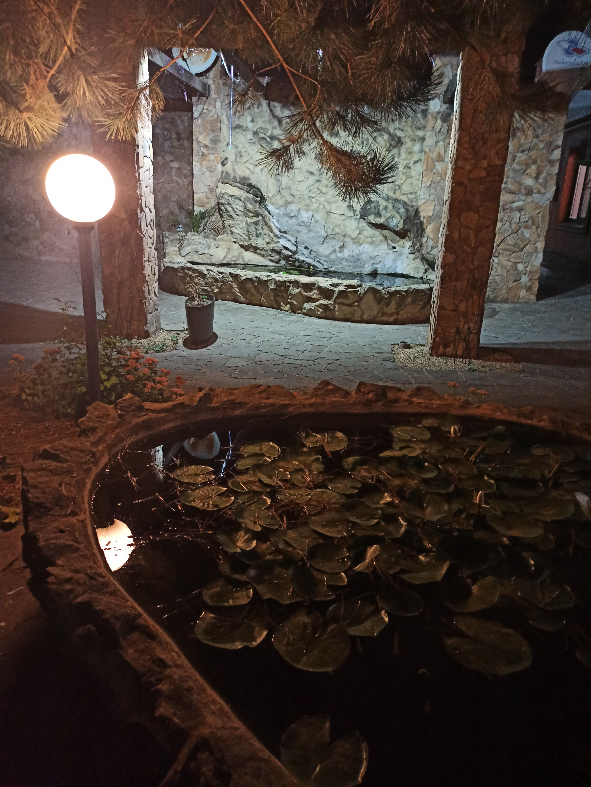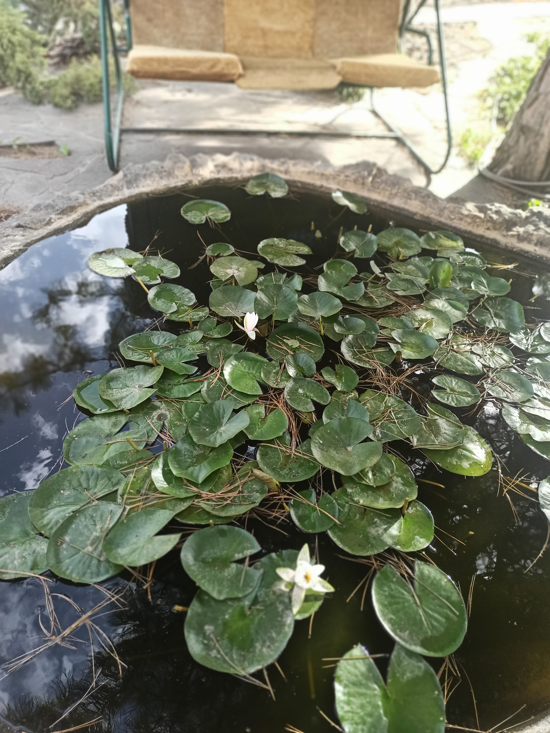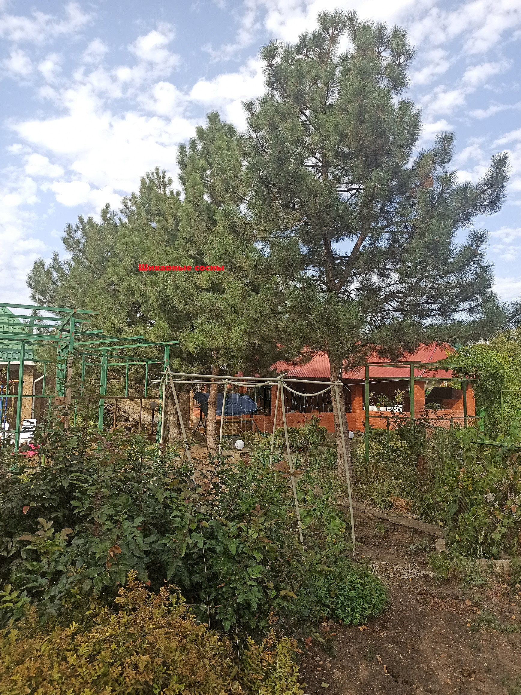 На участке много растений, бассейн, водопад с рыбками и пруд с рыбками.