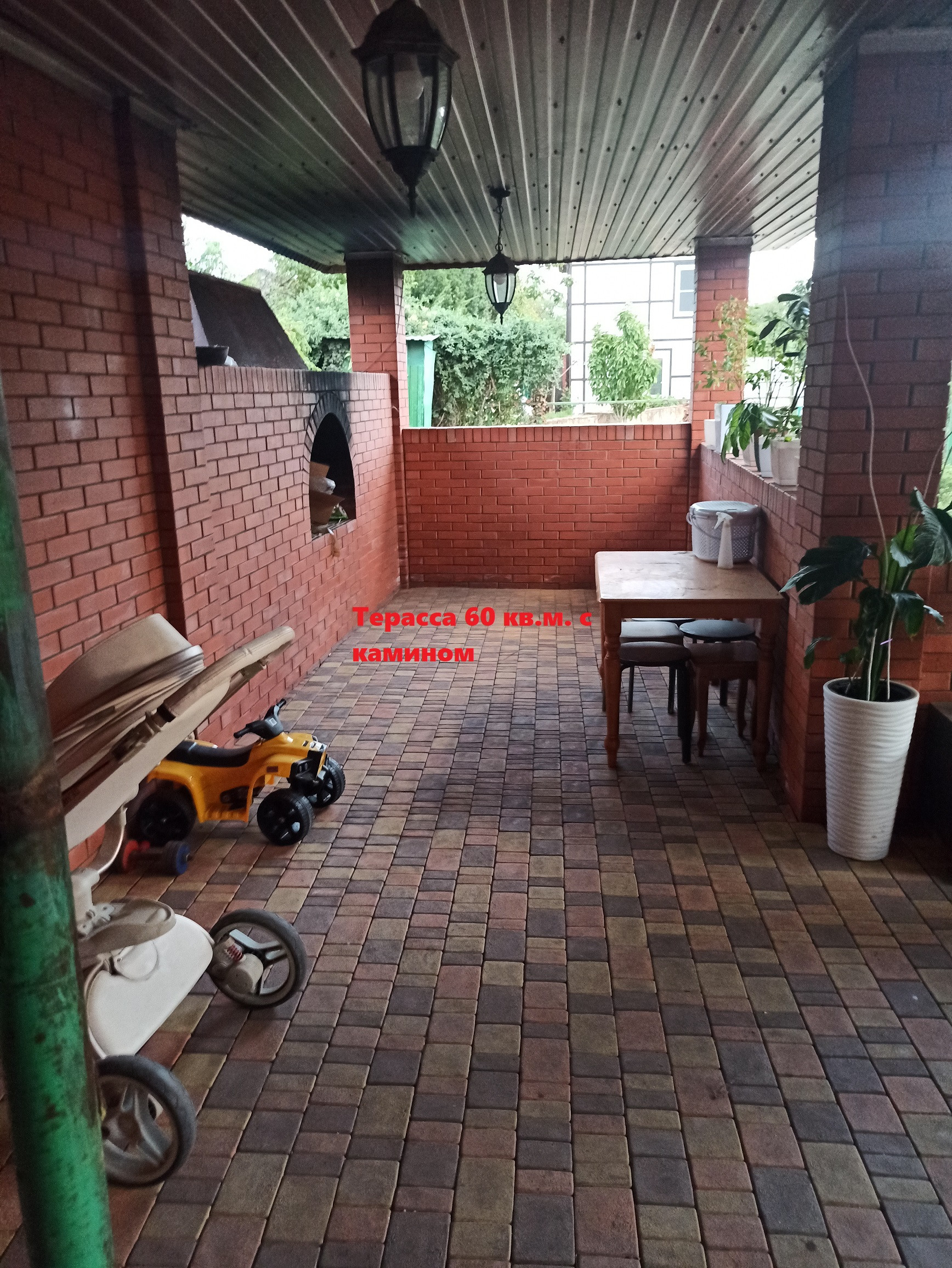 1- Жилой дом 60 кв.м. в 1,5 кирпича ( очень толстые стены ) с камином. 2 комнаты, кухня, прихожая, сан.узел. Терраса 60 кв.м. с камином. Чердак 60 кв.м. с перекрытием, есть возможность обустроить 2 ой этаж.