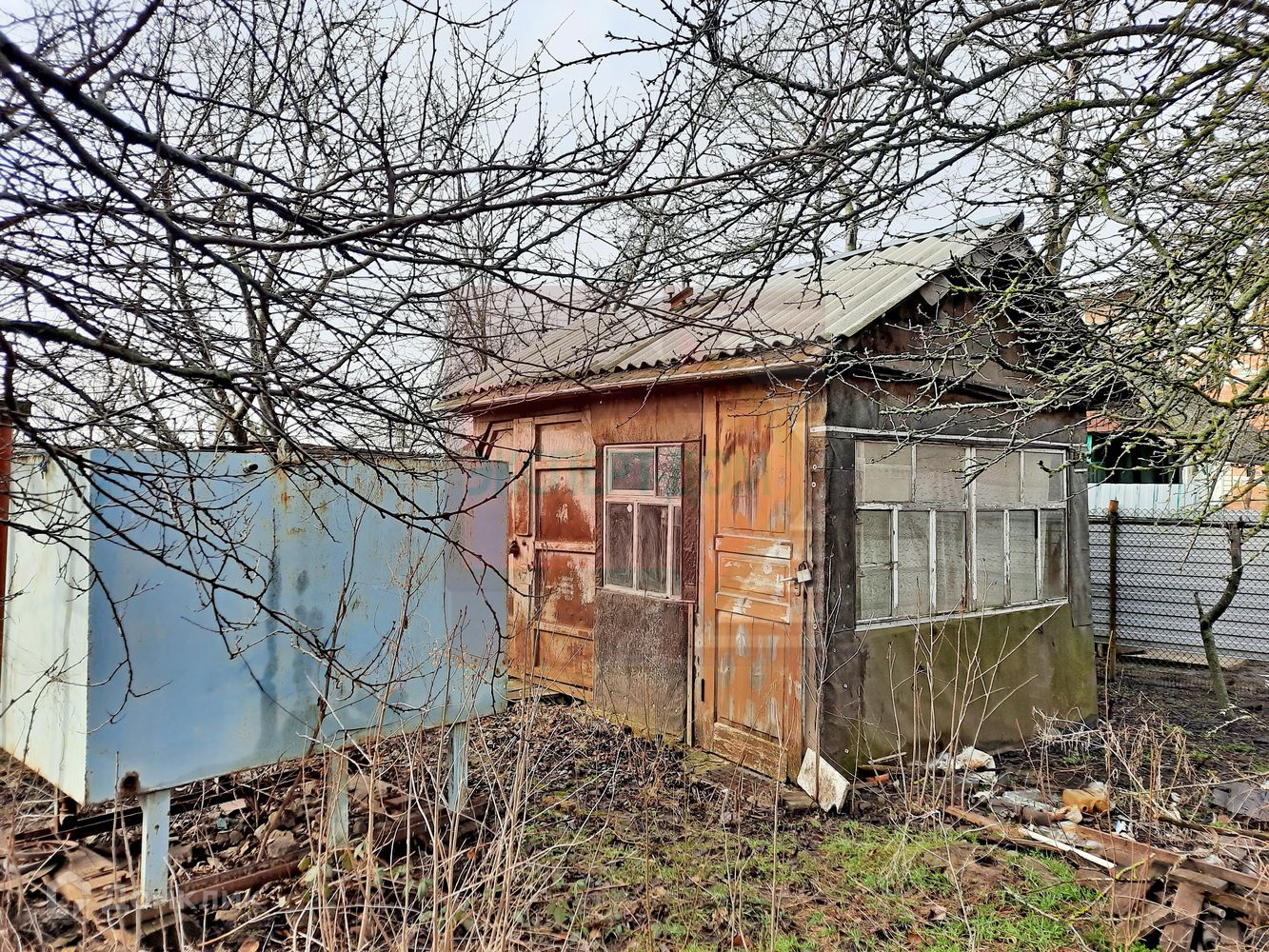 На участке флигель и 20-ти тонный контейнер. Есть фундамент для дальнейшего строительства небольшого дома. Также имеется металлический резервуар для хранения воды.