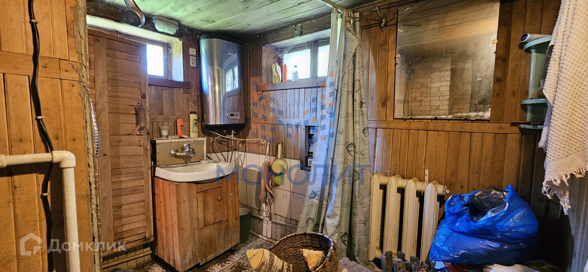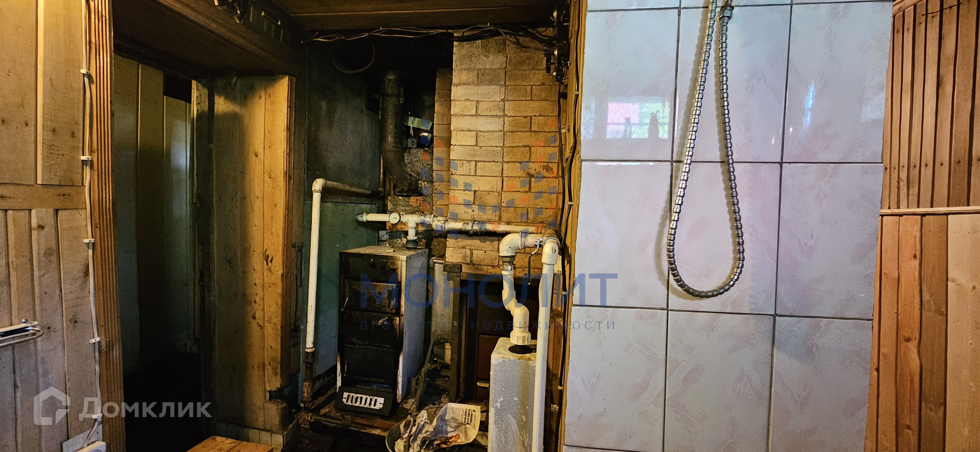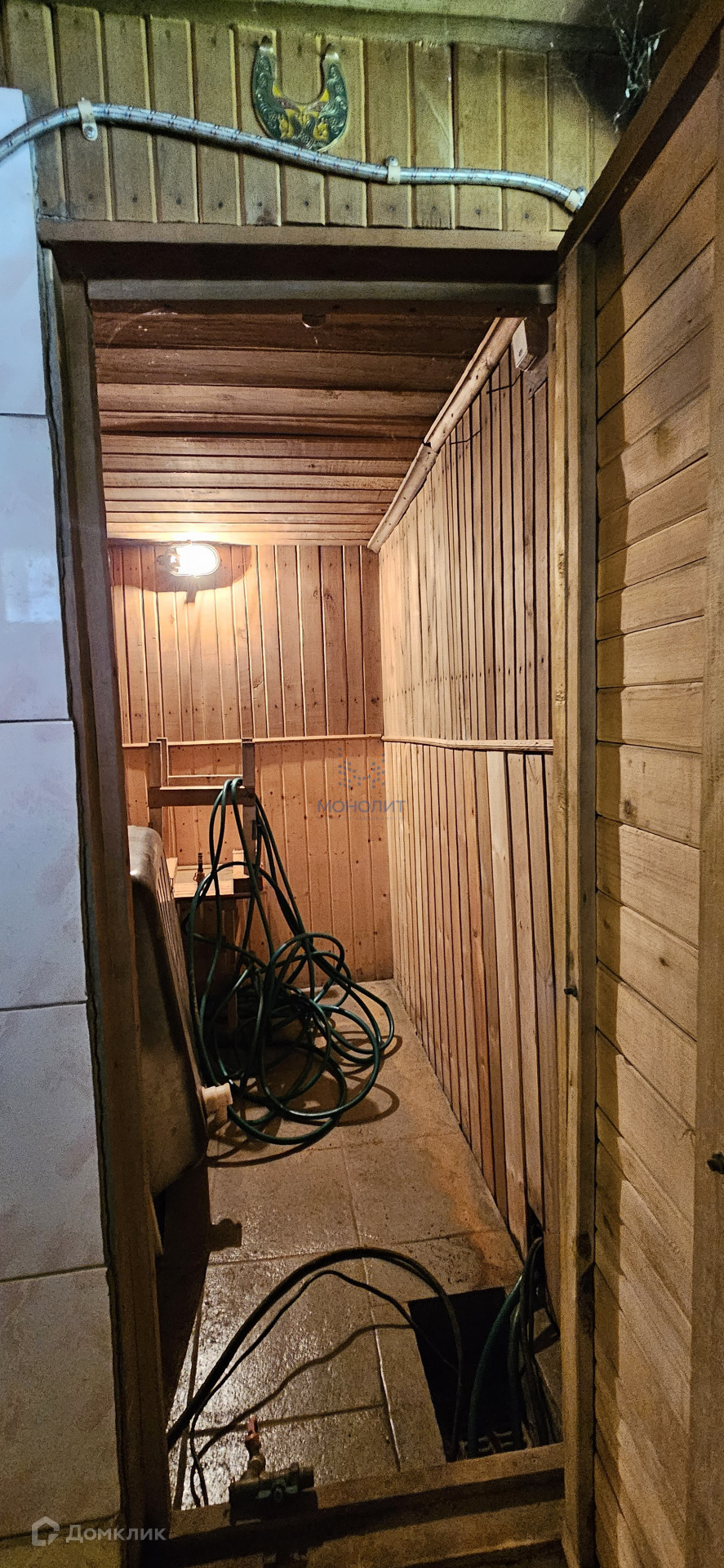 Дом бревенчатый обшитый вагонкой и покрашен. Дом стоит на 9ти метровых сваях. Высокий цокольный этаж, в котором расположены сауна, гараж и другие подсобные помещения. Есть так же погребок.