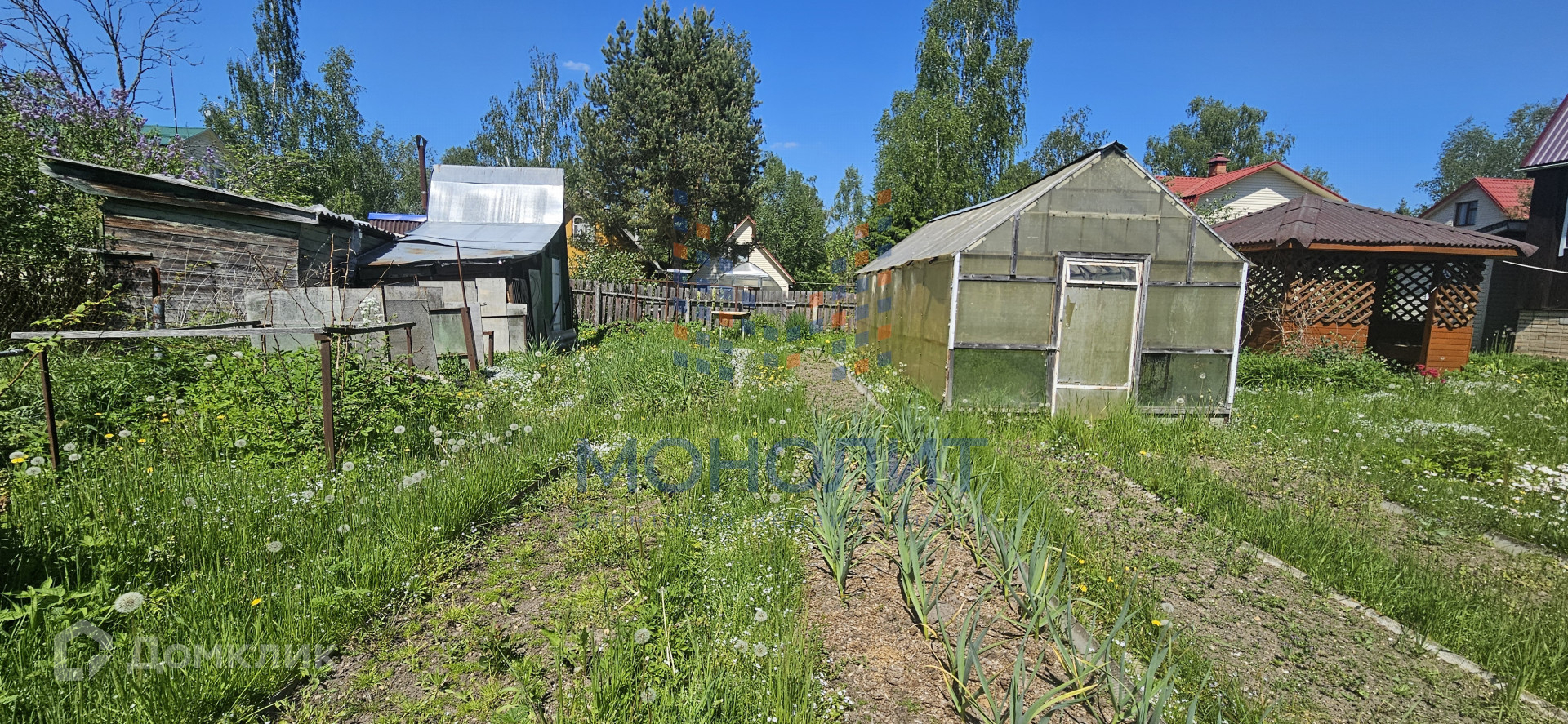 Садовый участок ровной правильной формы - 6,5 соток. На участке стоит теплица и аккуратно огороженные грядки. Растёт клубника (цветёт, ягода будет), крыжовник, слива, яблонька, смородина, жимолость.