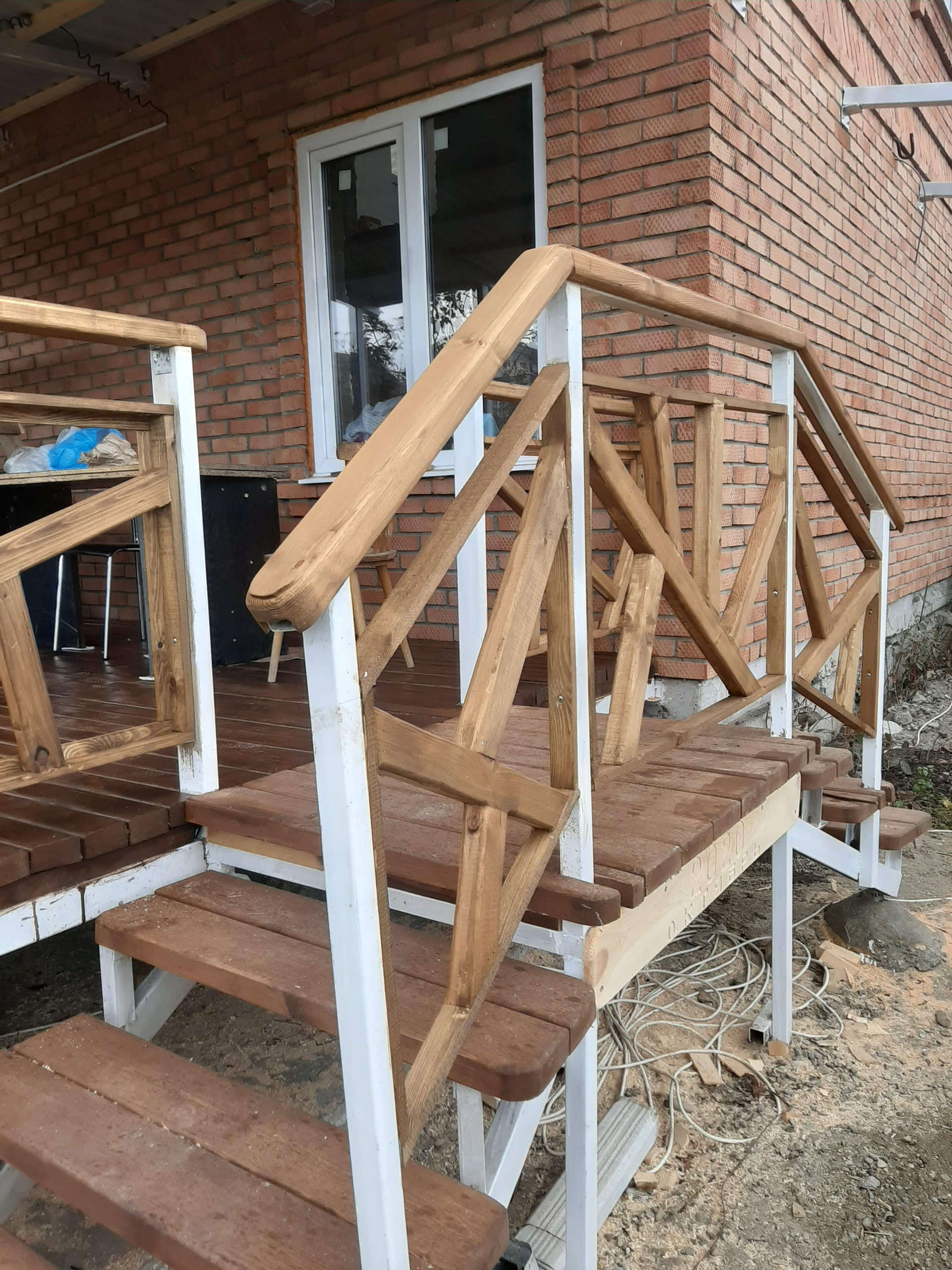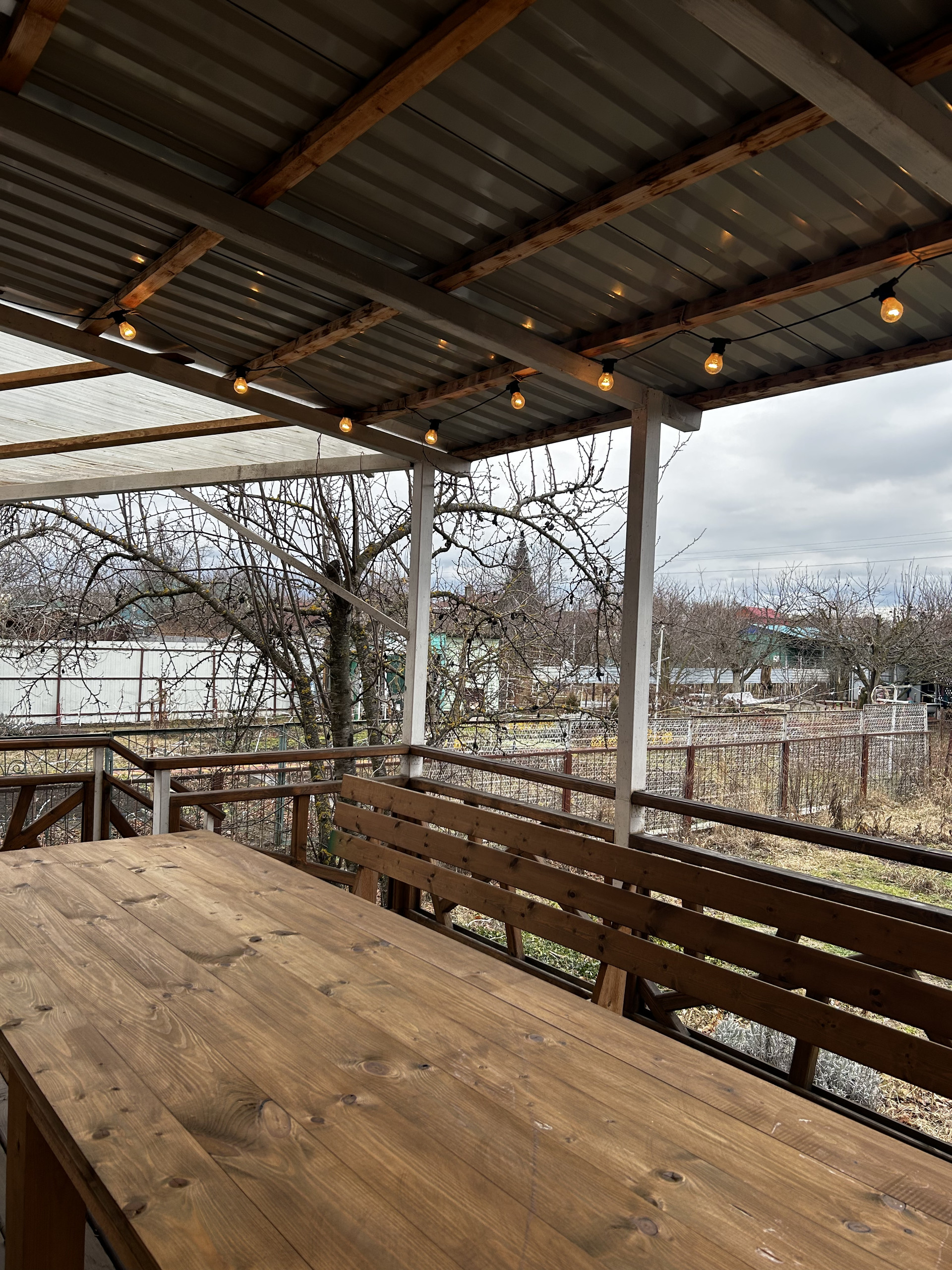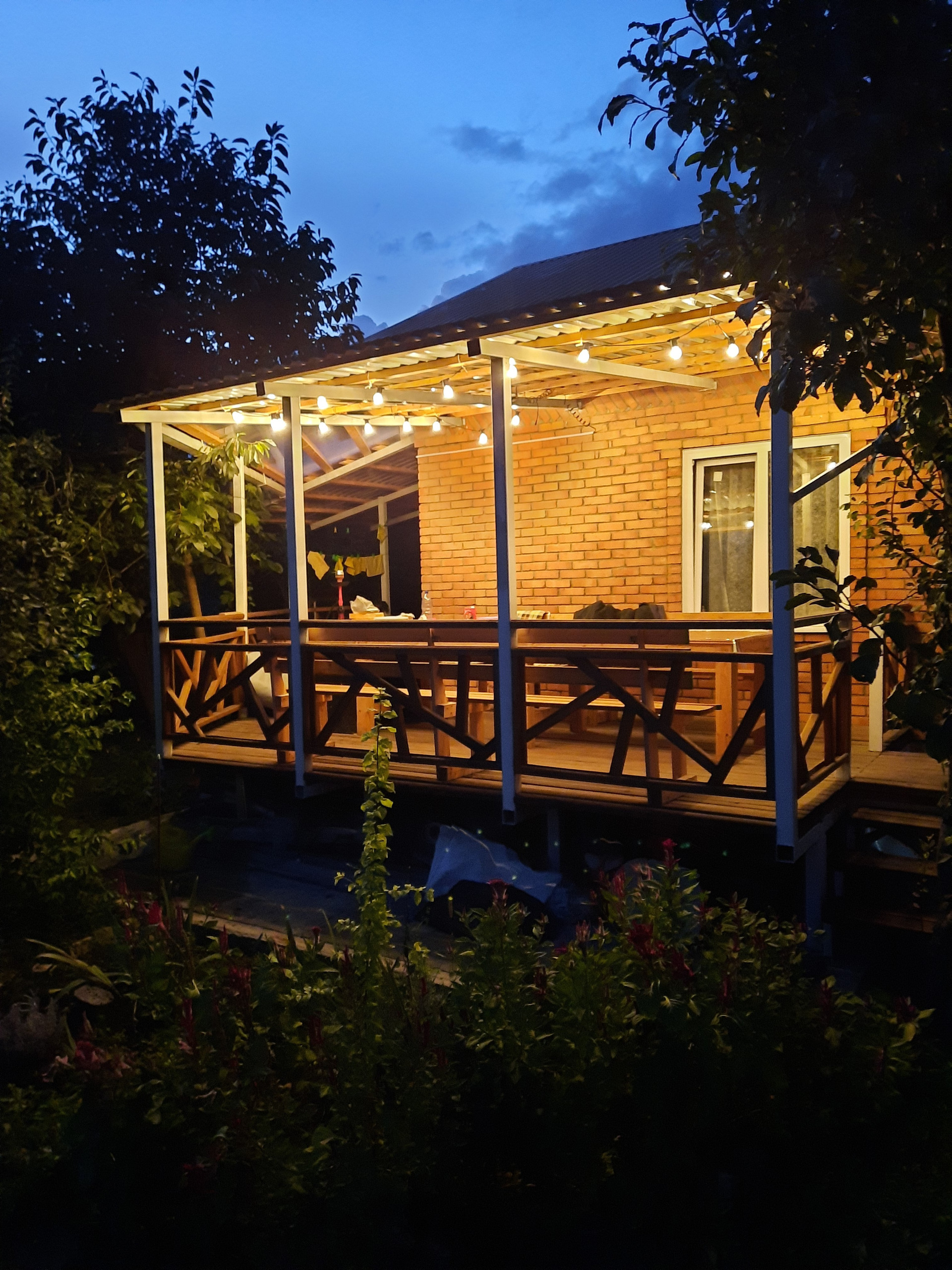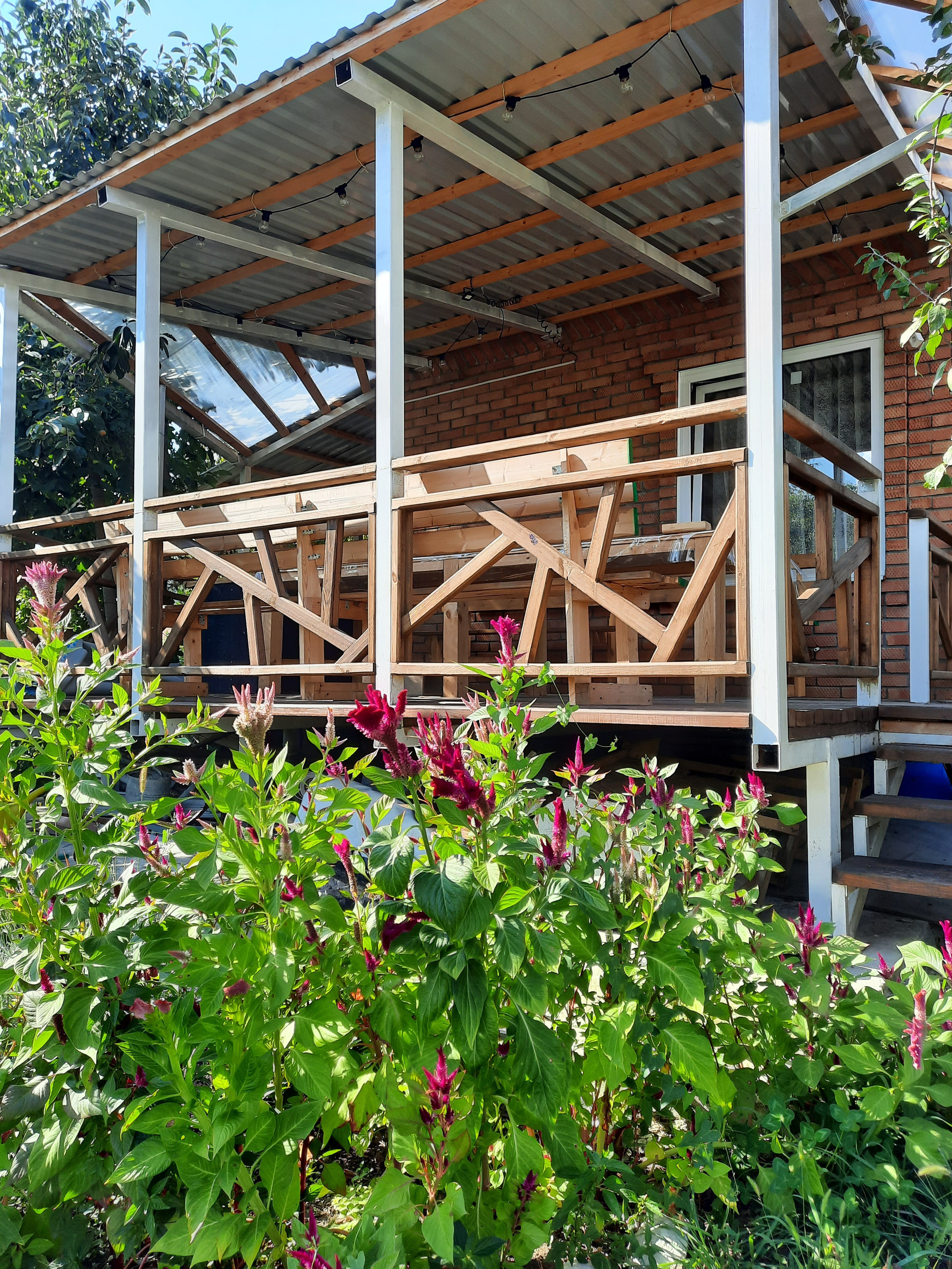 Красивая эксклюзивная веранда 25м2 из натурального дерева. Установлена на металлических столбах с фундаментом, под всей верандой залитая бетоном площадка. При желании можно утеплить сендвич-панелями либо достроить стены из газоблока и расширить дом.