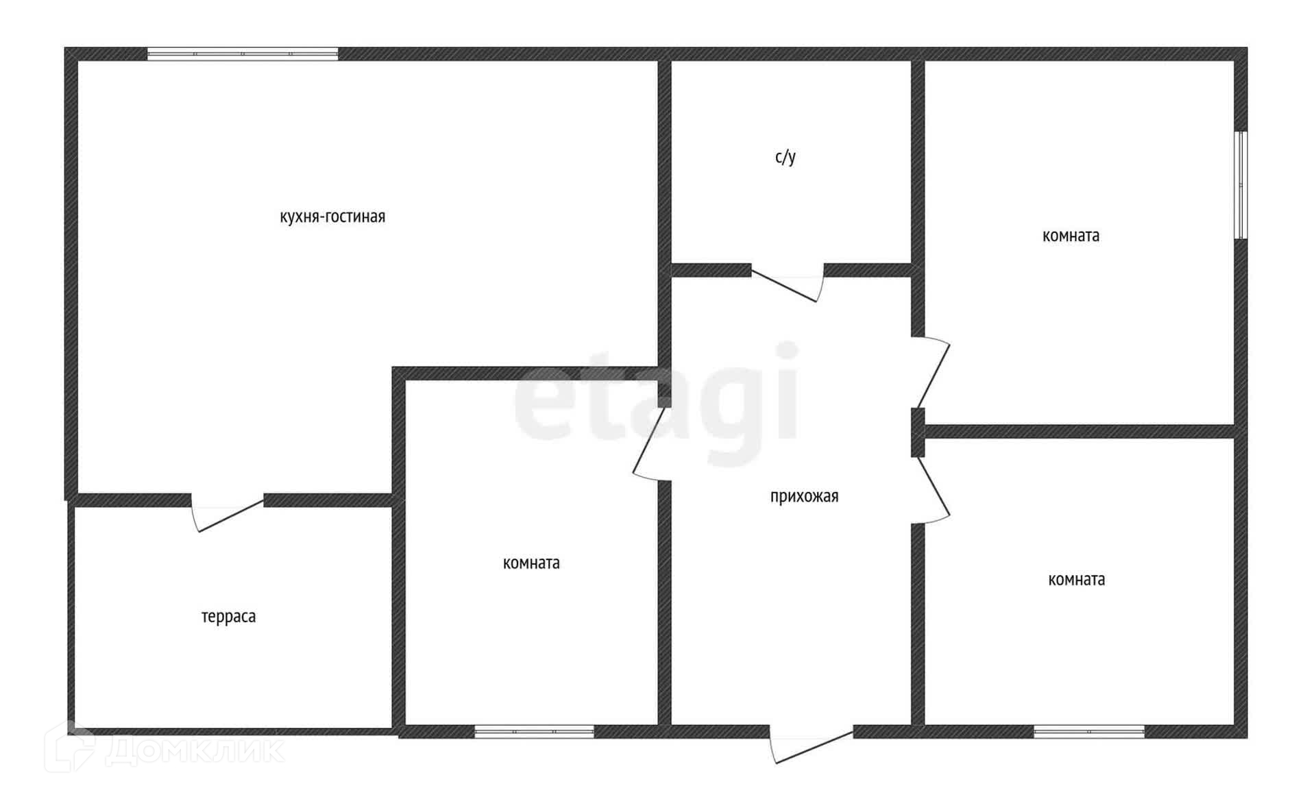 Планировка: три спальни, кухня-гостиная, коридор, санузел, терраса. Выход на террасу из кухни.