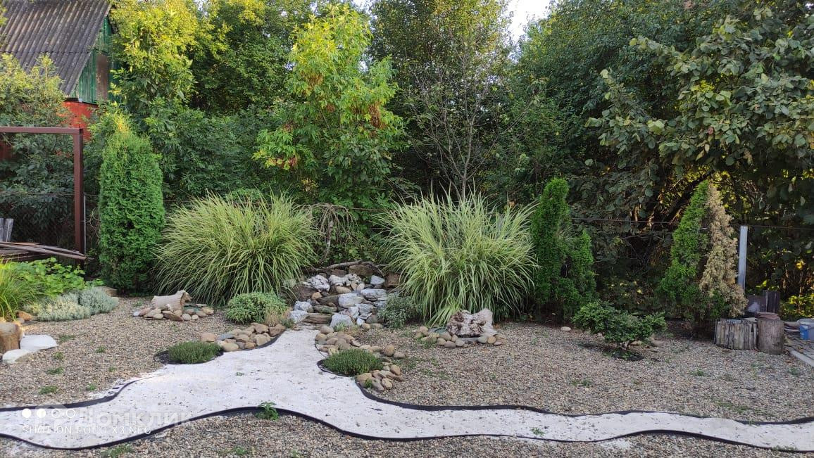 Участок с ландшафтным дизайном, много хвойных экзотических растений, но есть и плодовые деревья, двор в плитке