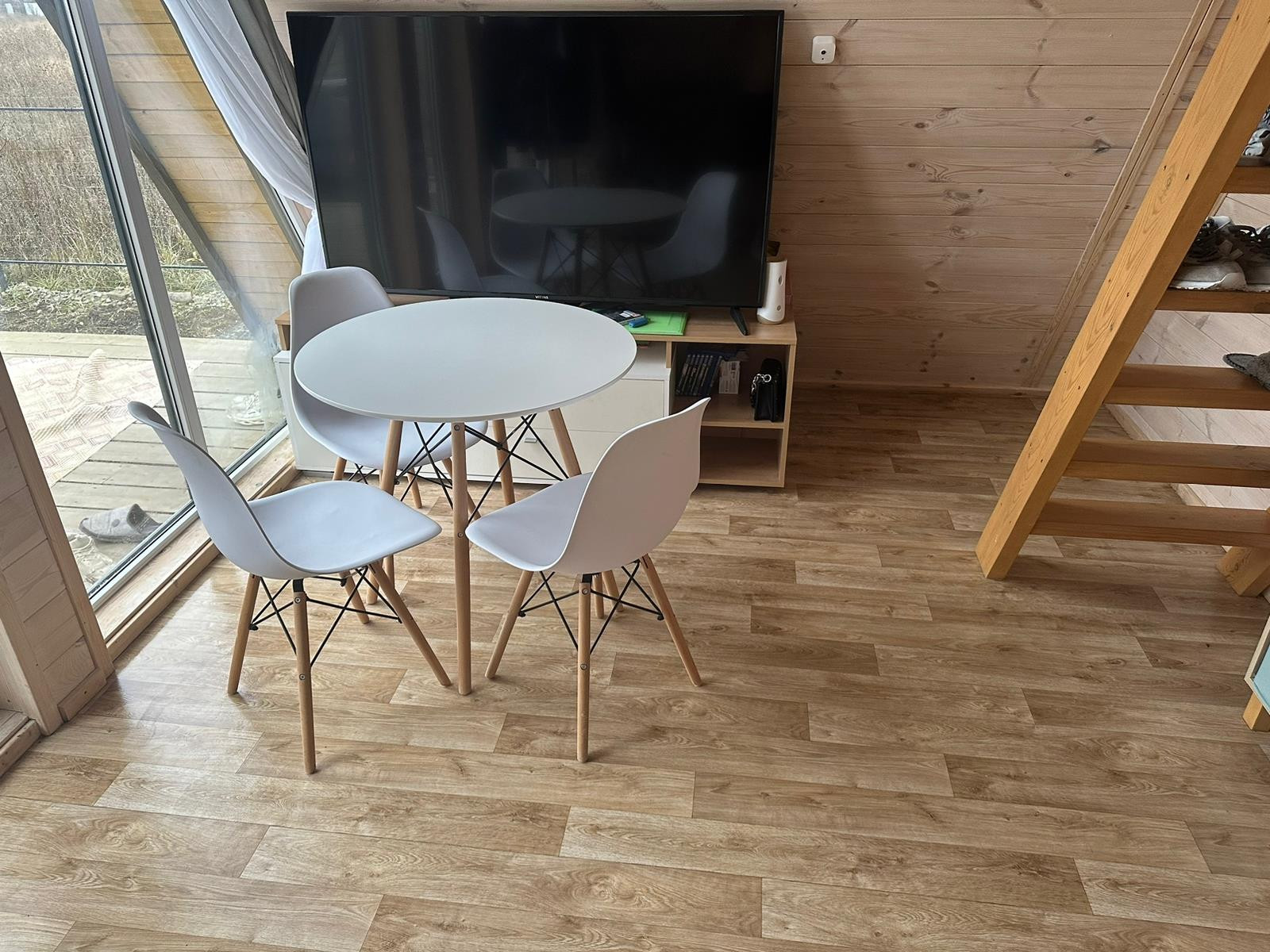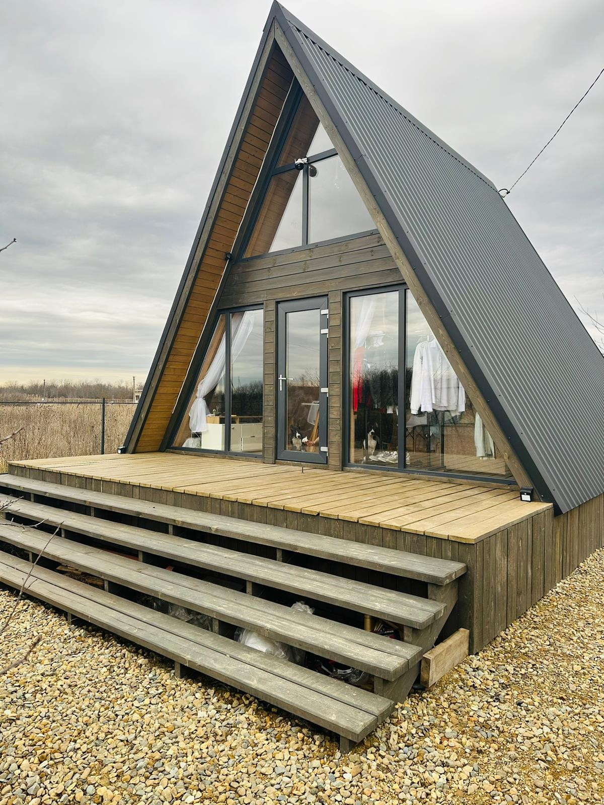 Ночью Домик очень красиво светится, днём очень много света за счёт витражного остекления, дом построен по типу термоса и расположен так что зимой в нём всегда тепло а летом прохладно.