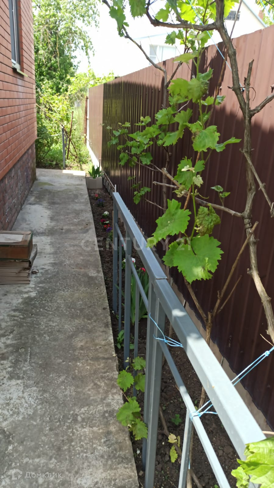Участок ровный, облагороженый. По фасаду установлен металлический забор с калиткой и откатными воротами. На участке растёт 7 плодоносных деревьев.,кусты винограда смородины, малины и очень много клубники.