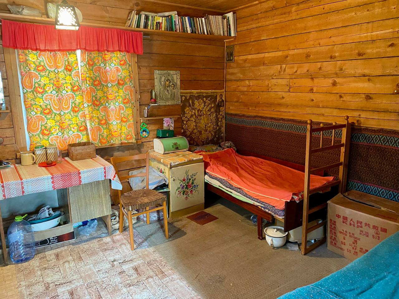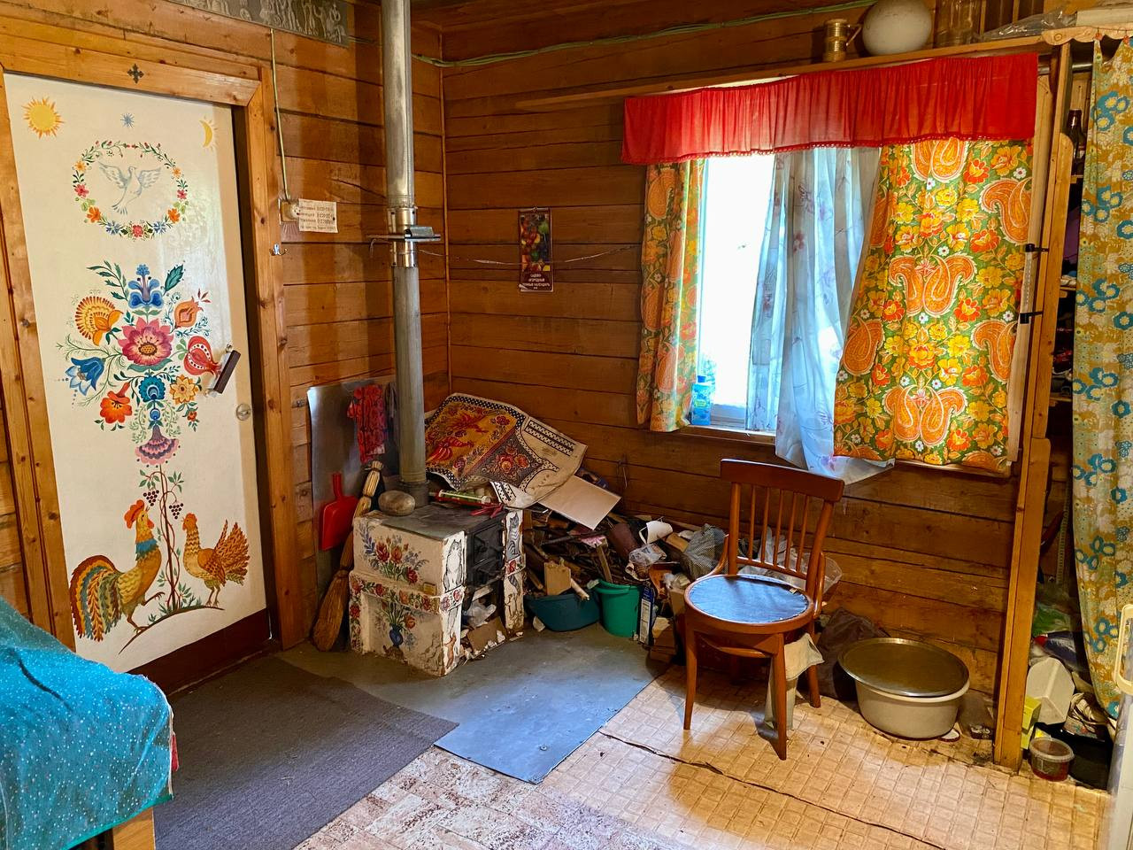 На первом этаже кухня, просторная комната с печью.