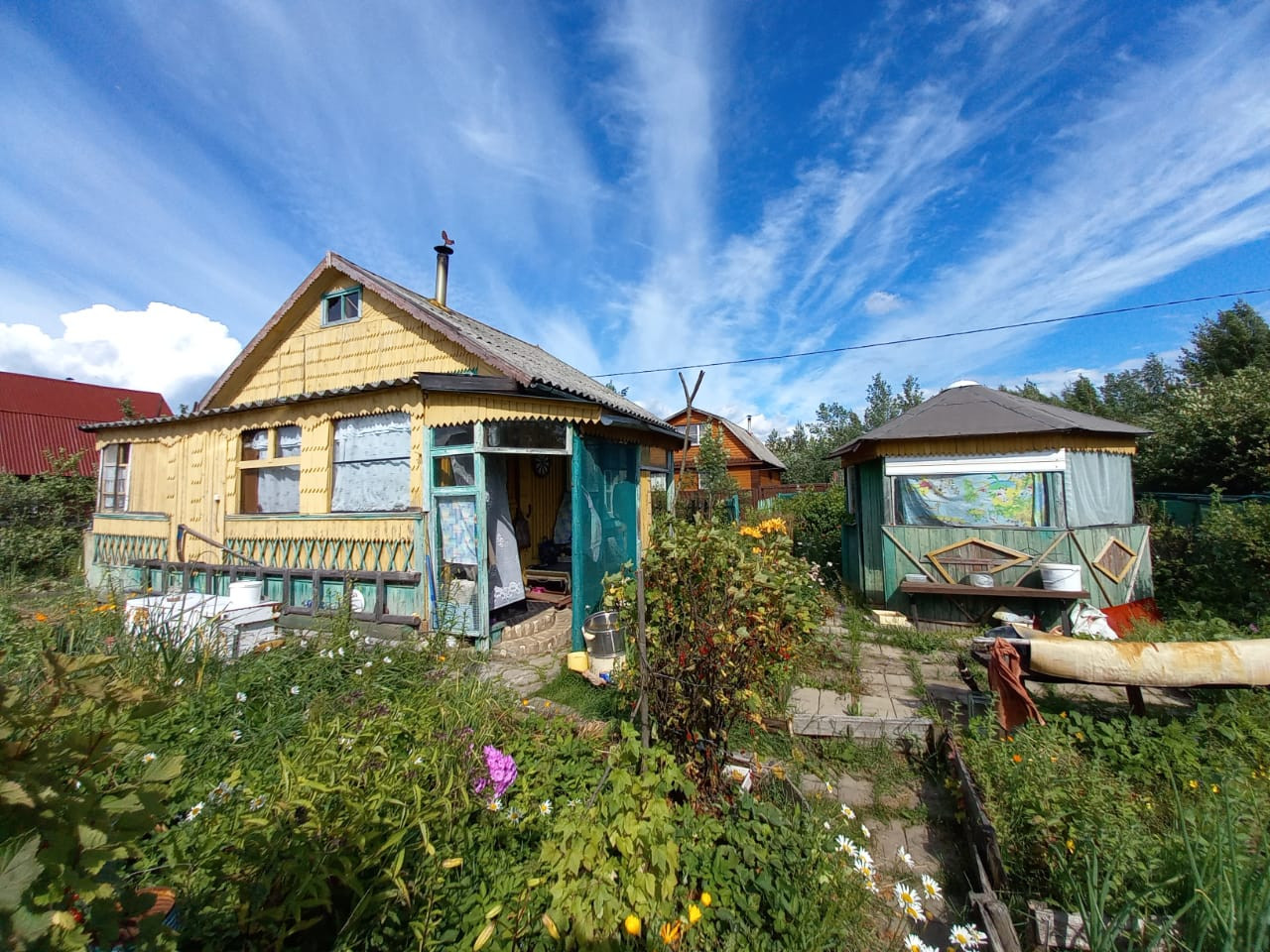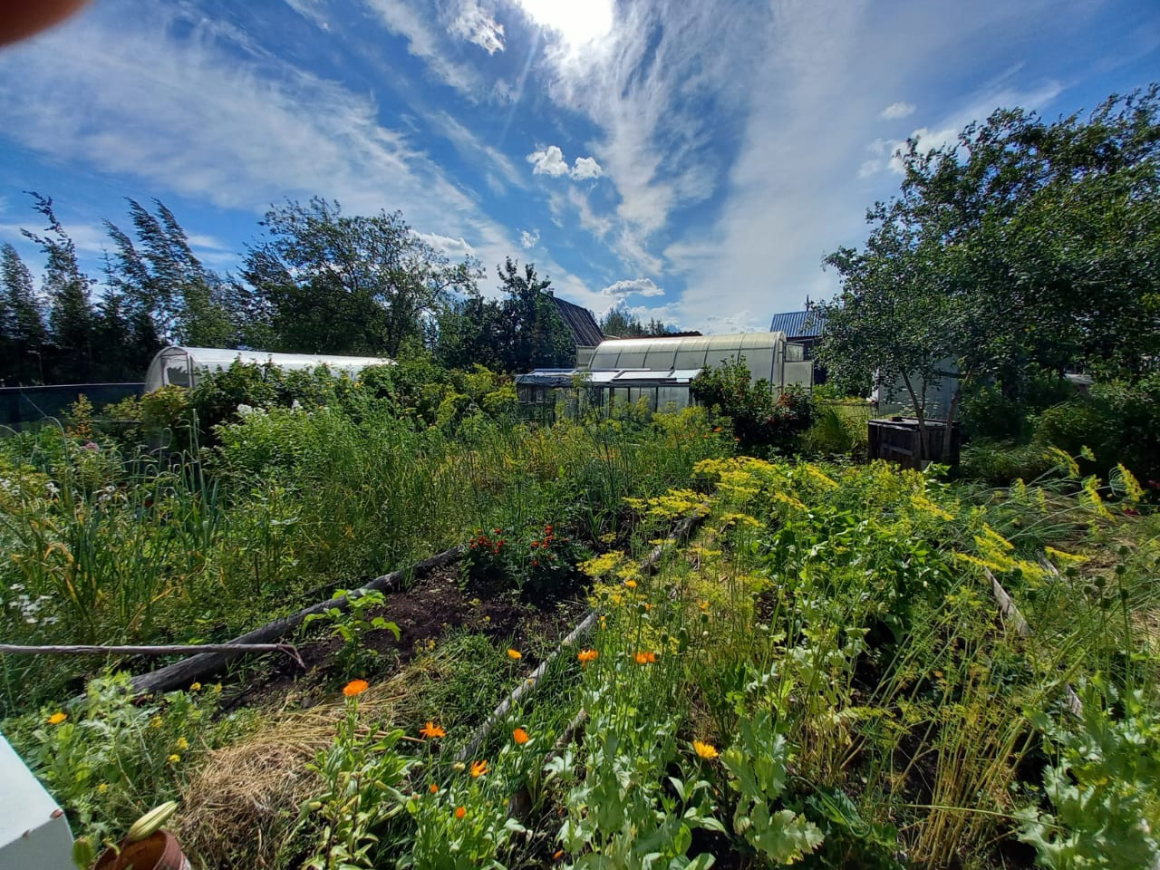 Шикарный ухоженный сад, огород. Три яблони, много кустов малины, смородины красной и черной, крыжовника, грядки с клубникой и земляникой. Очень много зелени.