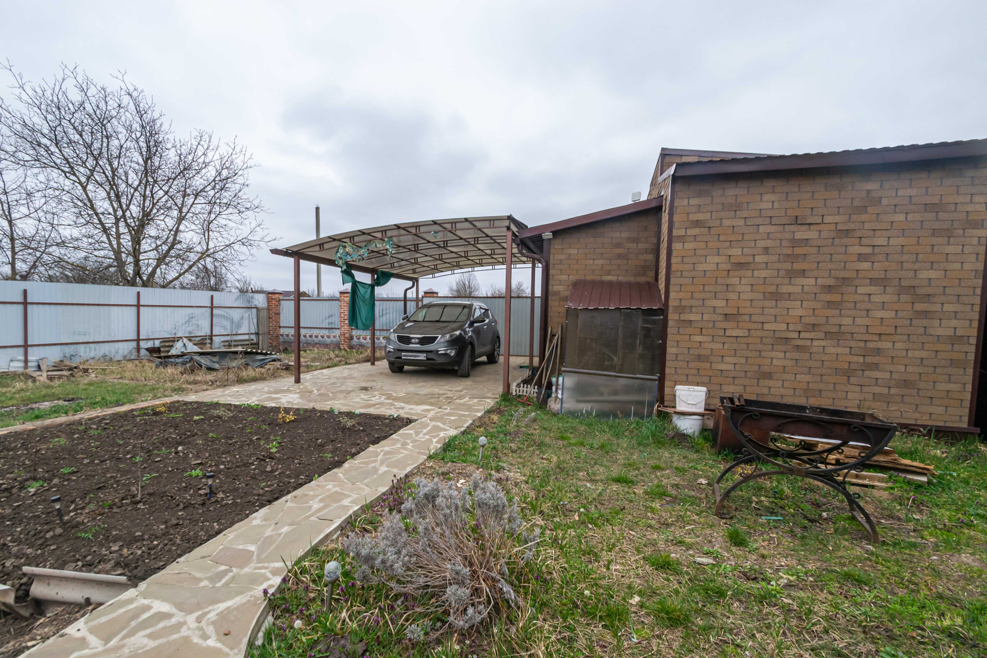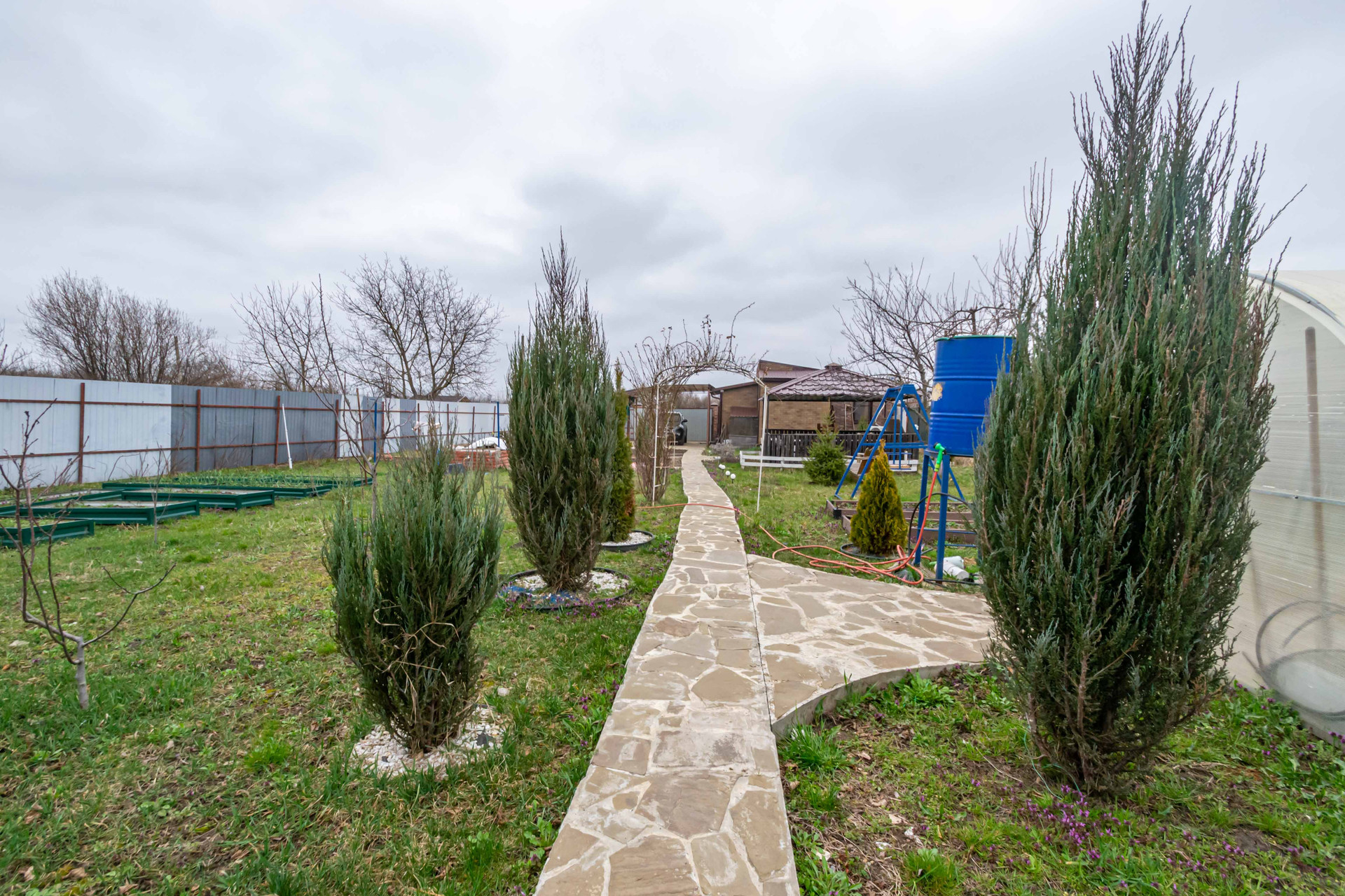 Начну с ворот, они откатные. Большой навес, двор в плитке. На участке декоративная дорожка. Теплица, большая беседка, несколько хоз. построек, два курятника. Так же есть фундамент под строительство ещё одного дома. Вообще участок очень большой, хватит места и для огорода и сада и для развлечений.