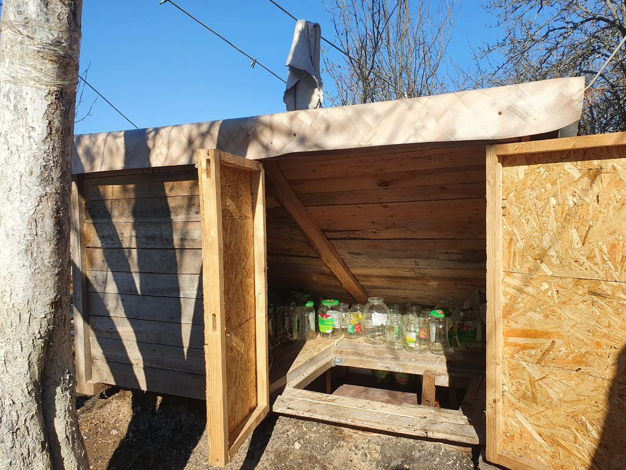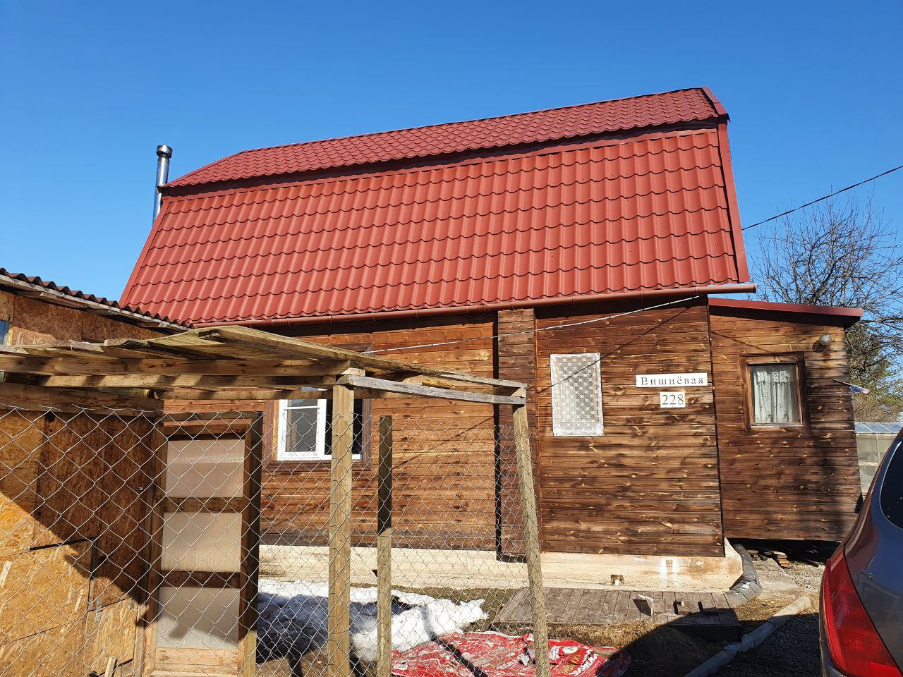 На участке баня, 2 теплицы, погреб высотой 1.5 м для хранения банок, хозяйственные постройки для хранения инвентаря и утепленный курятник, стоянка на 2 автомобиля, плодовые деревья.