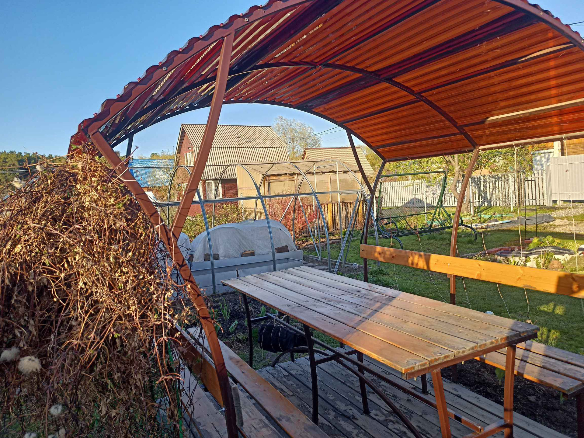 На дачном участке расположен утеплённый деревянный дом. Окна пластиковые, внутри выполнен свежий ремонт, установлены новые межкомнатные и входная двери. Кухонный гарнитур и электроплита приобретены в 2023 году. По периметру дома установлены камеры видеонаблюдения. С помощью приложения в телефоне можно наблюдать за дачей в любое время года круглосуточно. Также на участке расположена баня, беседка, мангальная зона, уличный дровник, две теплицы. Имеются многолетние насаждения - деревья, кустарники, цветы. Наружный забор и ворота построены из металлопрофиля. Парковочное место рассчитано на две машины.