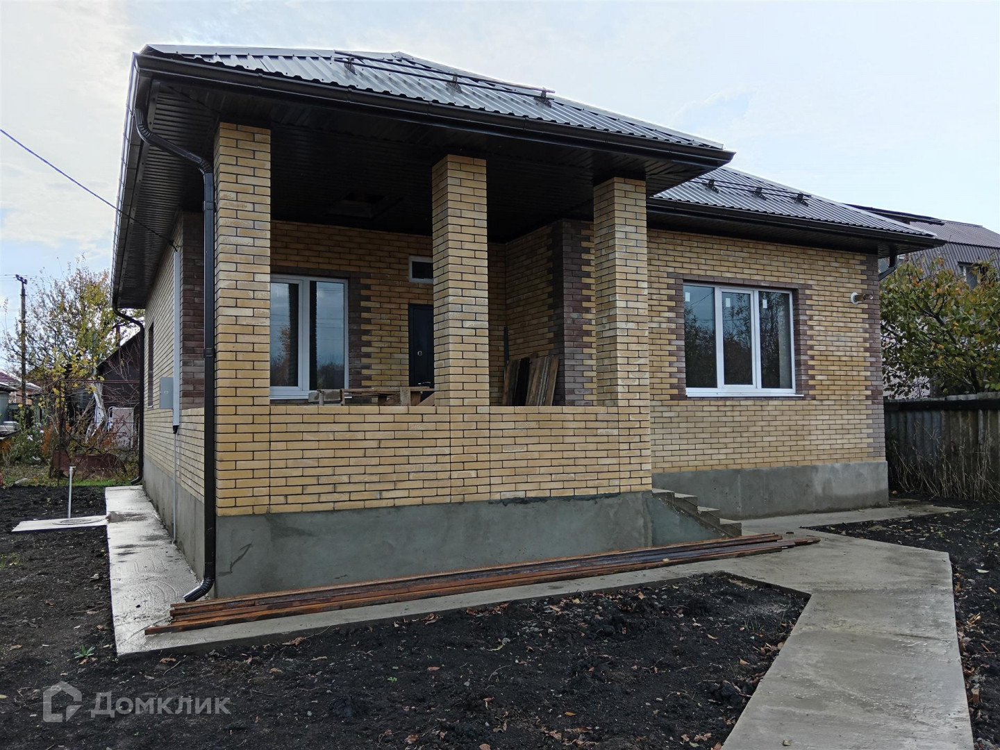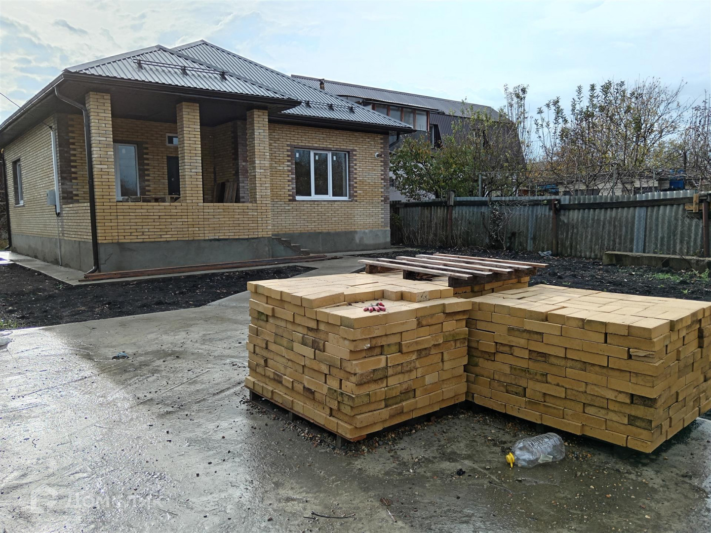По периметру дом огорожен металлопрофильными листами на кирпичных столбах.