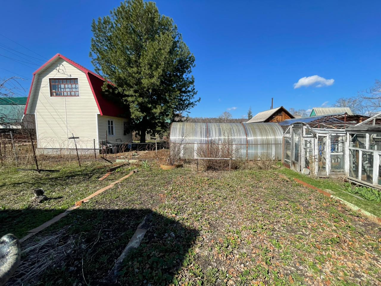 На ровном, прямоугольной формы участке, расположен двухэтажный дом, баня, две теплицы.
